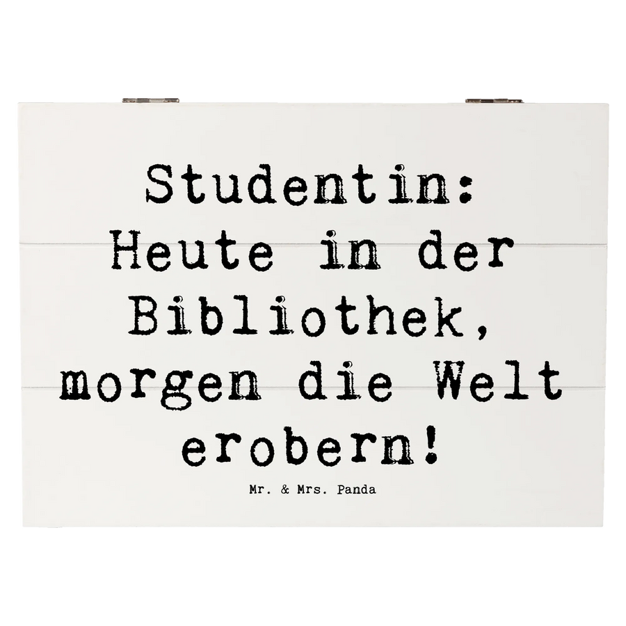 Diese wundervolle Holzkiste von Mr. & Mrs. Panda ist das perfekte Geschenk für jede Studentin! Mit dem inspirierenden Spruch "Heute in der Bibliothek, morgen die Welt erobern!" ist sie nicht nur ein schöner Blickfang, sondern auch eine praktische Aufbewahrungsbox für all ihre wertvollen Erinnerungen und Schätze.