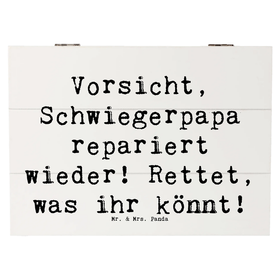 Die wunderschöne Holzkiste "Vorsicht, Schwiegerpapa repariert wieder! Rettet, was ihr könnt!" von Mr. & Mrs. Panda ist das perfekte Geschenk für all die großartigen Schwiegerpapas da draußen!