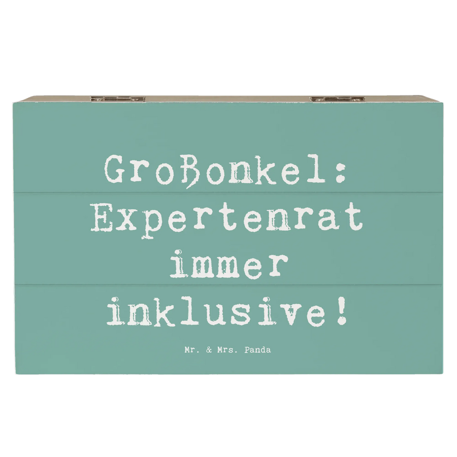 Die Holzkiste "Großonkel" von Mr. & Mrs. Panda ist das perfekte Geschenk für jeden Großonkel, der in der Familie eine besondere Rolle spielt. Mit einem liebevollen Spruch, der festhält: "Großonkel: Expertenrat immer inklusive!", wird diese Kiste zum wahren Schatz für wundervolle Erinnerungen.