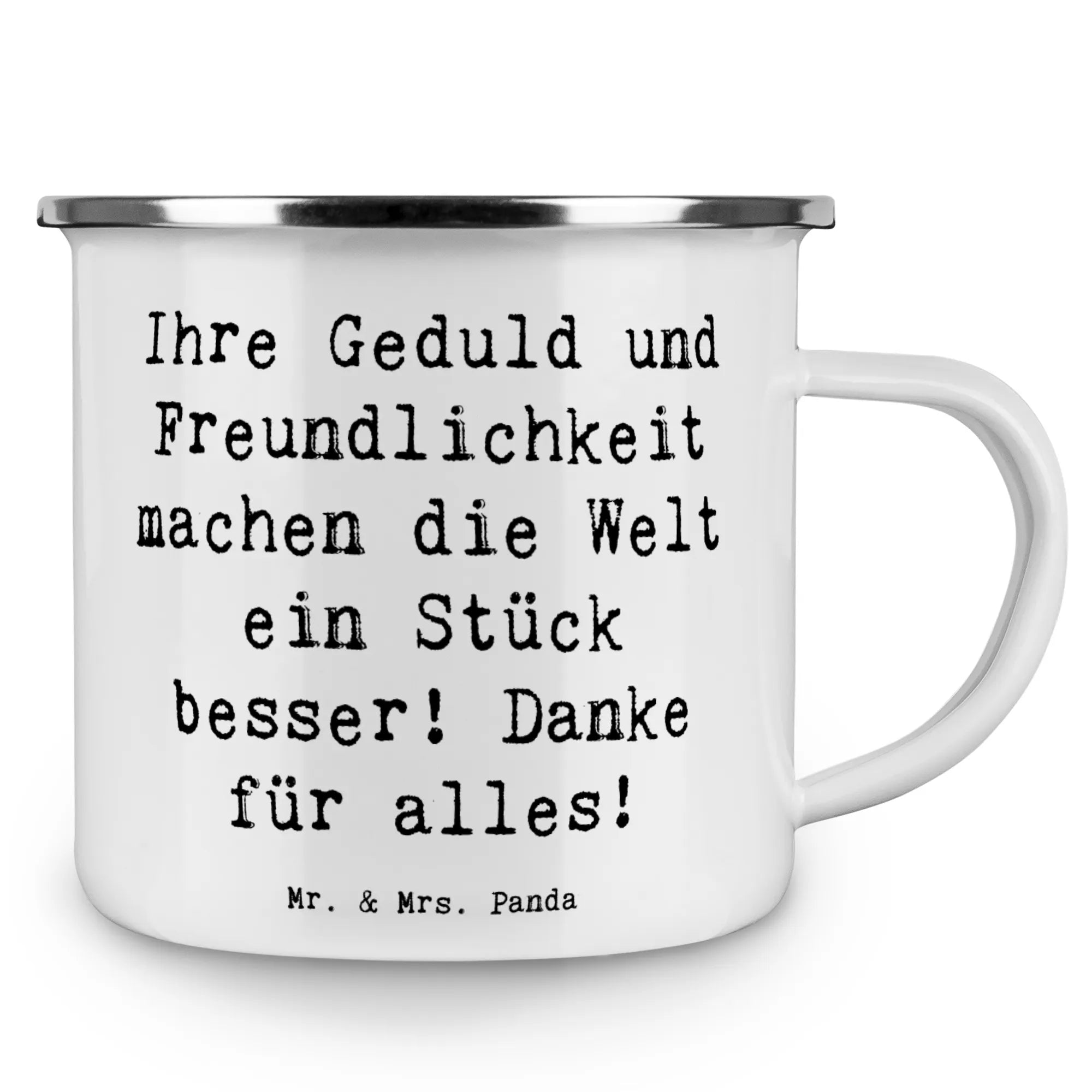 Die Camping Emaille Tasse Erzieher aus der Dankes-Kollektion von Mr. & Mrs. Panda ist das perfekte Geschenk für alle, die Erzieher sind oder in der Bildung arbeiten. Diese Tasse ist nicht nur praktisch, sondern bringt auch eine wertvolle Botschaft mit sich. Mit dem Spruch "Ihre Geduld und Freundlichkeit machen die Welt ein Stück besser! Danke für alles!" zeigt ihr eure Wertschätzung auf besondere Art.