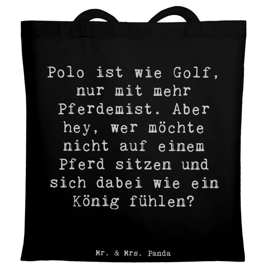 Du suchst ein Geschenk mit Herz und Humor? Unsere schwarze Tragetasche mit dem frechen Spruch „Polo ist wie Golf, nur mit mehr Pferdemist. Aber hey, wer möchte nicht auf einem Pferd sitzen und sich dabei wie ein König fühlen?“ ist ein echter Blickfänger – perfekt für alle, die Pferdesport lieben oder einfach gern augenzwinkernd auftreten.