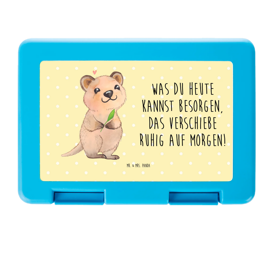 Diese fröhliche Lunchbox macht jede Pause zum kleinen Highlight. Das liebevoll illustrierte Quokka mit seinem zauberhaften Lächeln, dem grünen Blatt und dem rosa Herz verbreitet gute Laune — und der verspielte Spruch „Was du heute kannst besorgen, das verschiebe ruhig auf morgen!“ sorgt für ein Augenzwinkern bei Groß und Klein.
