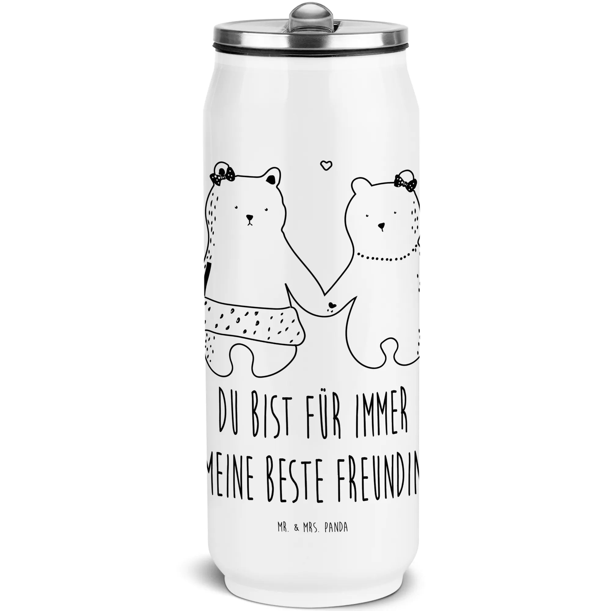 Entdecke die wunderschöne Edelstahl Getränkedosen Trinkflasche von Mr. & Mrs. Panda, die perfekt für alle Tierliebhaber und Freundinnen ist! Mit dem bezaubernden Motiv "Bär Freundin" zieht diese Flasche garantiert die Blicke auf sich. Die zwei süßen Bärenmädchen, die sich an den Händen halten, symbolisieren eine wertvolle Freundschaft und bringen Freude in jeden Alltag.