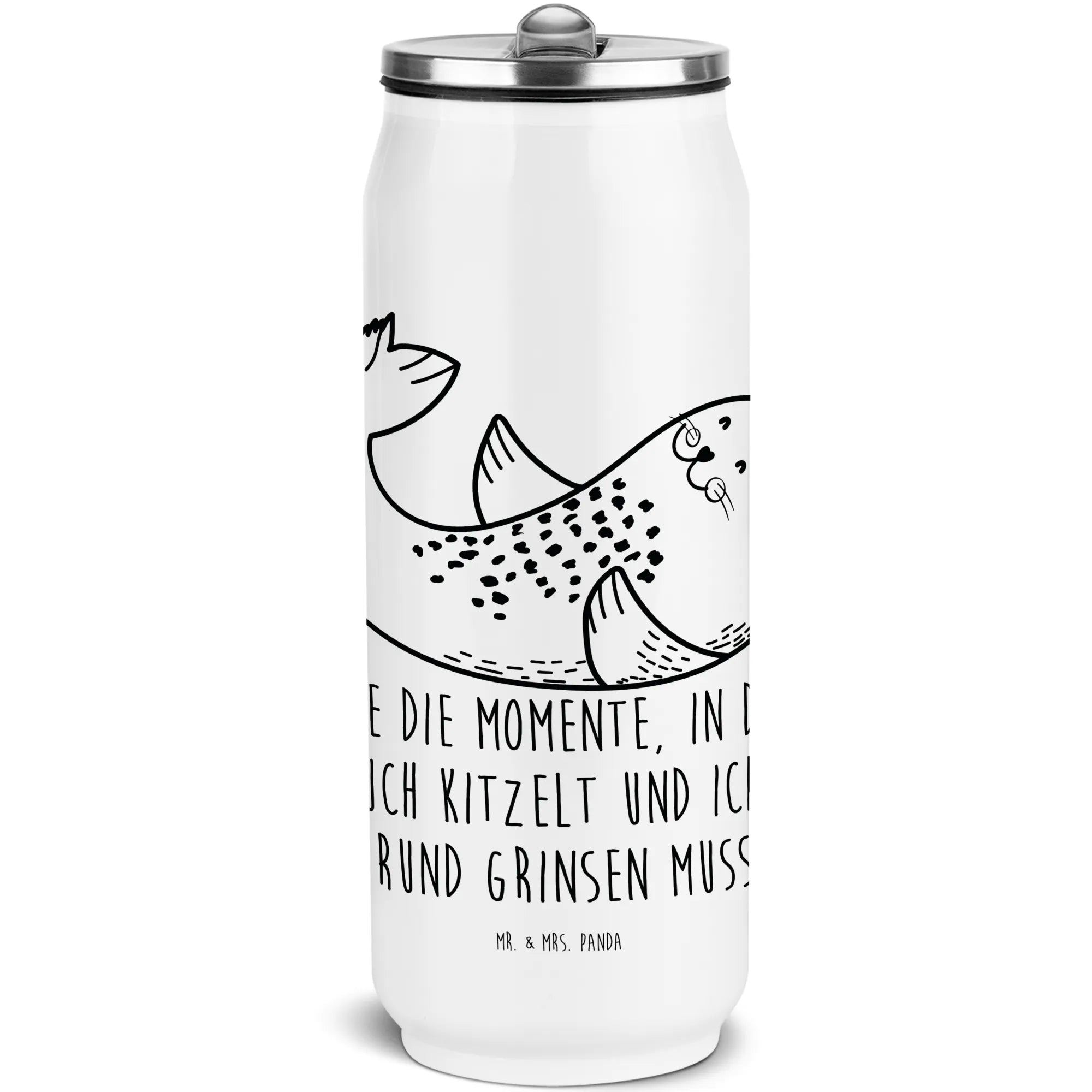 Entdecke die wunderbare Getränkedosen Trinkflasche mit dem niedlichen Motiv einer liegenden Robbe aus der Small World Kollektion von Mr. & Mrs. Panda! Diese hochwertige, doppelwandige Edelstahlflasche vereint nicht nur Funktionalität, sondern sorgt auch für gute Laune, wo immer Du bist. Ob beim Ausflug an die Nordsee oder beim entspannten Tag am Strand – diese Flasche wird Dein treuer Begleiter.