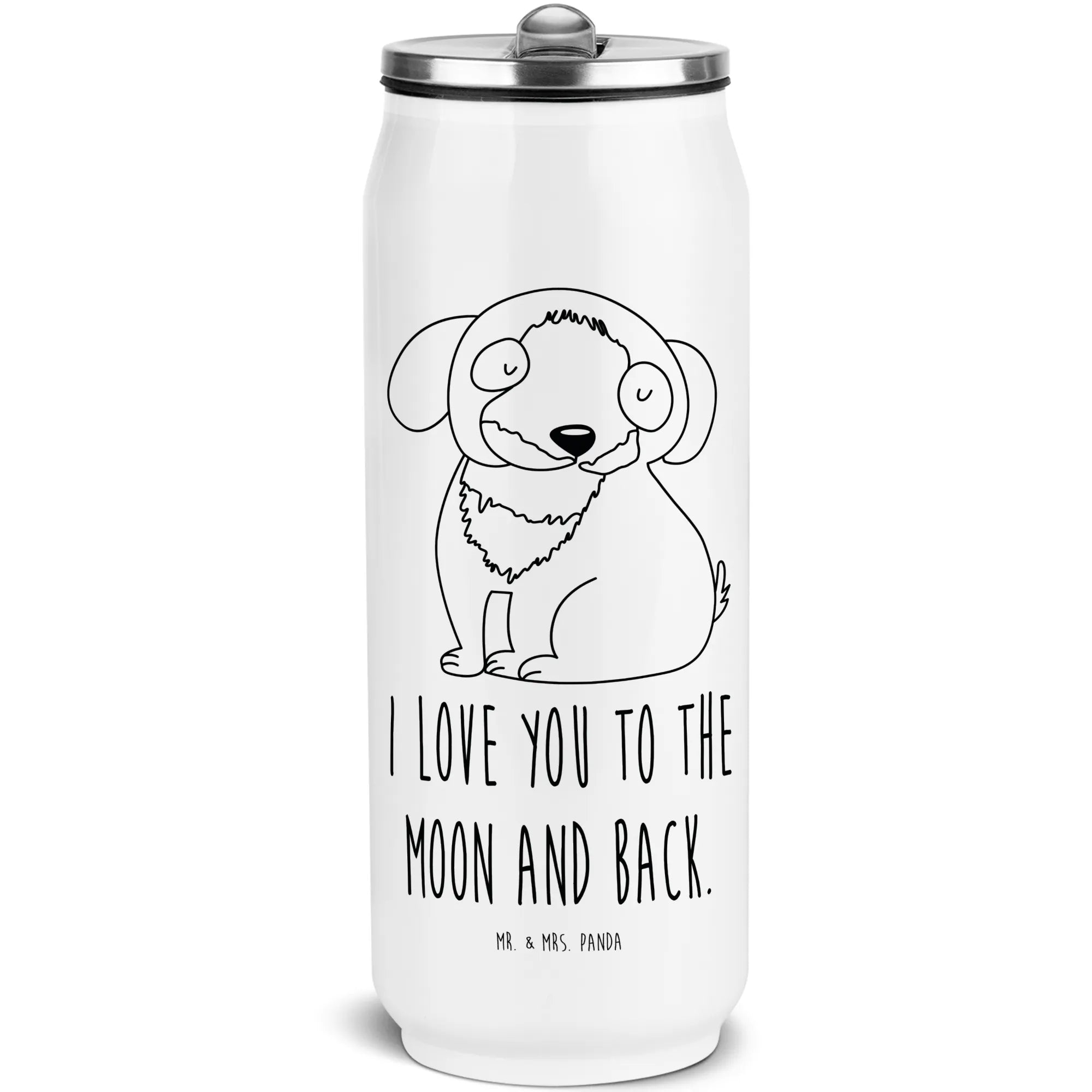Die Edelstahl Getränkedosen Trinkflasche "Hund entspannt" von Mr. & Mrs. Panda ist das perfekte Geschenk für jeden Hundeliebhaber! Mit ihrem bezaubernden Design, das einen süßen, schwarz-weißen Hund zeigt, und dem liebevollen Slogan "I love you to the moon and back" bringt sie Freude in den Alltag.