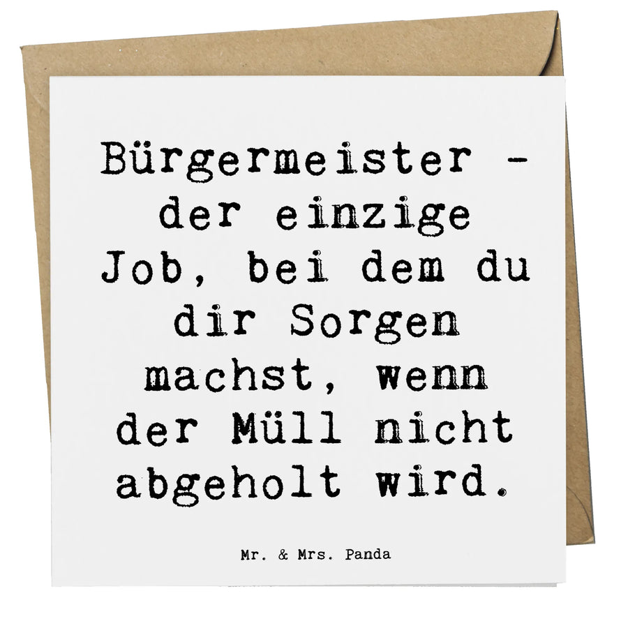 Mit ihrem liebevoll gestalteten Motiv und dem humorvollen Slogan "Bürgermeister - der einzige Job, bei dem du dir Sorgen machst, wenn der Müll nicht abgeholt wird", bringt die Karte nicht nur ein Lächeln ins Gesicht, sondern sorgt auch für ein Loblied auf die Arbeit der Bürgermeister!