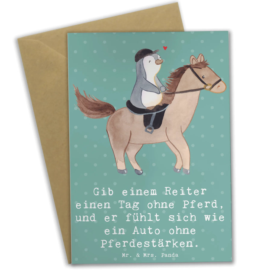 Eine wunderschöne Grußkarte von Mr. & Mrs. Panda, die perfekt für alle Reitsportliebhaber geeignet ist! Mit dem Motto "Gib einem Reiter einen Tag ohne Pferd, und er fühlt sich wie ein Auto ohne Pferdestärken." ist diese Karte eine liebevolle Art, die Leidenschaft für den Reitsport auszudrücken.