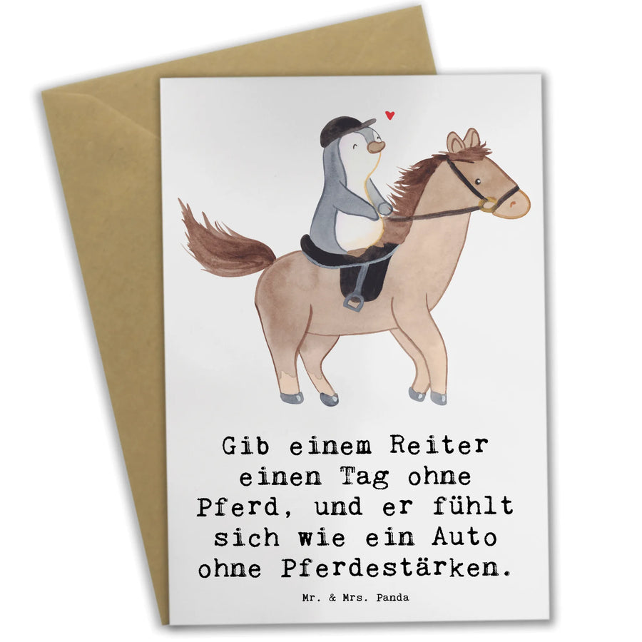 Eine wunderschöne Grußkarte von Mr. & Mrs. Panda, die perfekt für alle Reitsportliebhaber geeignet ist! Mit dem Motto "Gib einem Reiter einen Tag ohne Pferd, und er fühlt sich wie ein Auto ohne Pferdestärken." ist diese Karte eine liebevolle Art, die Leidenschaft für den Reitsport auszudrücken.