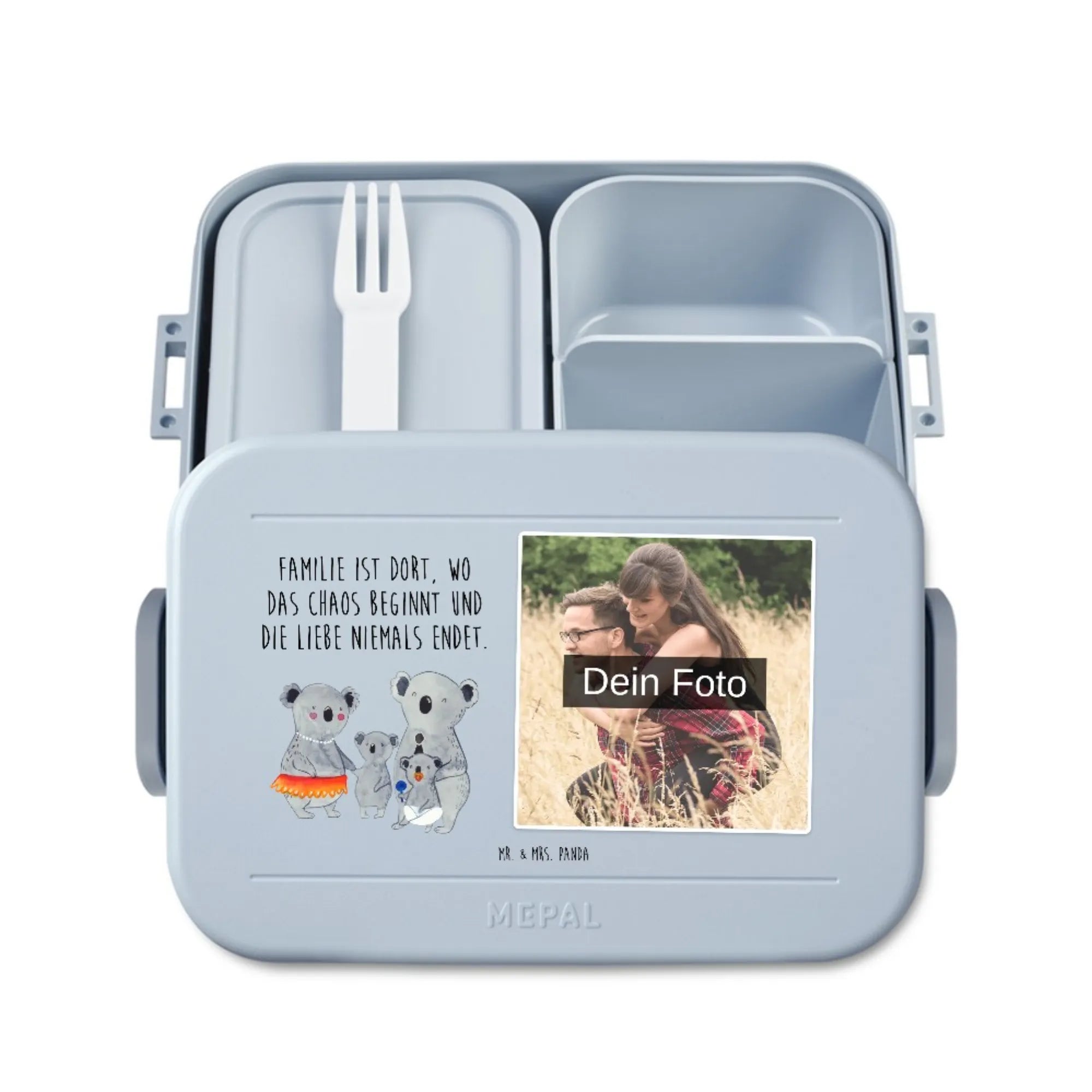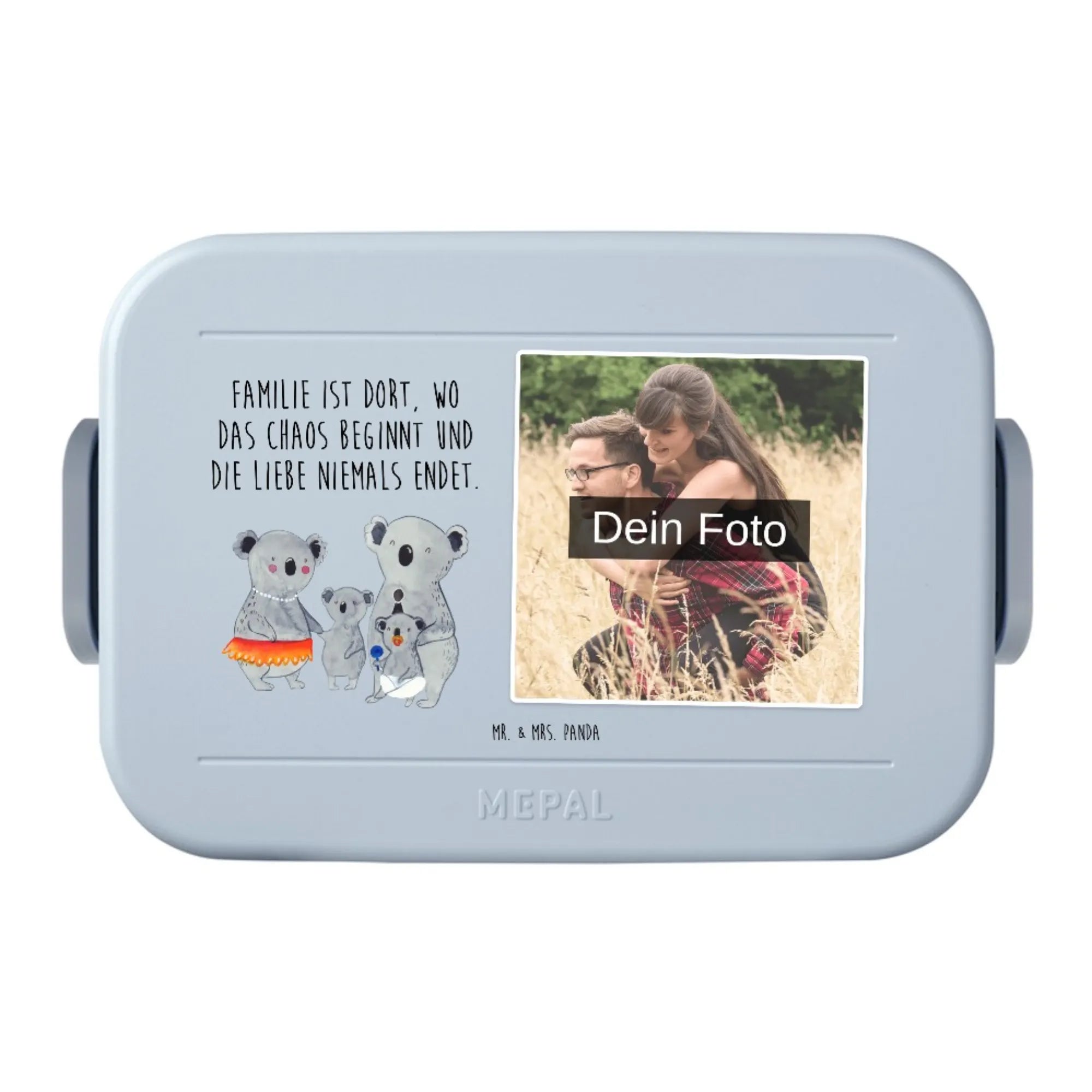 MEPAL Foto Bentobox – Koala Familie 🐨💚 Aus der liebevollen Familie-Kollektion von Mr. & Mrs. Panda kommt diese personalisierbare Foto Lunchbox, die Herz und Alltag verbindet. Auf der Vorderseite lächelt eine fröhliche Koala-Familie, die Geborgenheit und Familienglück ausstrahlt – begleitet vom Spruch: „Familie ist dort, wo das Chaos beginnt und die Liebe niemals endet.“