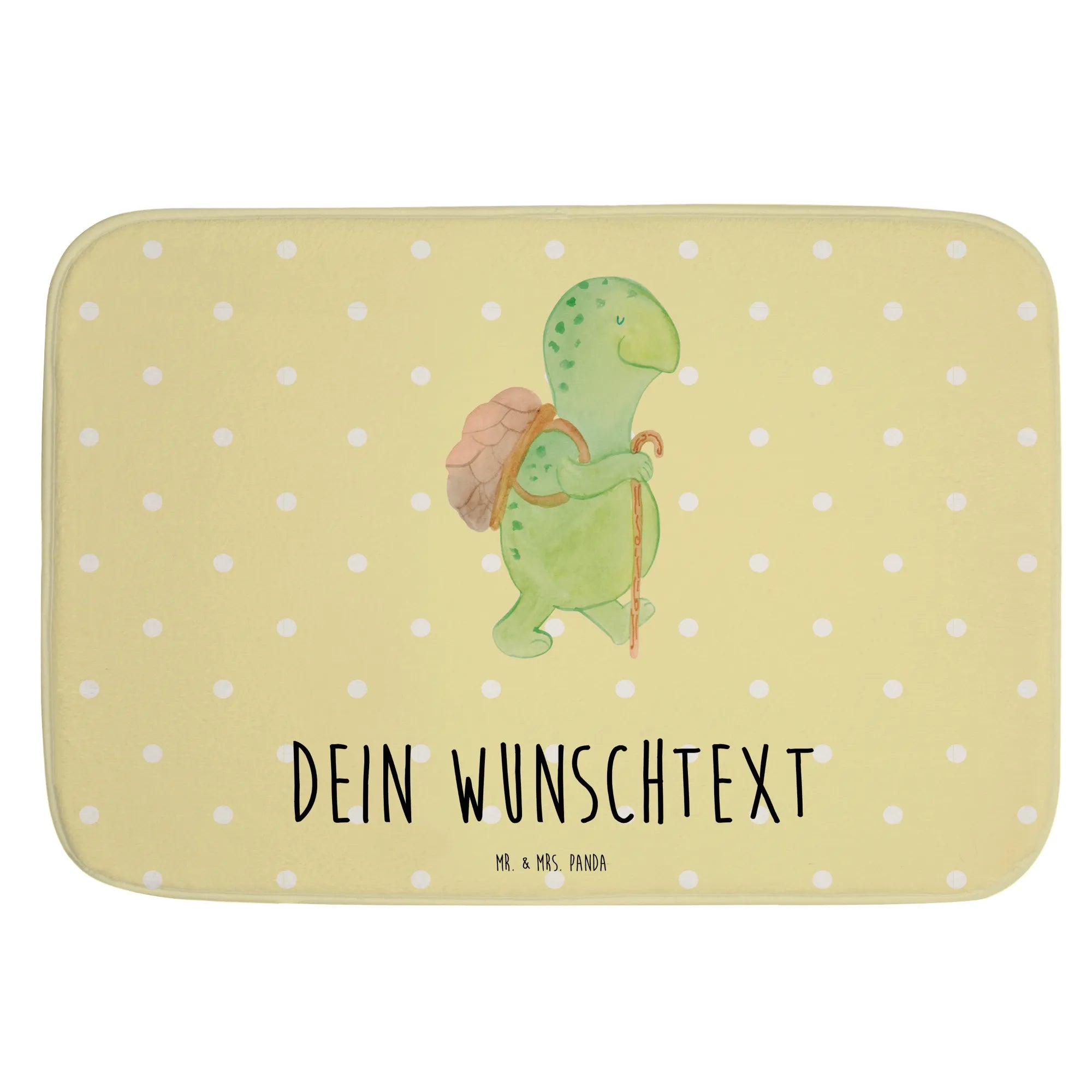Der personalisierte Badvorleger "Schildkröte Wanderer" von Mr. & Mrs. Panda ist das perfekte Geschenk für alle, die ihrem Badezimmer einen Hauch von Persönlichkeit und Stil verleihen möchten. Mit seinem niedlichen Motiv einer Schildkröte, die ihren Panzer als kleinen Rucksack trägt, spricht dieser Badvorleger nicht nur Kinder, sondern auch Erwachsene an.