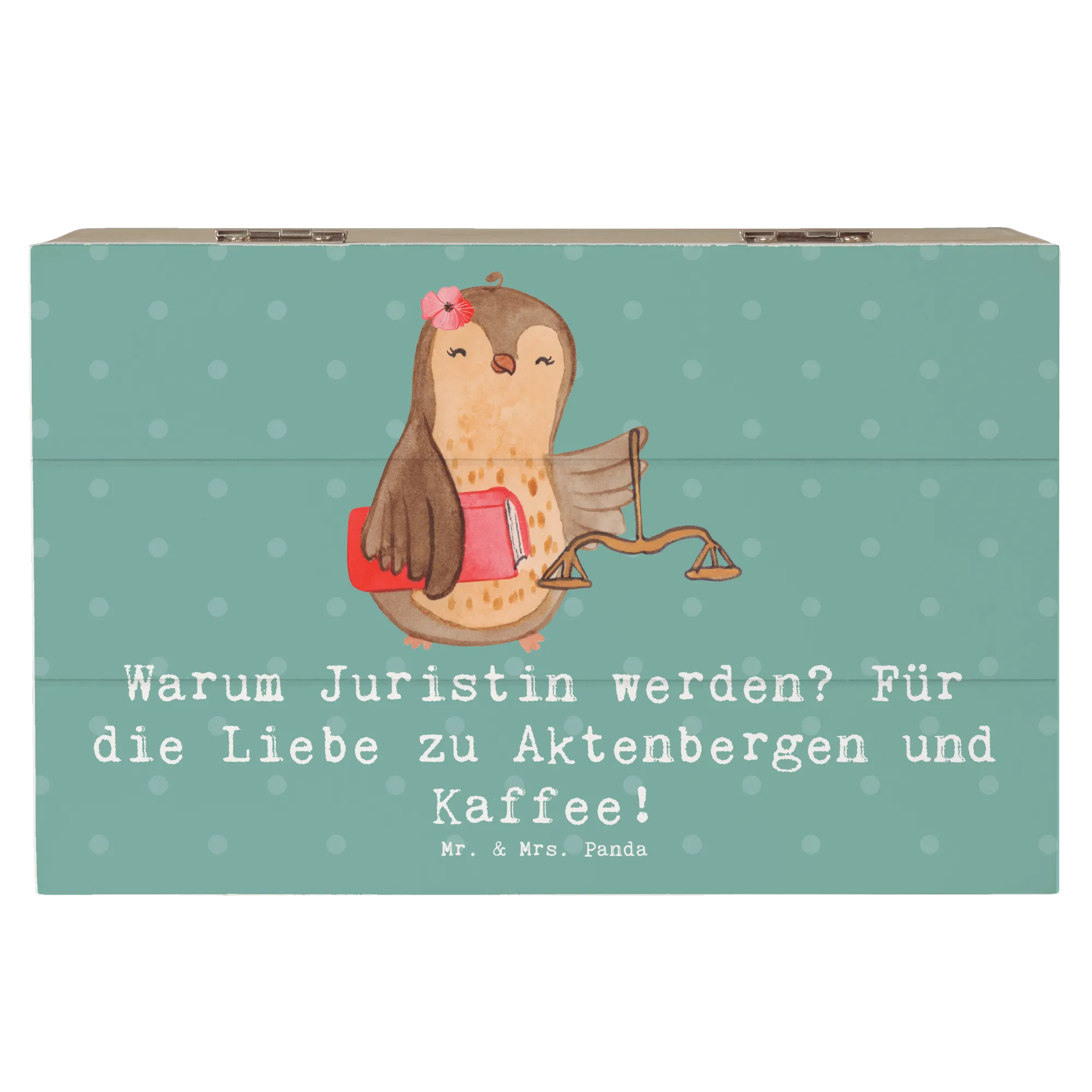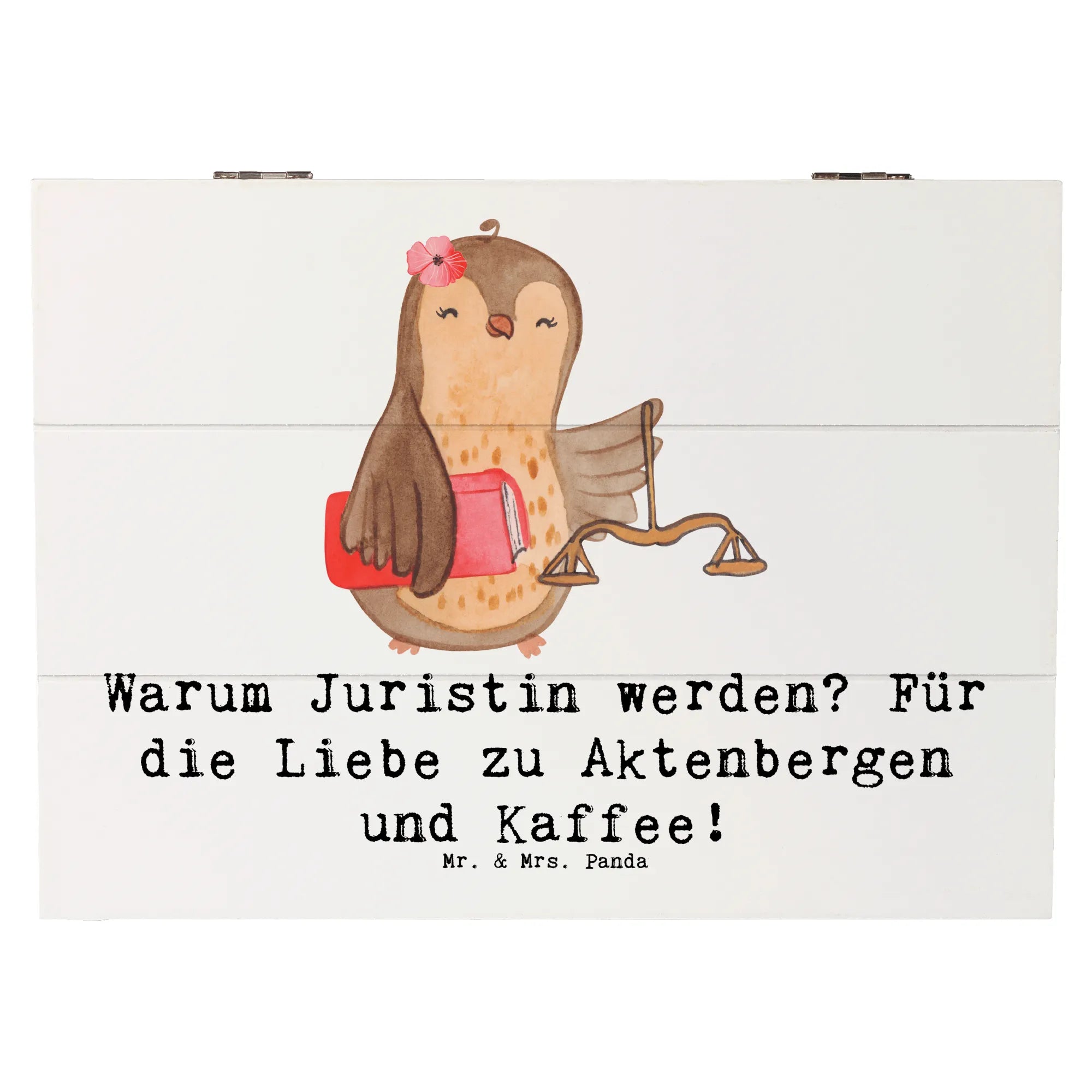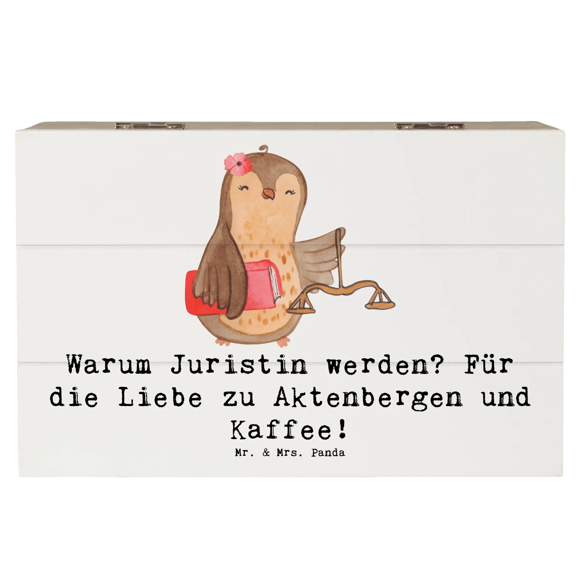 Die Holzkiste Juristin von Mr. & Mrs. Panda ist das perfekte Geschenk für alle, die im juristischen Bereich tätig sind oder eine Leidenschaft für das Recht haben. Diese wunderschöne Kiste ist nicht nur ein Aufbewahrungsort für wertvolle Erinnerungen, sondern auch ein liebevolles Accessoire, das die Liebe zu Aktenbergen und Kaffee mit einem humorvollen Slogan feiert: "Warum Juristin werden? Für die Liebe zu Aktenbergen und Kaffee!"