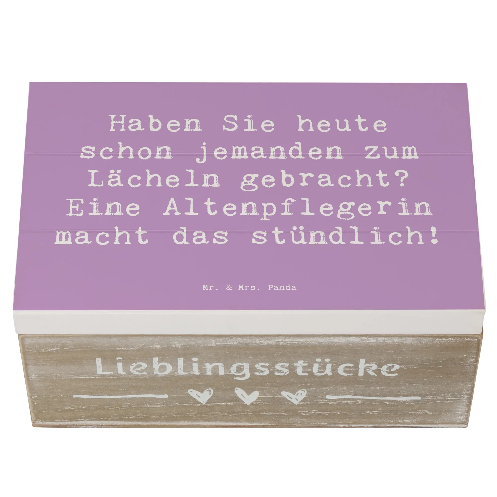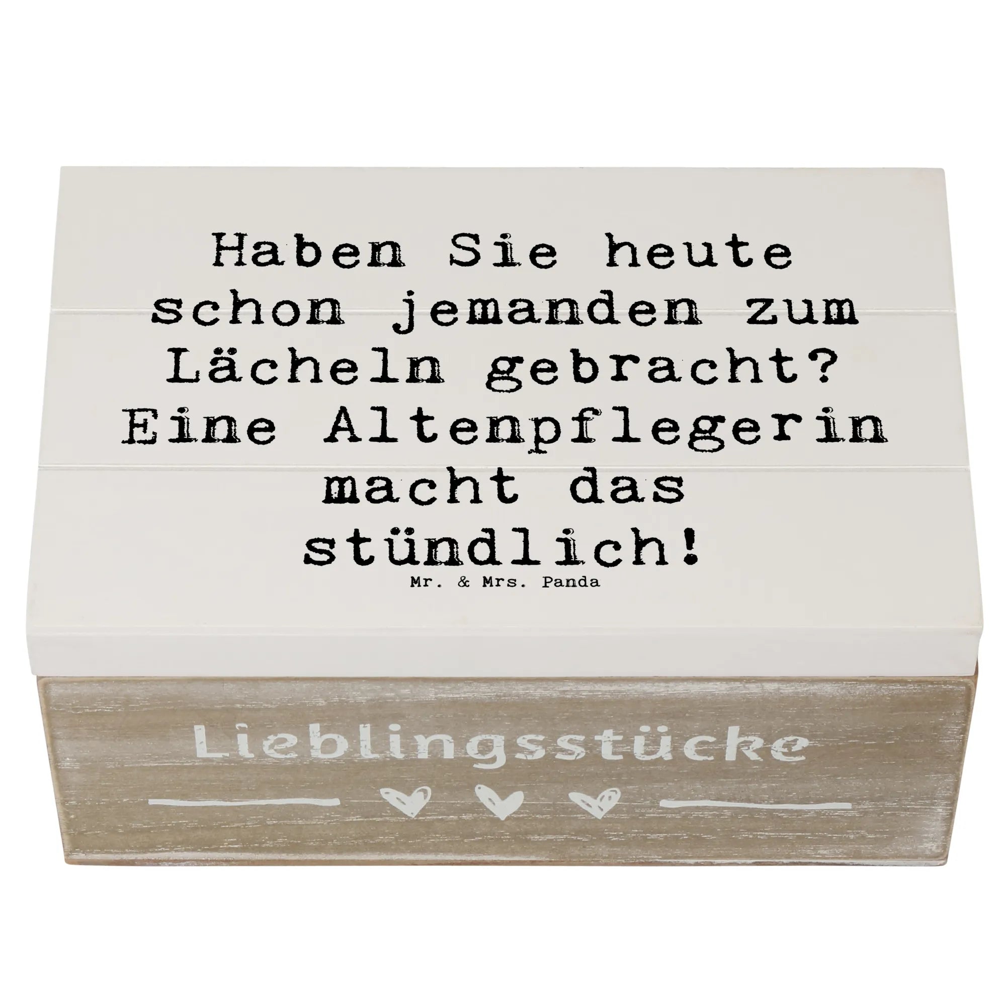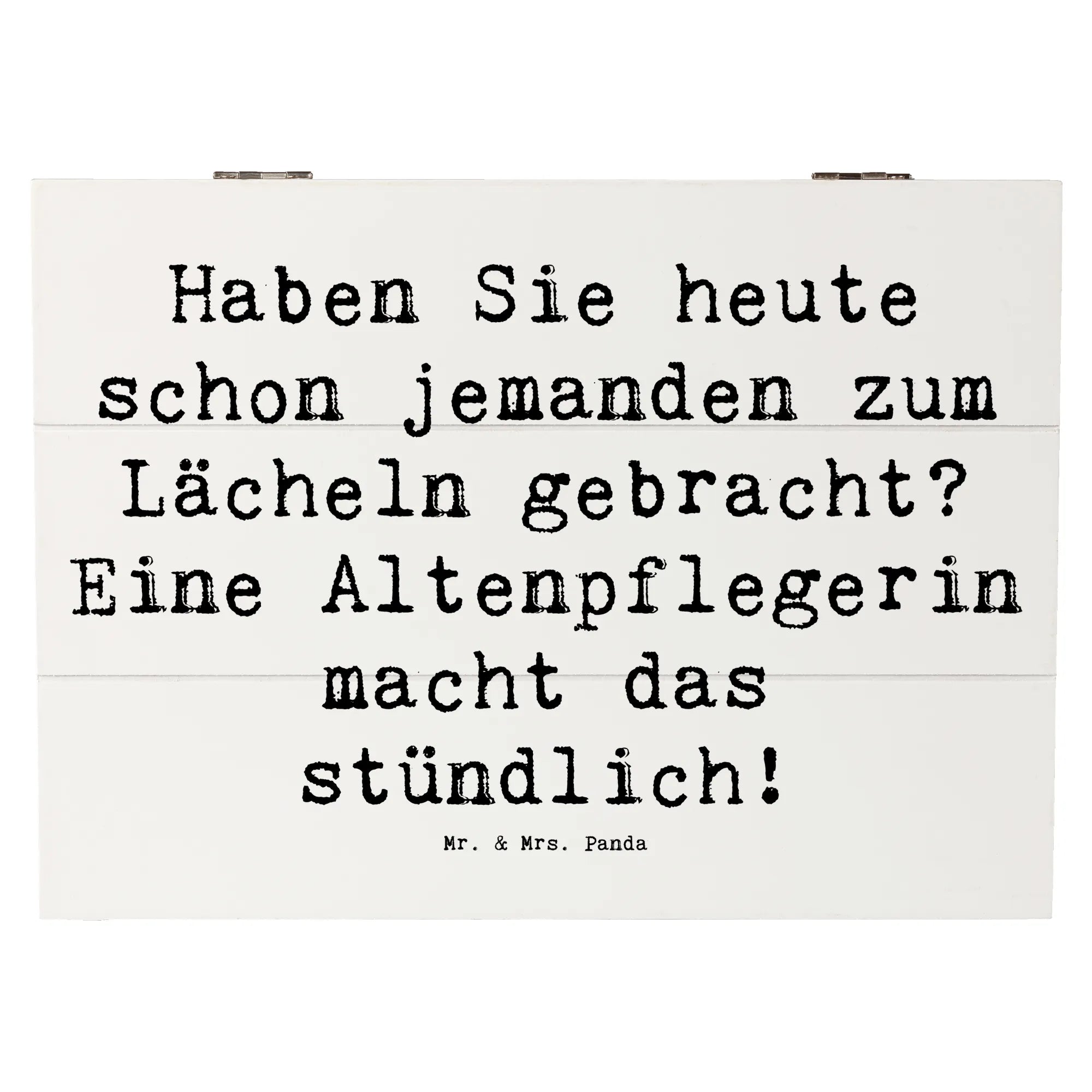 Eine Holzkiste mit Herz: Die Holzkiste Altenpflegerin aus der Mr. & Mrs. Panda Berufe-Kollektion ist das perfekte Geschenk für Pflegekräfte, Kolleginnen und Freundinnen. Bedruckt mit dem liebevollen Spruch „Haben Sie heute schon jemanden zum Lächeln gebracht? Eine Altenpflegerin macht das stündlich!“ drückt sie Wertschätzung und Dankbarkeit auf eine charmante Art aus.