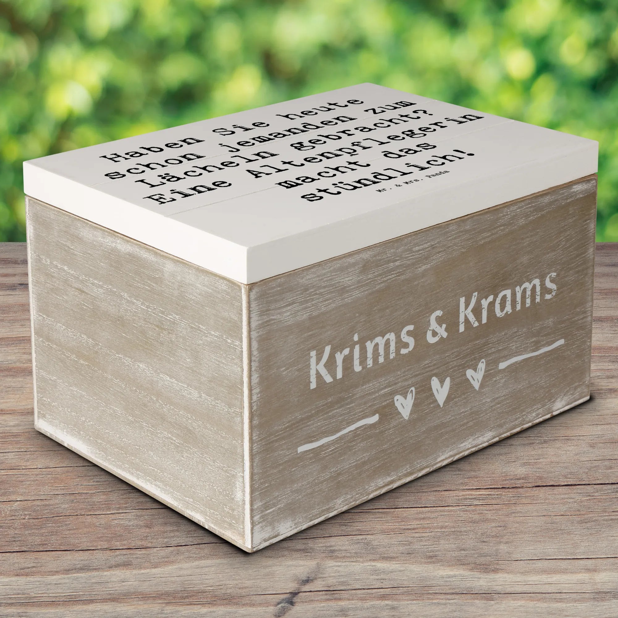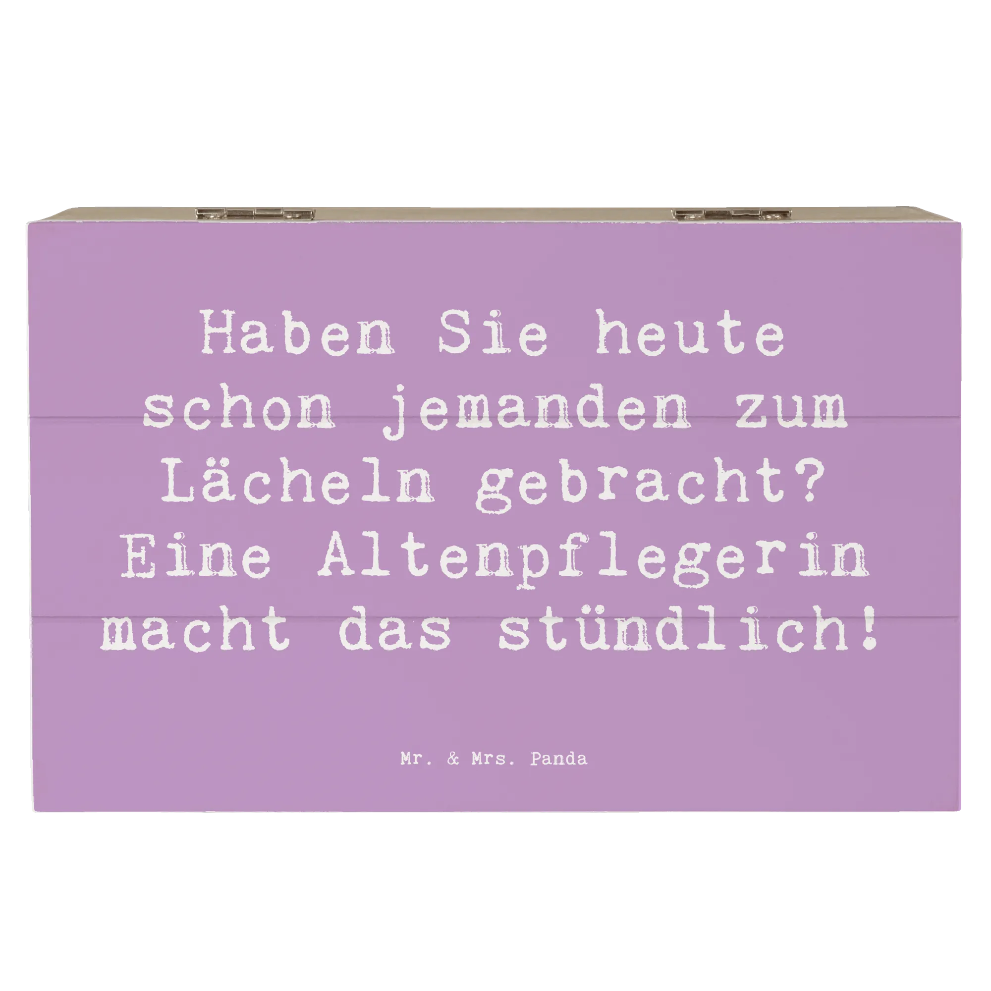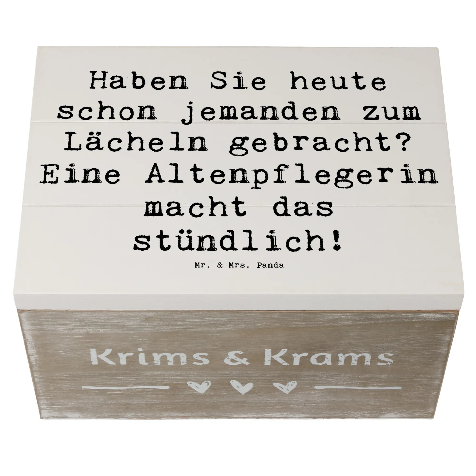 Mit dem liebevollen Spruch „Haben Sie heute schon jemanden zum Lächeln gebracht? Eine Altenpflegerin macht das stündlich!“ wird diese Holzkiste zu einem perfekten Highlight auf jedem Arbeitsplatz oder im privaten Raum. Die Kiste ist nicht nur ein schöner Blickfang, sondern auch ideal zum Aufbewahren von kleinen Schätzen wie Fotos, Erinnerungen oder anderen wertvollen Dingen.