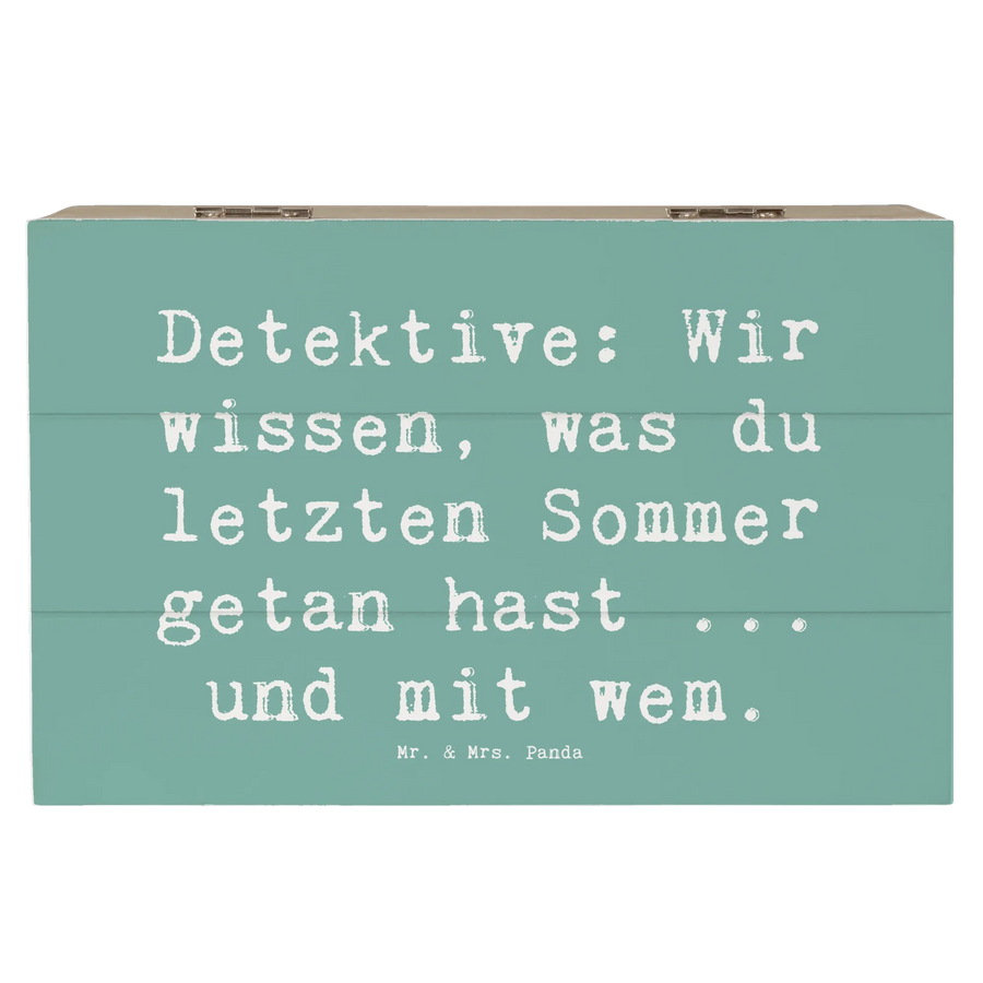 Die Kiste trägt den Spruch 'Detektive: Wir wissen, was du letzten Sommer getan hast ... und mit wem.', der jedem Detektiv und jeder Detektivin ein Lächeln ins Gesicht zaubert. Ideal für Kinder und Erwachsene, die Spaß an Abenteuer und Rätseln haben.