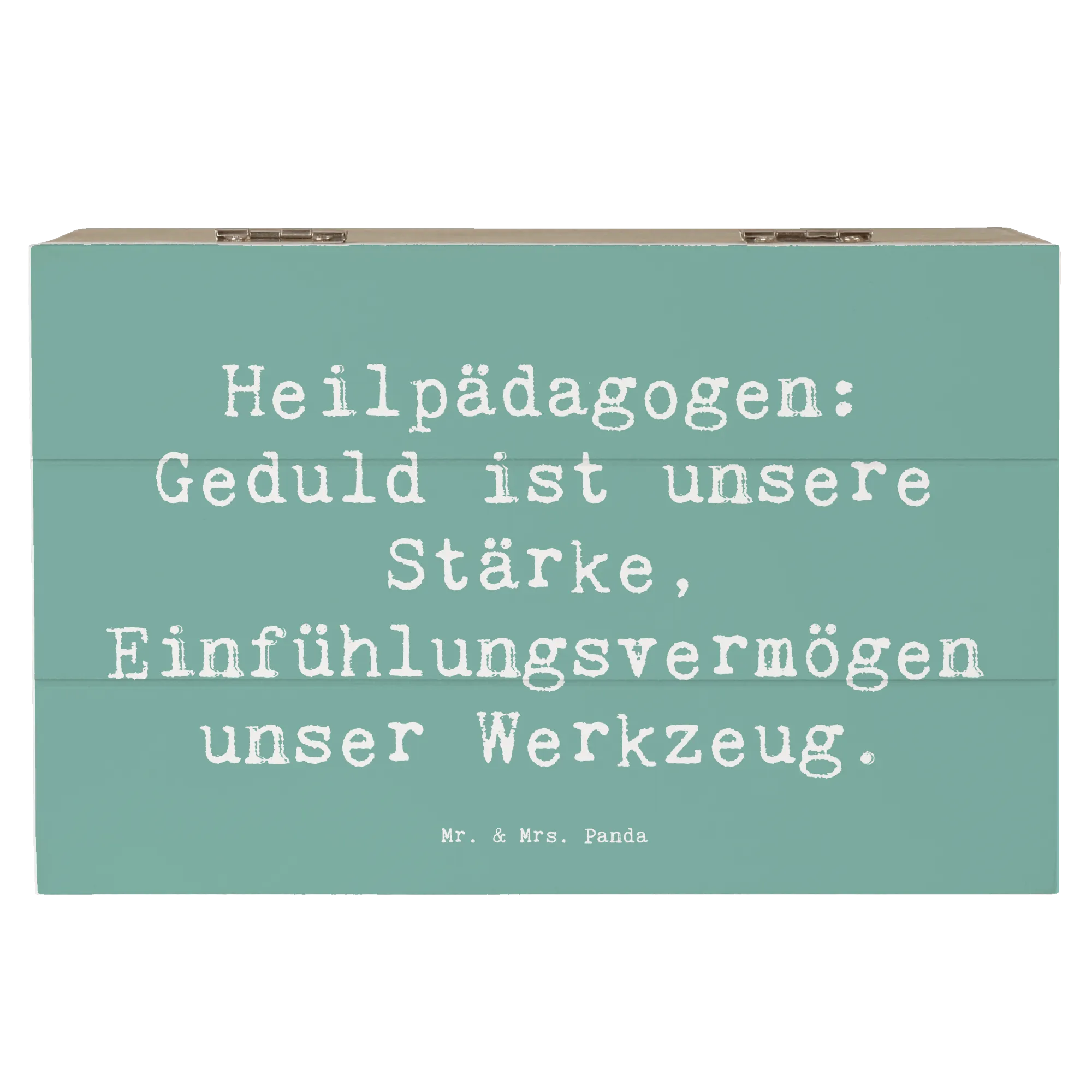 Die besondere Note der Kiste ist der liebevolle Spruch "Heilpädagogen: Geduld ist unsere Stärke, Einfühlungsvermögen unser Werkzeug." – perfekt für diejenigen, die ihr Engagement für diesen Beruf zeigen möchten.