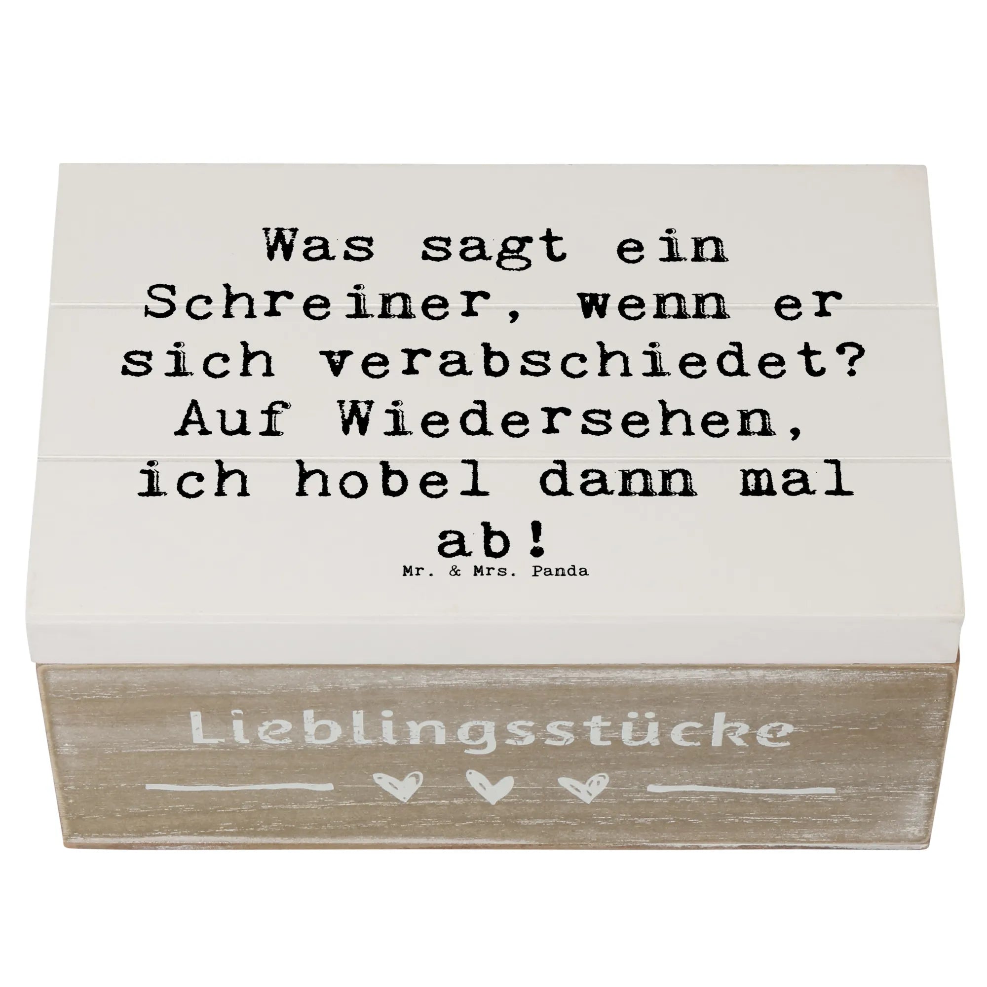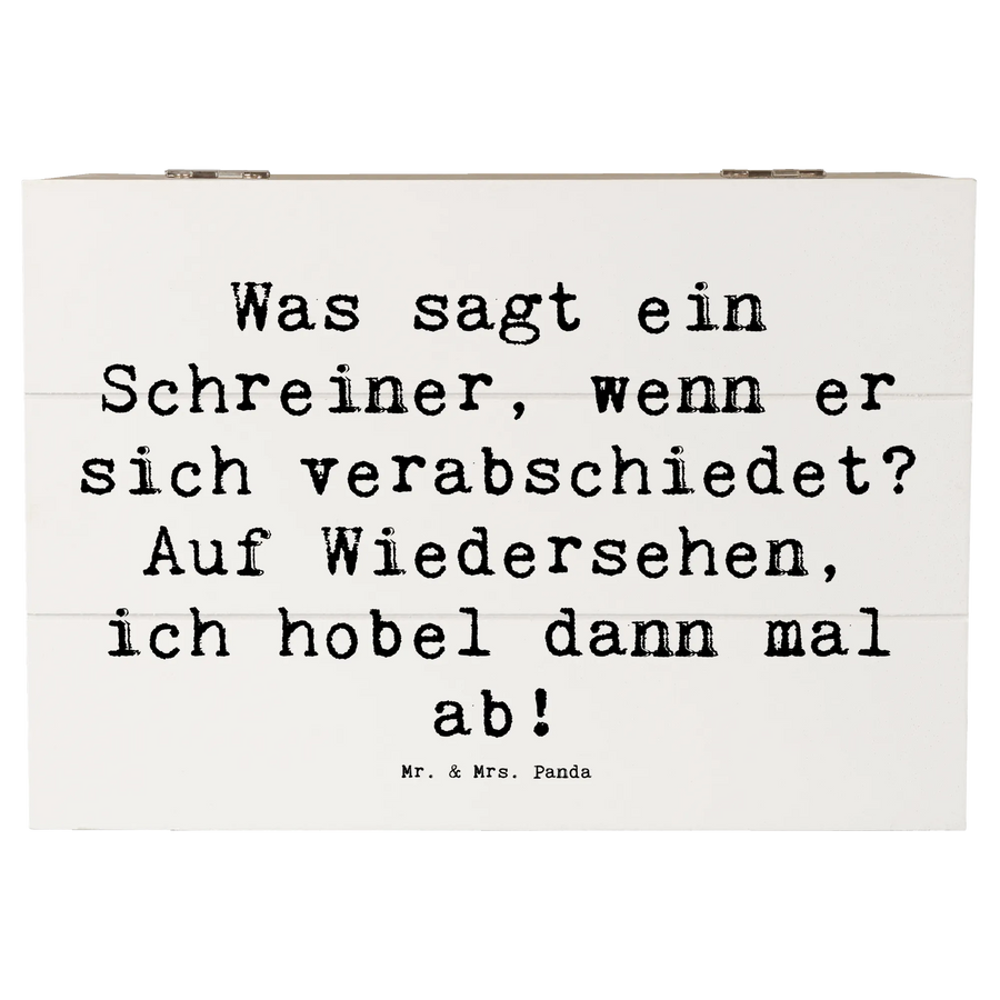 Wenn Du einem Handwerker ein besonderes Geschenk machen möchtest, sag es mit Humor! Der witzige Spruch "Was sagt ein Schreiner, wenn er sich verabschiedet? Auf Wiedersehen, ich hobel dann mal ab!" sorgt für ein Schmunzeln, während die Kiste gleichzeitig ein wunderschönes Zuhause für all die kleinen Schätze bietet.
