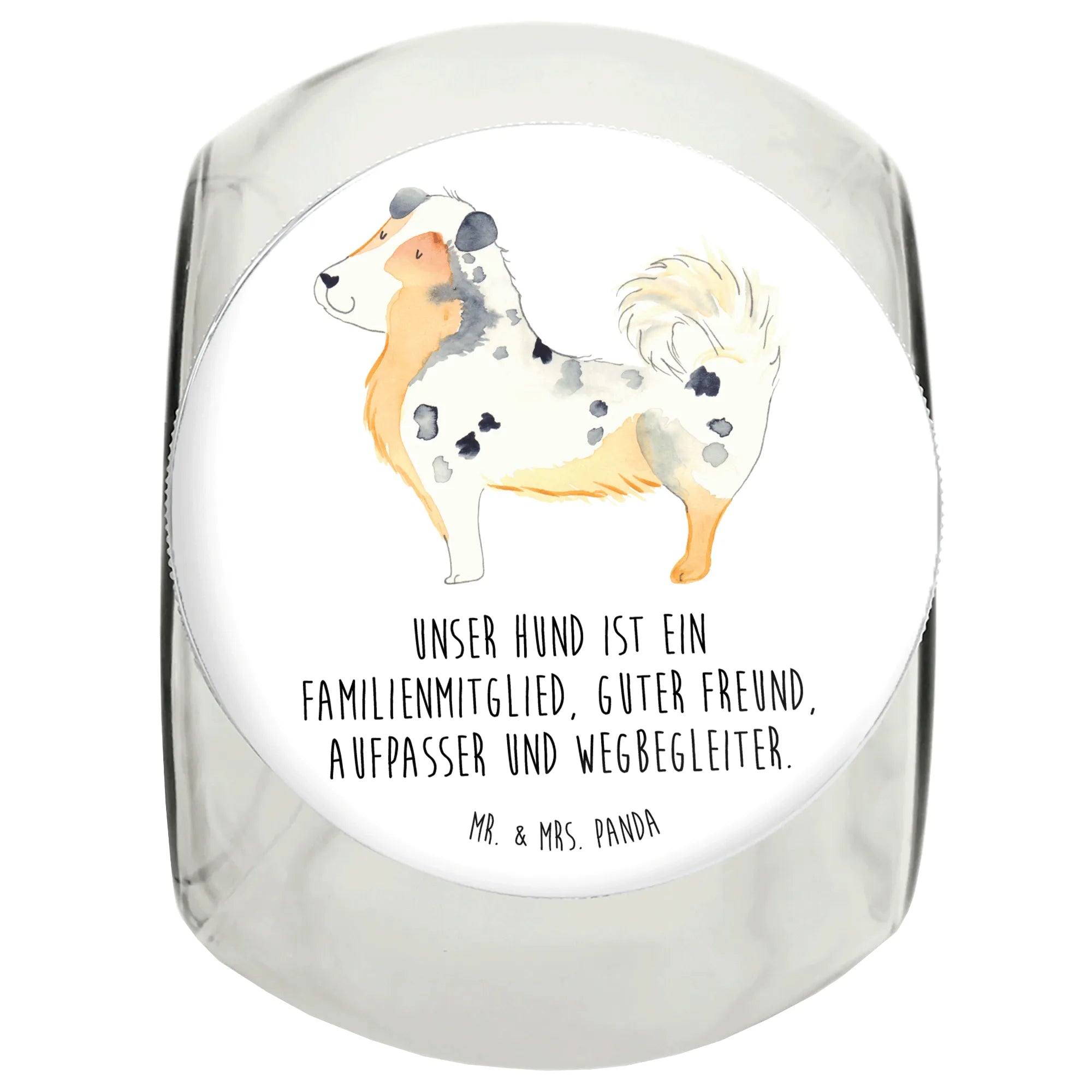 Das Leckerli Glas mit dem süßen Motiv des Australian Shepherds von Mr. & Mrs. Panda ist das perfekte Geschenk für Tierliebhaber und Hundebesitzer. Warum? Weil dein Hund mehr als nur ein Haustier ist – er ist ein Familienmitglied, ein treuer Freund und der beste Aufpasser, den man sich wünschen kann.
