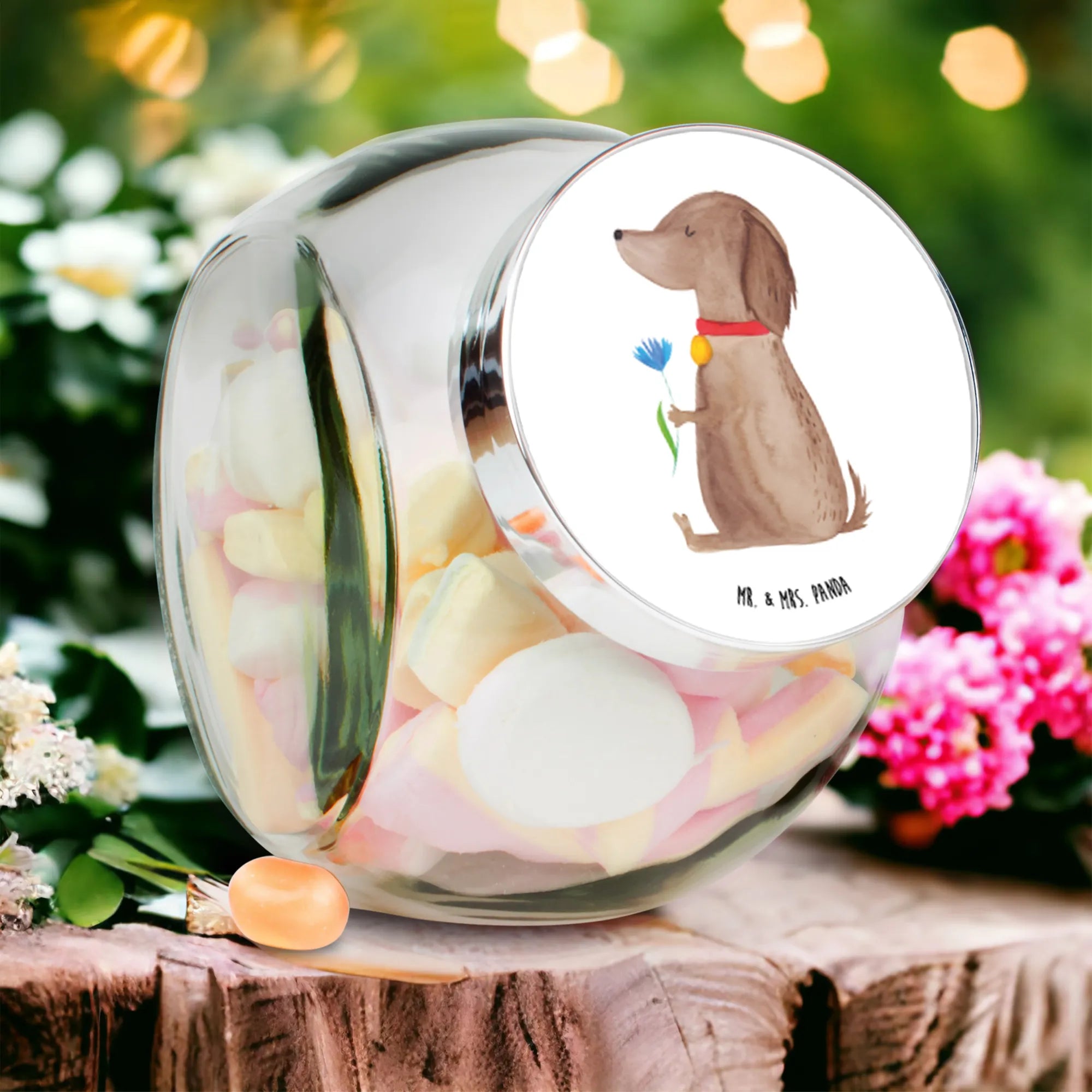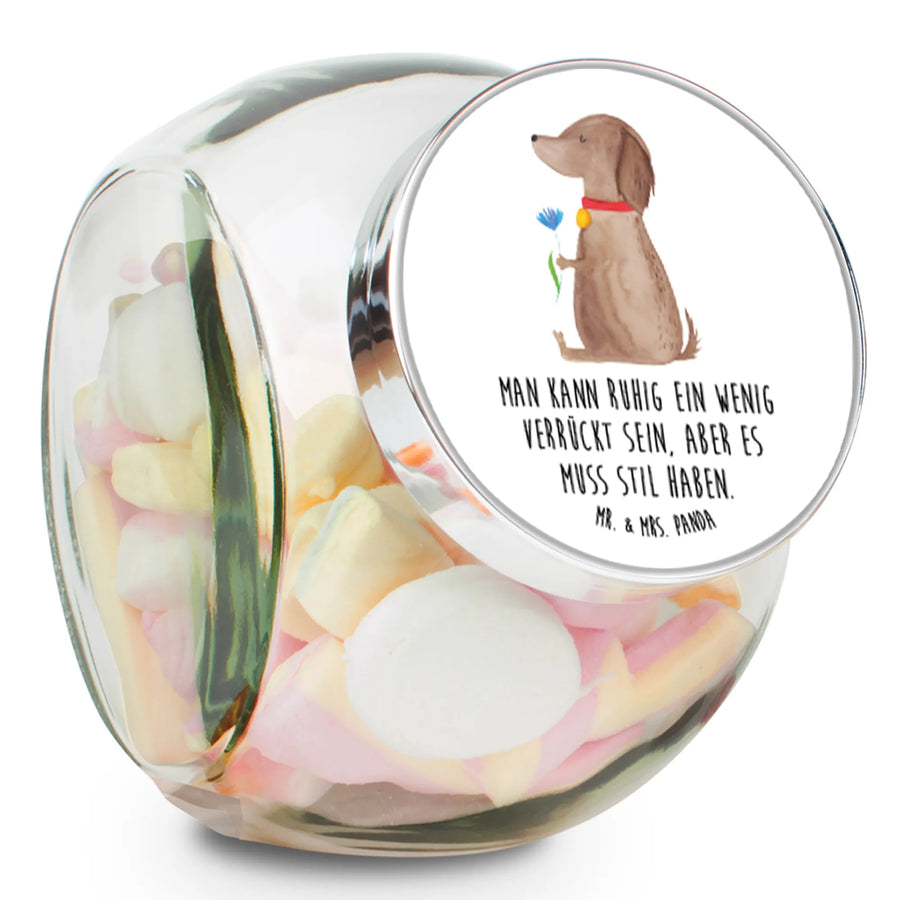 Perfekt auch als Geschenk für Hundeliebhaber oder als schicke Deko für die eigene Küche. Mit dem liebevollen Motiv eines süßen Hundes mit einer Blume im Fell ist es ein echtes Highlight in jedem Zuhause. Die Hunde Kollektion von Mr. & Mrs. Panda umfasst viele weitere tolle Produkte für Tierliebhaber, die wie dieses Bonbonglas mit liebevollen Motiven und Sprüchen gestaltet sind.