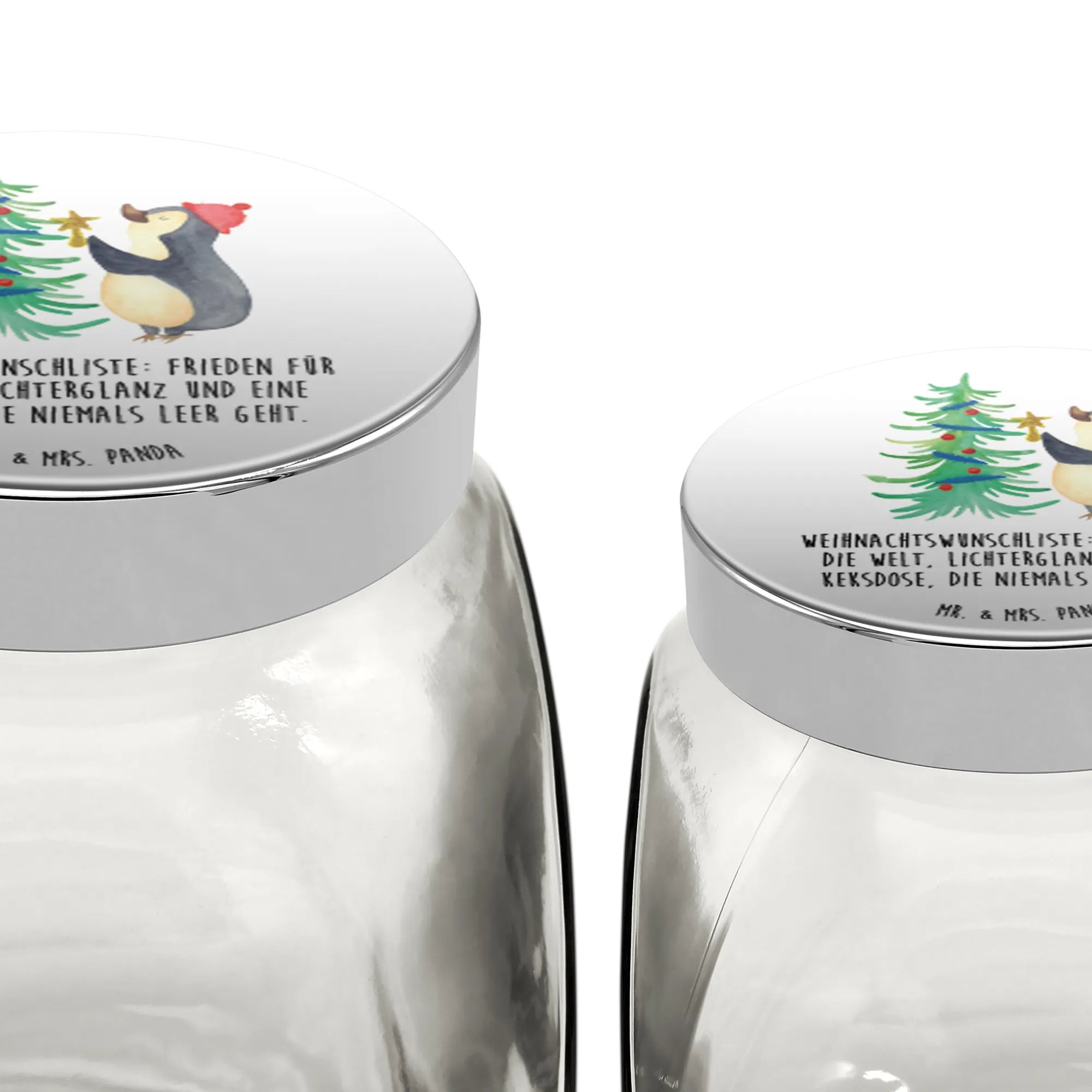 Das Bonbonglas mit dem niedlichen Pinguin Weihnachtsbaum aus der Winter Kollektion von Mr. & Mrs. Panda ist das perfekte Geschenk für alle, die die Zauber der Weihnachtszeit lieben! Innen wie außen strahlt dieses wunderschöne Vorratsglas mit seinem fröhlichen Design und dem charmanten Slogan: "Weihnachtswunschliste: Frieden für die Welt, Lichterglanz und eine Keksdose, die niemals leer geht." Mit einem Füllvolumen von 870 ml bietet es ausreichend Platz für all Deine Lieblingssüßigkeiten, Kekse, leckeres Müsli oder aromatischen Tee. Das hochwertige Glas sorgt dafür, dass die Frische und das Aroma Deiner Leckereien immer bewahrt bleiben. Der silberfarbene Schraubverschluss gewährleistet, dass nichts entweicht und alles sicher verstaut ist. Ob auf dem Küchentisch, im Regal oder als hübsche Deko für Weihnachten – dieses Bonbonglas bringt Freude in jeden Raum!