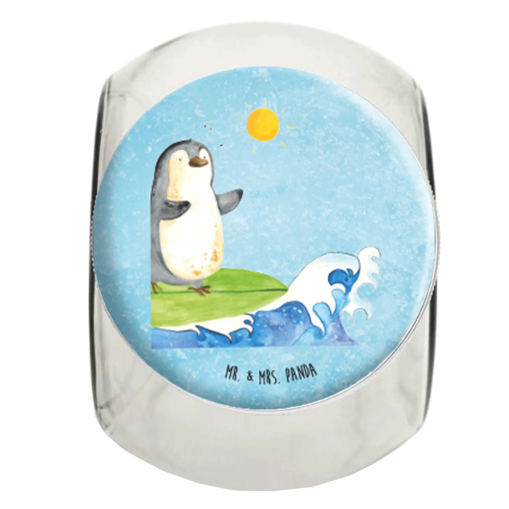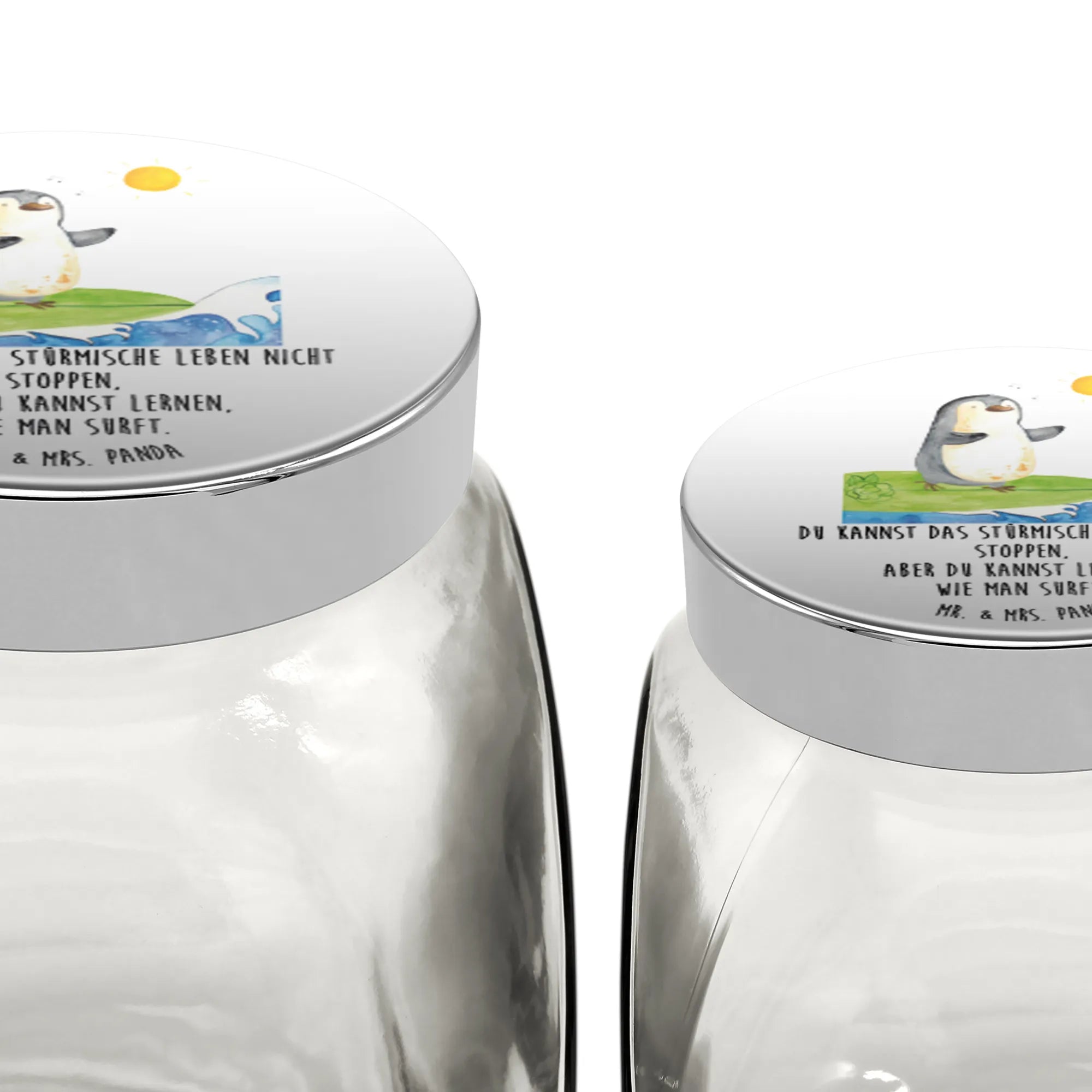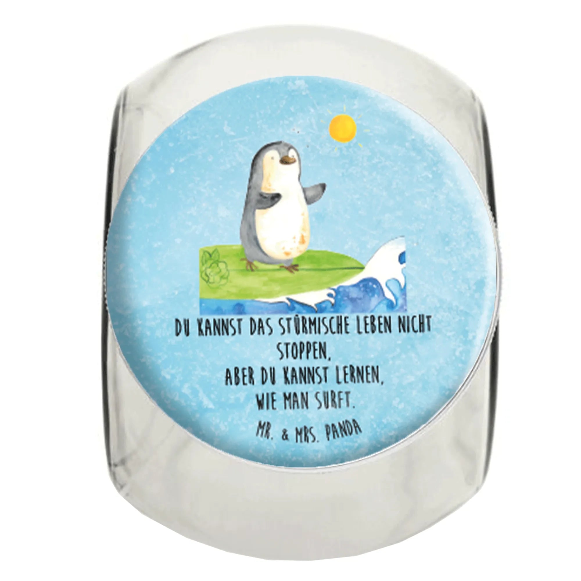 Entdecke das wunderschöne Bonbonglas mit dem niedlichen Pinguin Surfer-Motiv aus der Pinguin-Kollektion von Mr. & Mrs. Panda! Dieses bezaubernde Vorratsglas ist nicht nur ein praktischer Küchenhelfer, sondern auch ein echter Hingucker in deiner Küche oder deinem Wohnzimmer.
