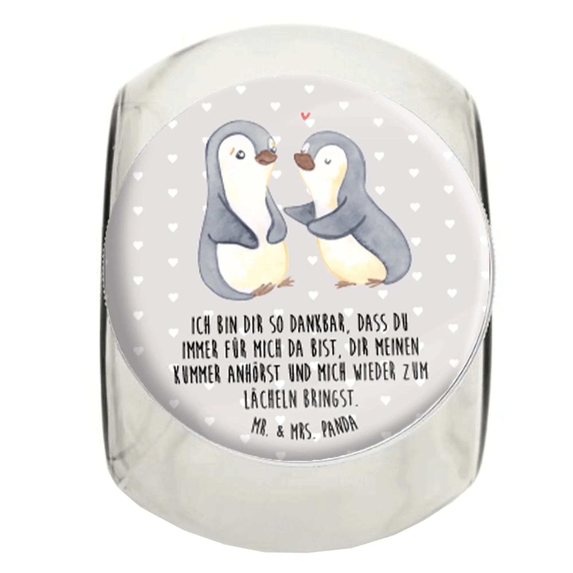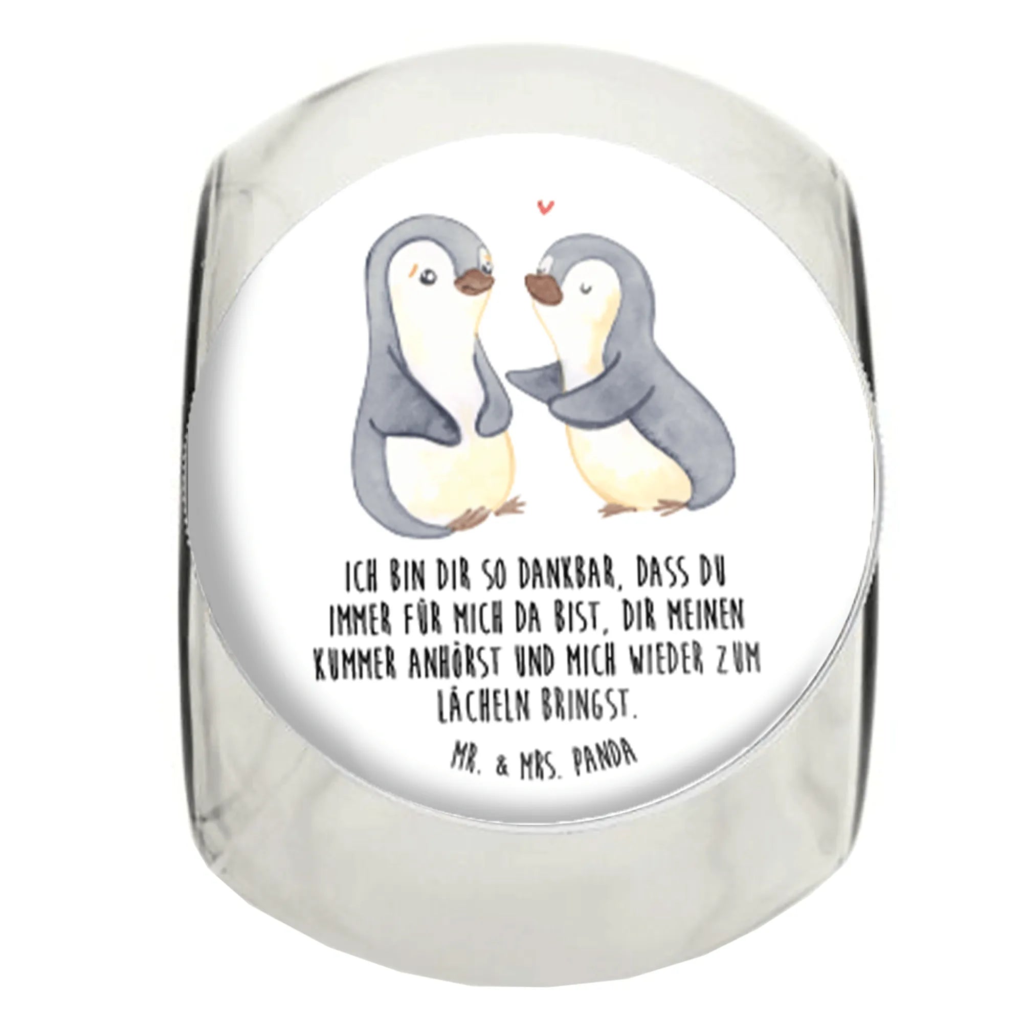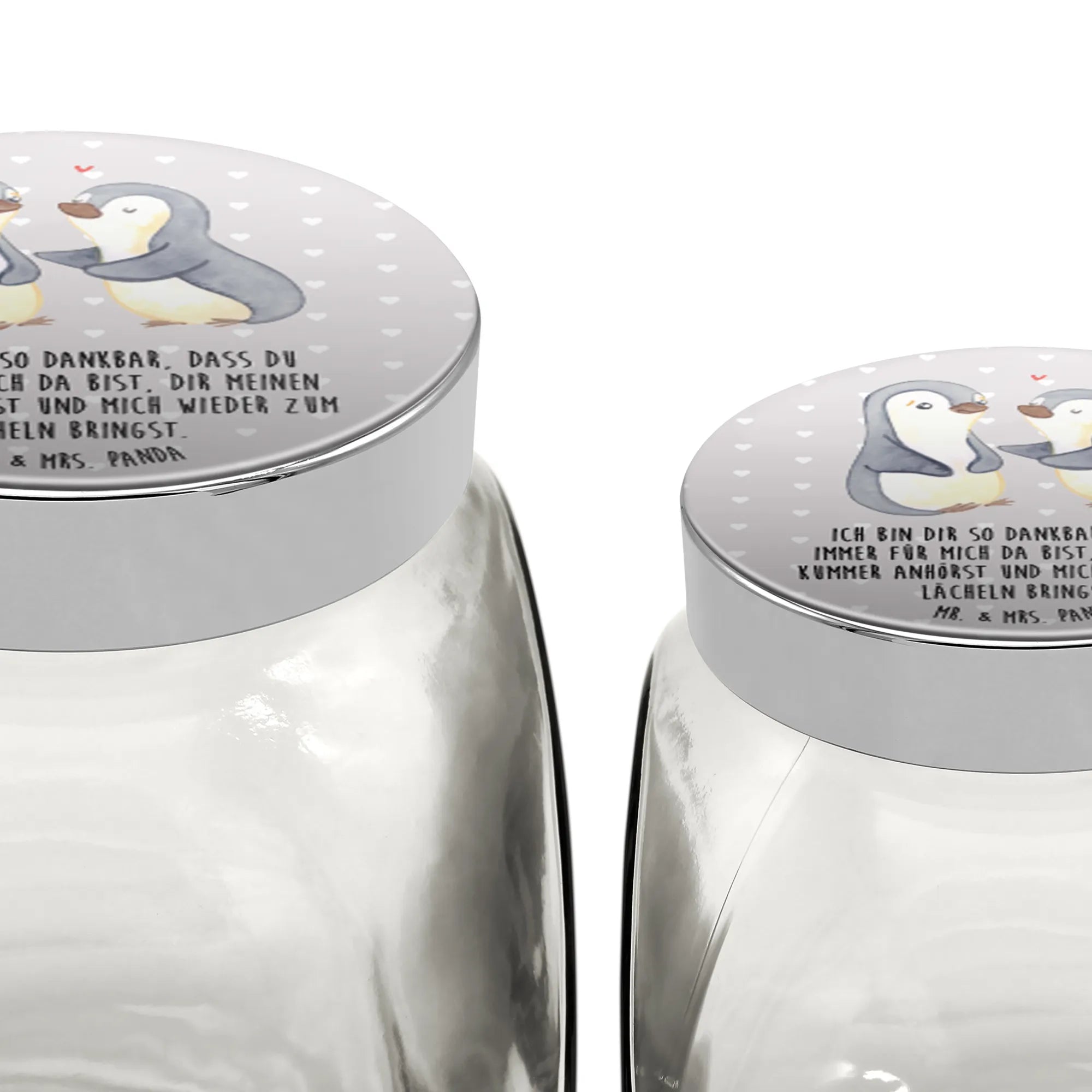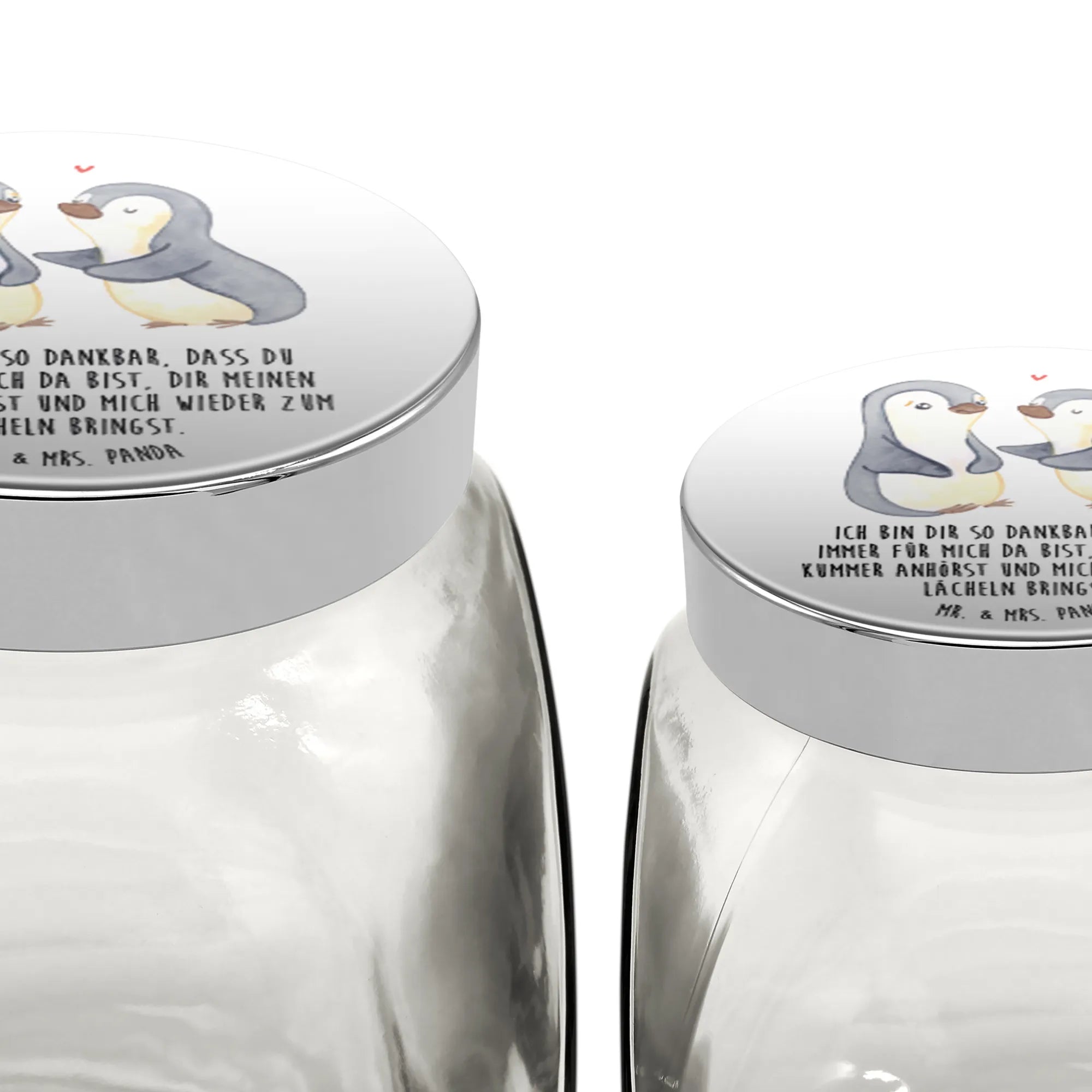 Das wunderschöne Bonbonglas von Mr. & Mrs. Panda mit dem liebevollen Motiv "Pinguine trösten" ist das perfekte Geschenk für all diejenigen, die kleinen Trost und Freude im Alltag suchen. Ob für den Valentinstag, den Hochzeitstag oder einfach als kleines Mitbringsel für Deine Freundin oder Deinen Partner – dieses Vorratsglas ist eine süße Geste der Zuneigung. Auf dem Glas sind zwei zärtlich zusammentretende Pinguine abgebildet, die ihren warmen Blick und ihre liebevolle Haltung sofort für ein Lächeln sorgen. Der Slogan "Ich bin dir so dankbar, dass du immer für mich da bist, dir meinen Kummer anhörst und mich wieder zum Lächeln bringst" macht es zu einem besonderen Liebesgeschenk.