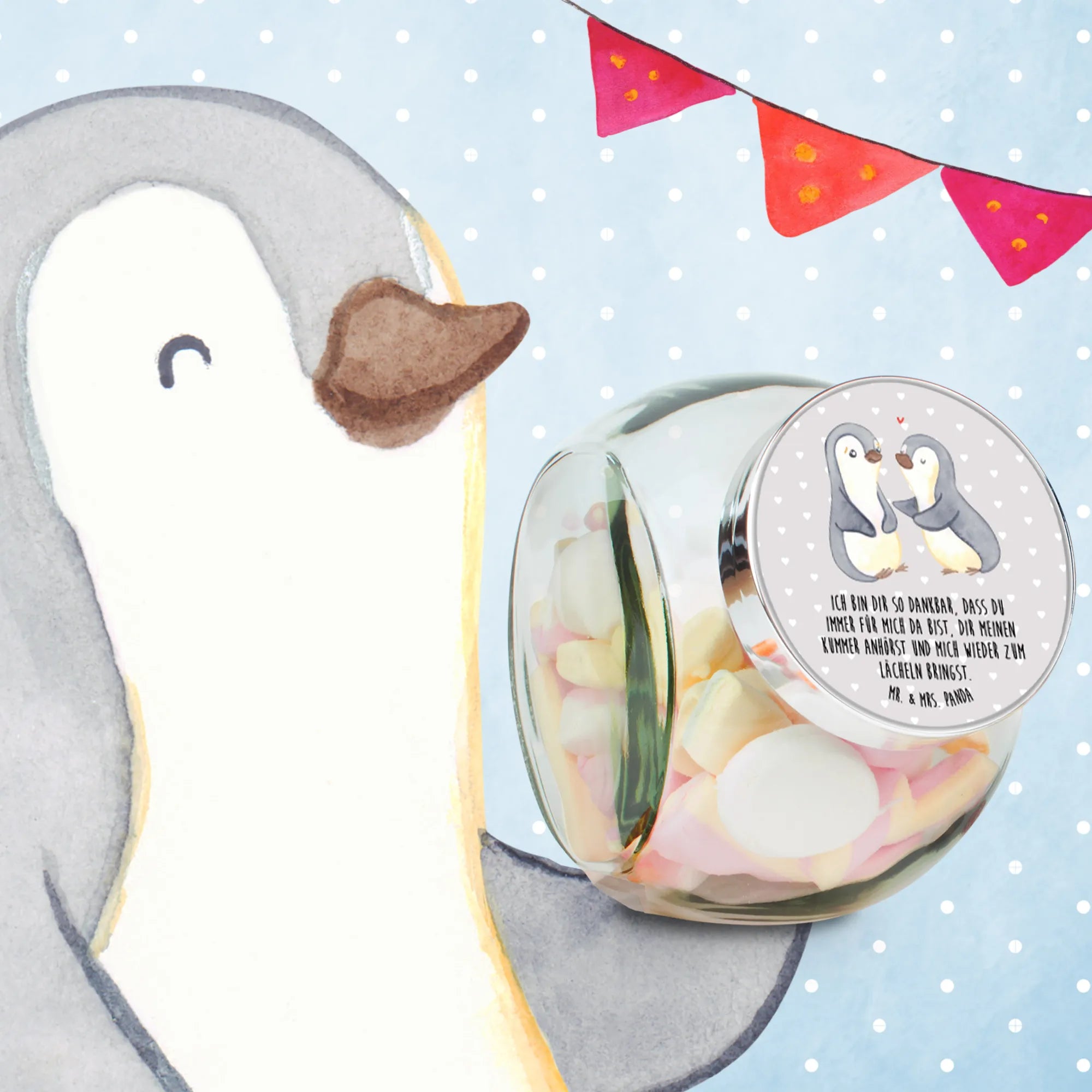 Das Bonbonglas mit dem süßen Motiv "Pinguine trösten" aus der Kollektion Liebe von Mr. & Mrs. Panda ist die perfekte Geschenkidee für all jene, die ihren Liebsten eine Freude machen möchten. Ob zum Valentinstag, Jahrestag oder als nettes Mitbringsel – dieses wunderschöne Glas verströmt durch sein zärtliches Pinguin-Motiv und den liebevollen Spruch "Ich bin dir so dankbar, dass du immer für mich da bist, dir meinen Kummer anhörst und mich wieder zum Lächeln bringst" eine herzliche Botschaft der Zuneigung.