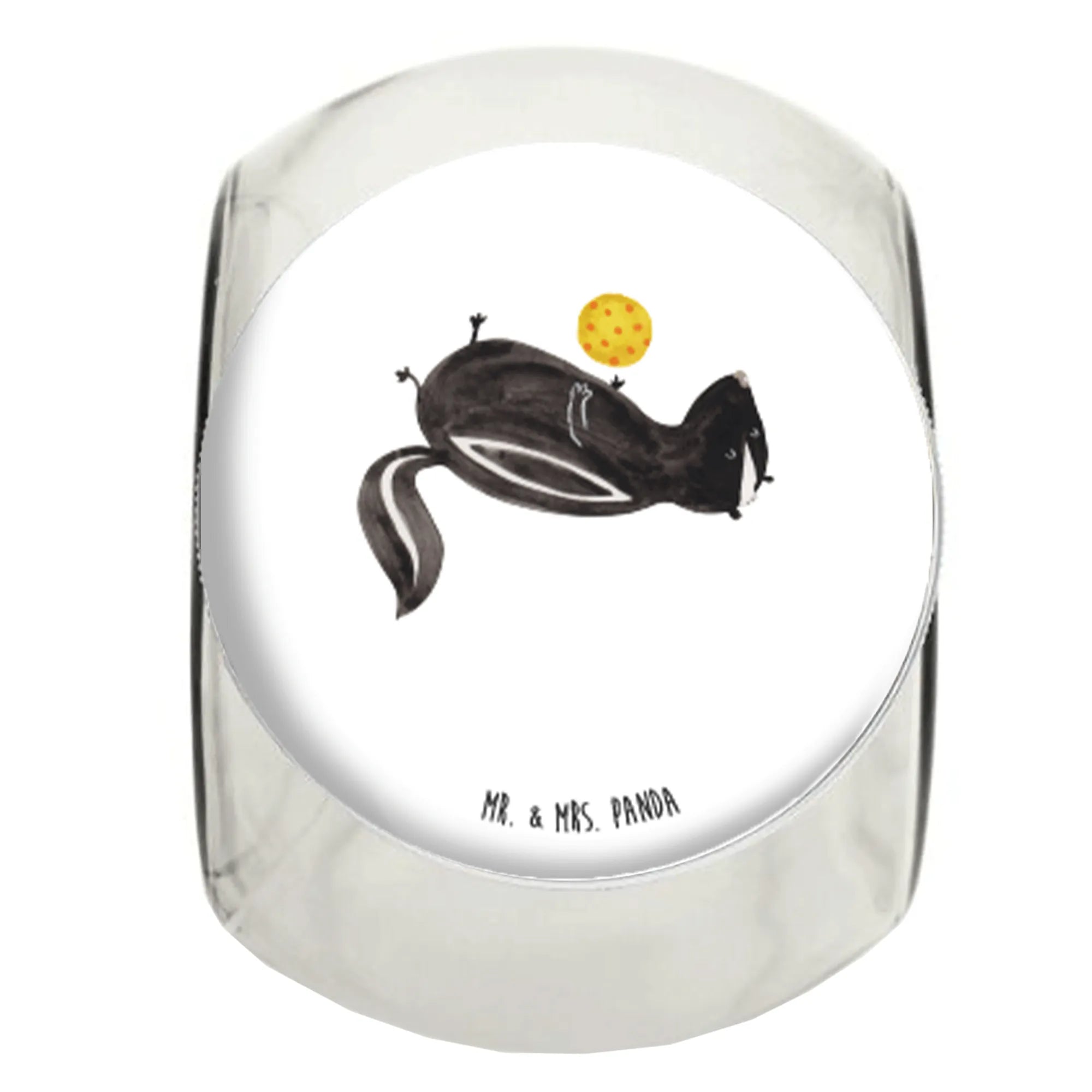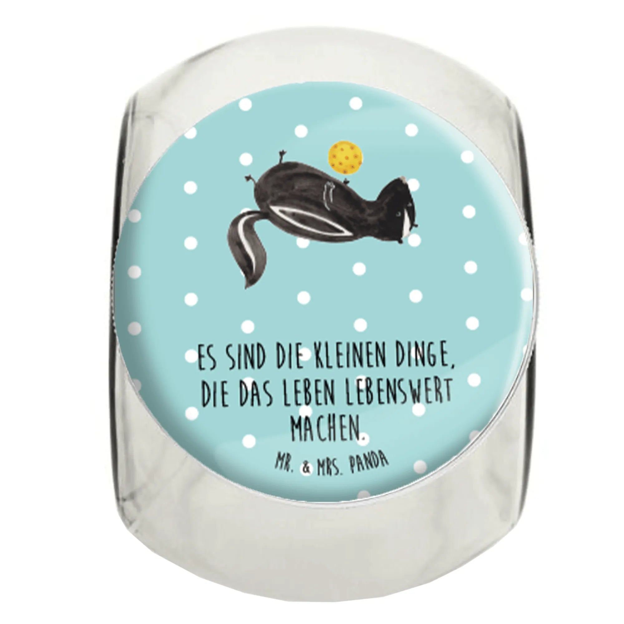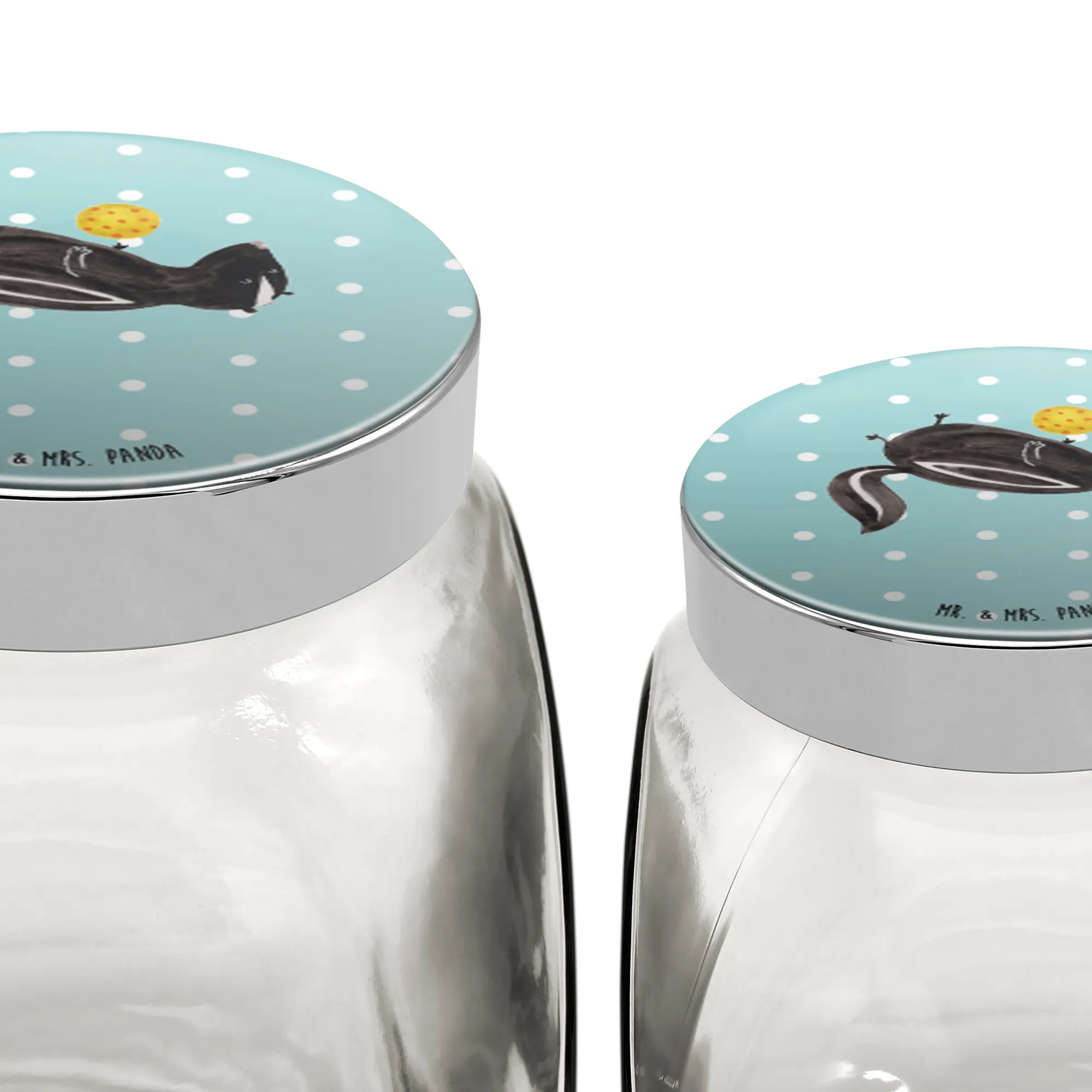 Entdecke das wunderschöne Bonbonglas mit dem fröhlichen Stinktier Ball Motiv von Mr. & Mrs. Panda! Dieses einzigartige Aufbewahrungsglas ist der perfekte Begleiter in deiner Küche oder deinem Wohnzimmer und eignet sich hervorragend zum Aufbewahren von Süßigkeiten, Keksen, Müsli, Tee oder Gewürzen.