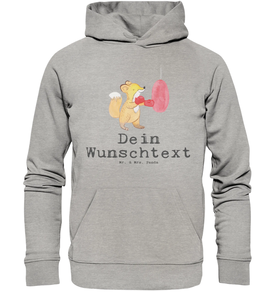 Der Aufdruck zeigt einen motivierten Fuchs, der mit vollem Einsatz gegen einen Boxsack boxt, und sorgt für ein Lächeln auf den Lippen. Und das Beste daran? Du kannst deinen eigenen Wunschtext oder Namen hinzufügen, um den Hoodie zu einem ganz persönlichen Geschenk zu machen.