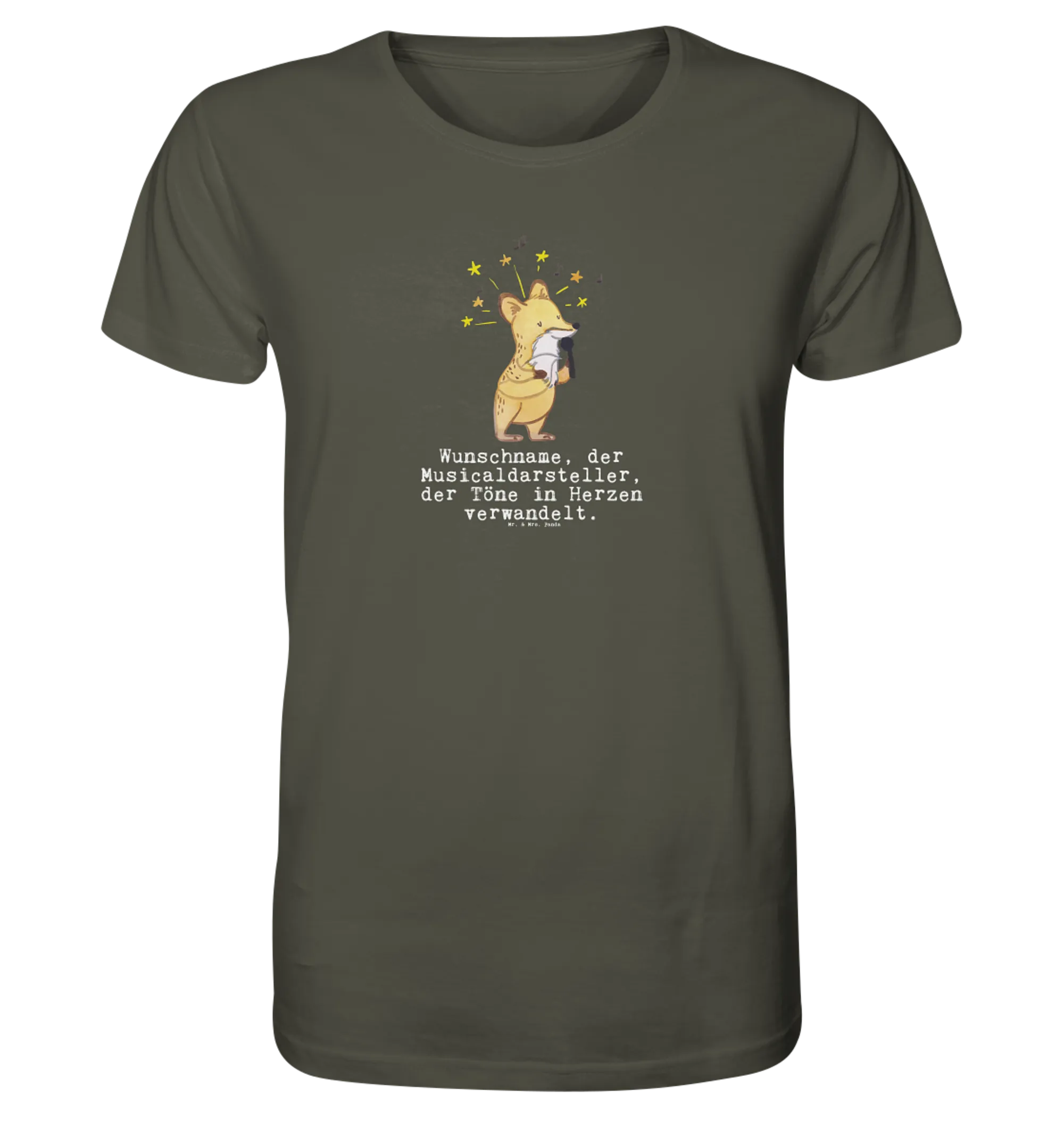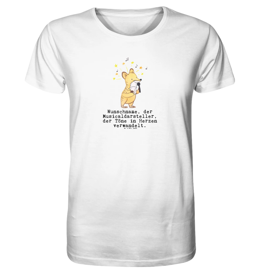Das personalisierte Shirt Herren "Musicaldarsteller mit Herz" ist das perfekte Geschenk für jeden, der die Bühne liebt! Mit dem charmanten Motiv eines süßen Fuchses, der ein Mikrofon in der Hand hält und wundervoll singt, wird dieses Shirt zum absoluten Hingucker.