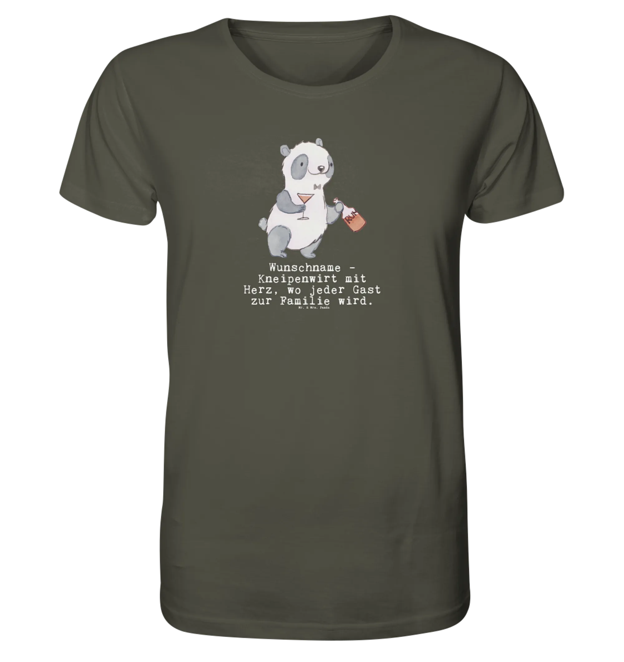 Das personalisierte Shirt Herren mit dem witzigen Motiv "Kneipenwirt mit Herz" ist das perfekte Geschenk für alle, die im Gastgewerbe arbeiten oder eine besondere Verbindung zu ihrer Kneipe haben. Egal ob Kollege, Freund oder Familienmitglied, dieses T-Shirt sorgt für Lächeln und gute Laune! Das originelle Design zeigt einen niedlichen Panda, der stolz mit einem Glas und einer Rumflasche präsentiert wird. Das Shirt trägt den humorvollen Spruch "Du bist nur ein halber Mensch, wenn du kein Kneipenwirt bist" - ein echter Hingucker auf jeder Feier!