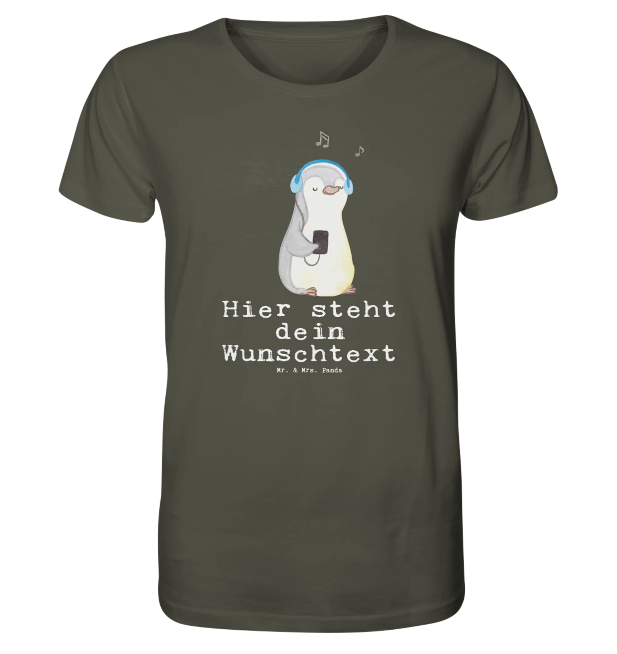 Suchst Du ein Geschenk mit Herz, Humor und musikalischer Botschaft? Unser Personalisiertes Shirt Herren aus der Hobby & Sport Kollektion von Mr. & Mrs. Panda kombiniert ein liebevoll gezeichnetes Pinguin-Motiv mit dem frechen Spruch „Es gibt schlechte Tage, und es gibt Tage, an denen ich Musik höre.“ Das Motiv ist hochkant angeordnet und wirkt besonders elegant auf dem neutralen Khaki-Hintergrund.