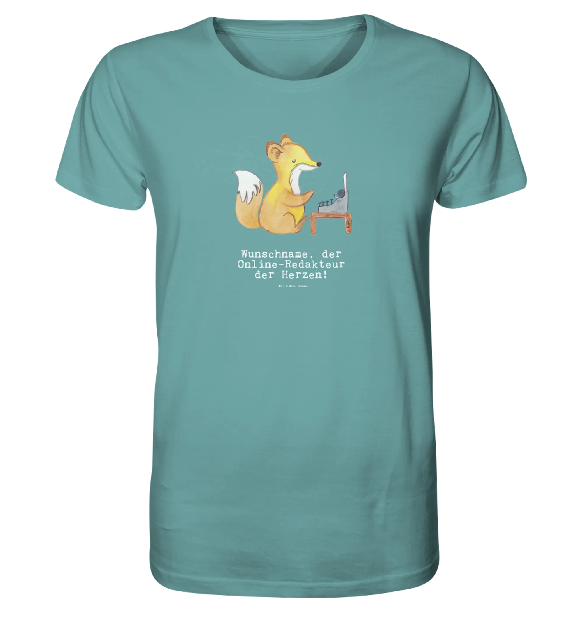 Suchst Du ein besonderes Geschenk für einen Online-Redakteur? Unser Personalisiertes Shirt Herren „Online Redakteur mit Herz“ aus der Berufe-Kollektion von Mr. & Mrs. Panda ist genau das: liebevoll, witzig und persönlich. Das Aquarellmotiv zeigt einen süßen Fuchs an einer Schreibmaschine und der Spruch „Du bist nur ein halber Mensch, wenn du kein Online Redakteur bist.“ zaubert garantiert ein Lächeln.