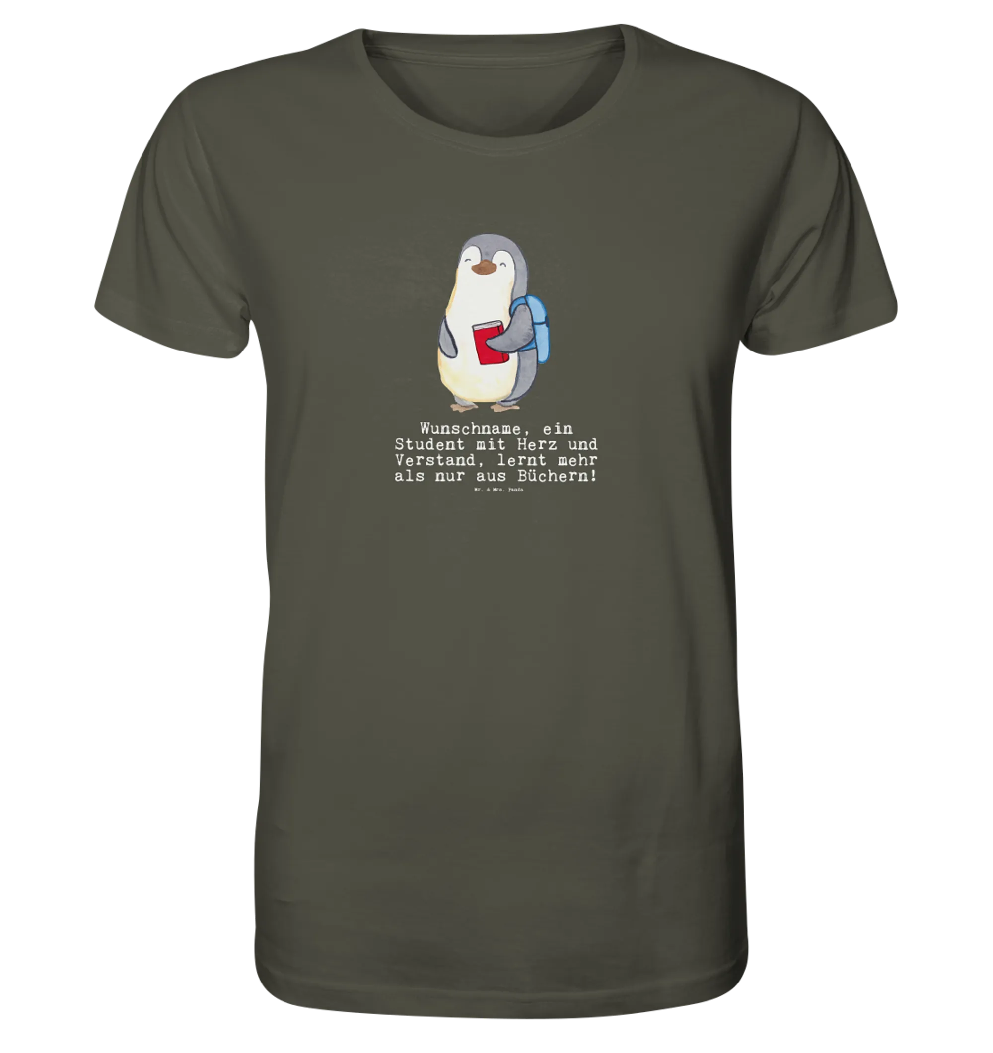 Das Personalisiertes Shirt Herren mit dem liebevollen Motiv "Student mit Herz" aus der Berufe-Kollektion von Mr. & Mrs. Panda ist das perfekte Geschenk für jeden Studenten, der mit viel Leidenschaft und Herzblut studiert. Ob zum Geburtstag, zum Junggesellenabschied oder einfach nur als nette Geste – dieses T-Shirt ist eine originelle und lustige Überraschung. Der süße Pinguin mit einem Rucksack auf dem Rücken, der in die Uni geht, bringt Freude und ein Lächeln in den Alltag.