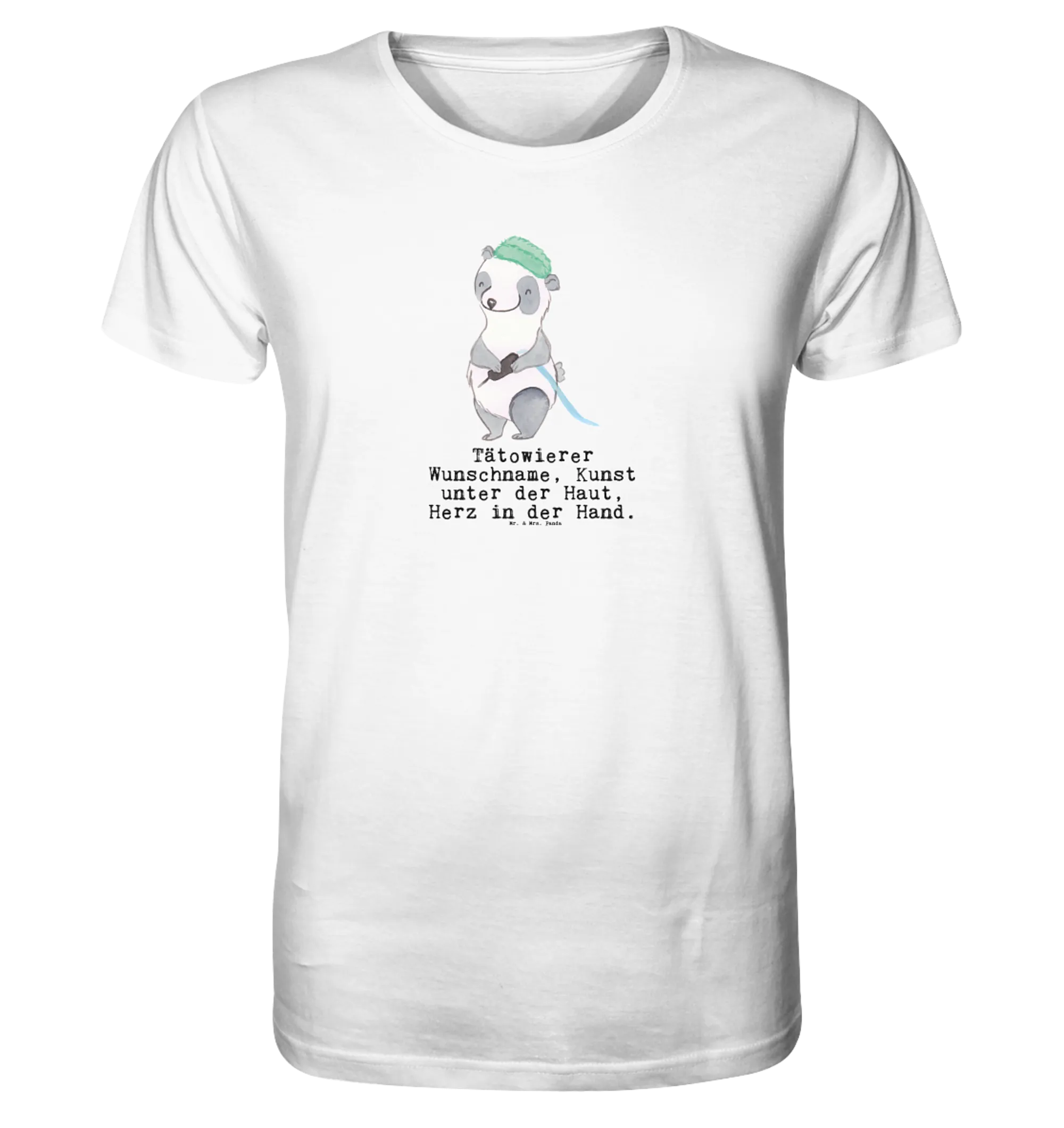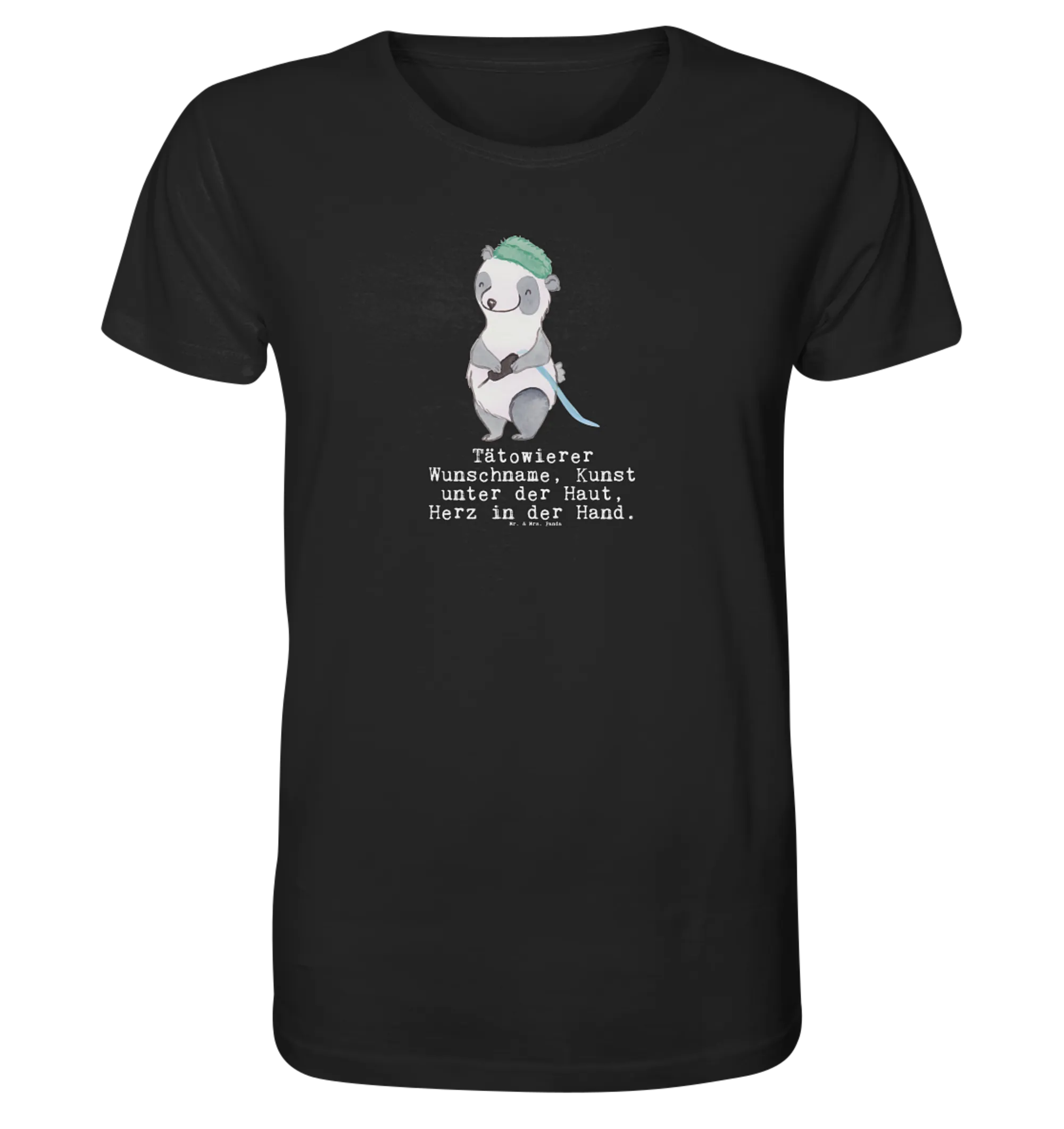 Das personalisierte Shirt für Herren mit dem Motiv 'Tätowierer mit Herz' ist das perfekte Geschenk für alle Tattoo-Liebhaber und kreativen Köpfen. Mit einem süßen Panda, der eine Tätowiermaschine in der Hand hält, bringt dieses Shirt nicht nur Freude, sondern auch eine Botschaft: 'Du bist nur ein halber Mensch, wenn du kein Tätowierer bist.'