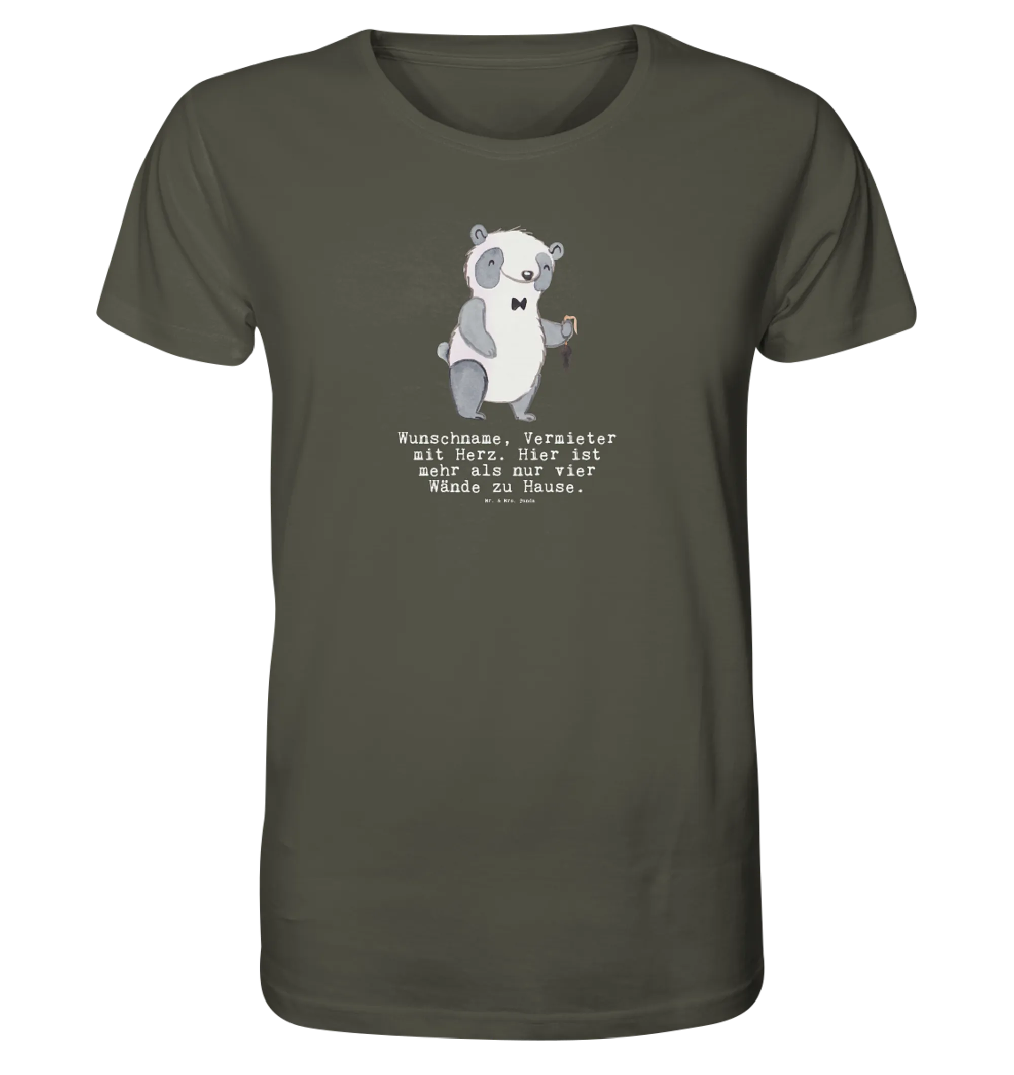 Das personalisierte Shirt Herren 'Vermieter mit Herz' ist das perfekte Geschenk für jeden, der sich im Rennen um Immobilien und Mietverhältnisse behauptet. Mit diesem lustigen T-Shirt machst du deinem Vermieter eine Freude oder überrascht einen Kollegen, der viel Herz in seinen Beruf steckt. Das lässige Shirt in Naturtönen ist nicht nur bequem und aus 100% Baumwolle gefertigt, sondern hat auch ein charmantes Motiv: Ein süßer Panda mit einem Schlüssel in der Hand.