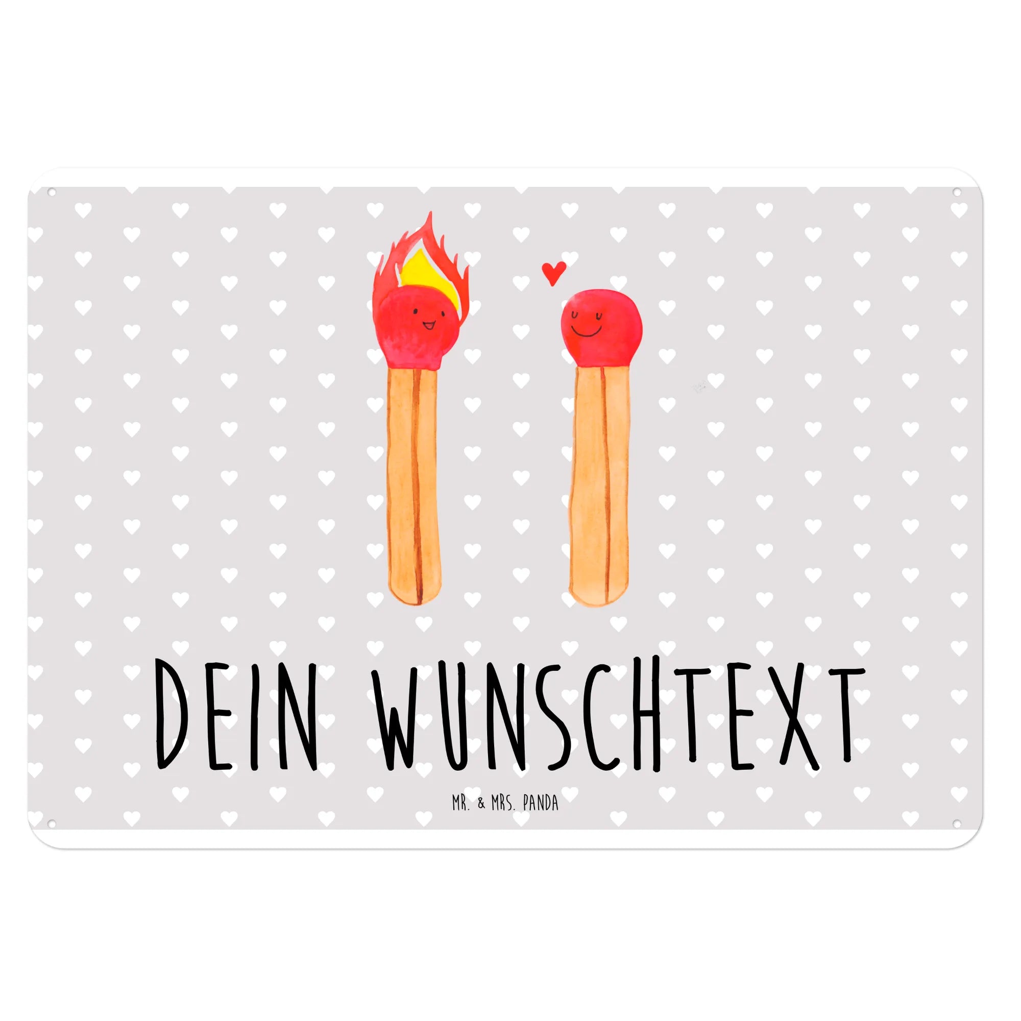 Wenn du auf der Suche nach einem ganz besonderen Geschenk bist, dann ist das personalisierte Blechschild mit dem Motiv "Streichhölzer" von Mr. & Mrs. Panda genau das Richtige für dich! Dieses wunderschöne und edle Schild strahlt nicht nur Liebe aus, sondern lässt jedes Herz höher schlagen. Die Darstellung von zwei glücklichen, anthropomorphen Streichhölzern, die von einem kleinen Herz umrahmt werden, symbolisiert die innige Verbindung zwischen dir und deinem liebsten Menschen.