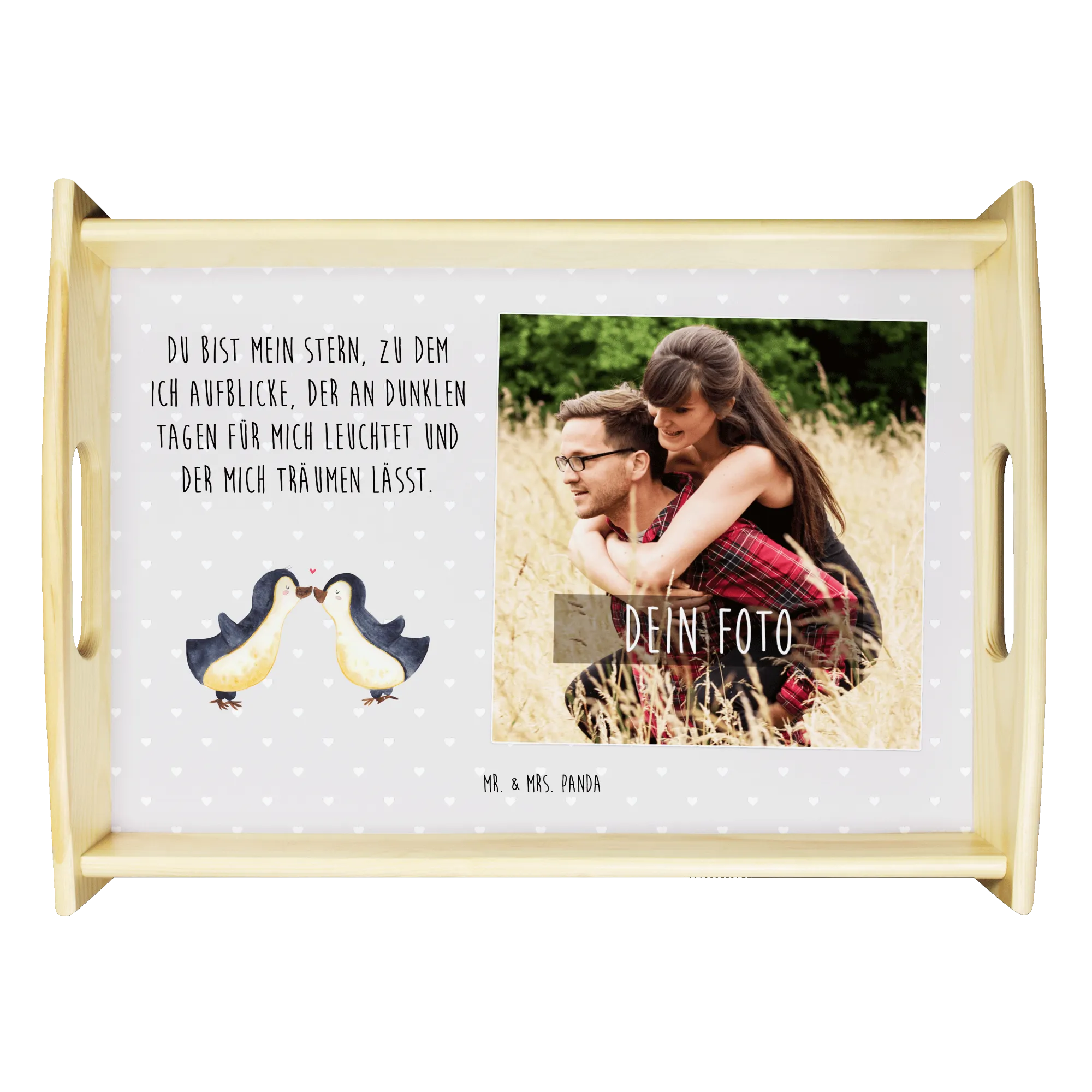 Entdecke das personalisierte Foto Serviertablett mit dem zauberhaften Motiv 'Pinguin Liebe' von Mr. & Mrs. Panda – dem perfekten Geschenk für alle Verliebten! Dieses einzigartige Tablett ist nicht nur praktisch, sondern auch eine liebevolle Erinnerung an wunderschöne Momente zu zweit. Die Darstellung der süßen, kuschelnden Pinguine symbolisiert die besondere Verbindung zwischen dir und deinem Partner.