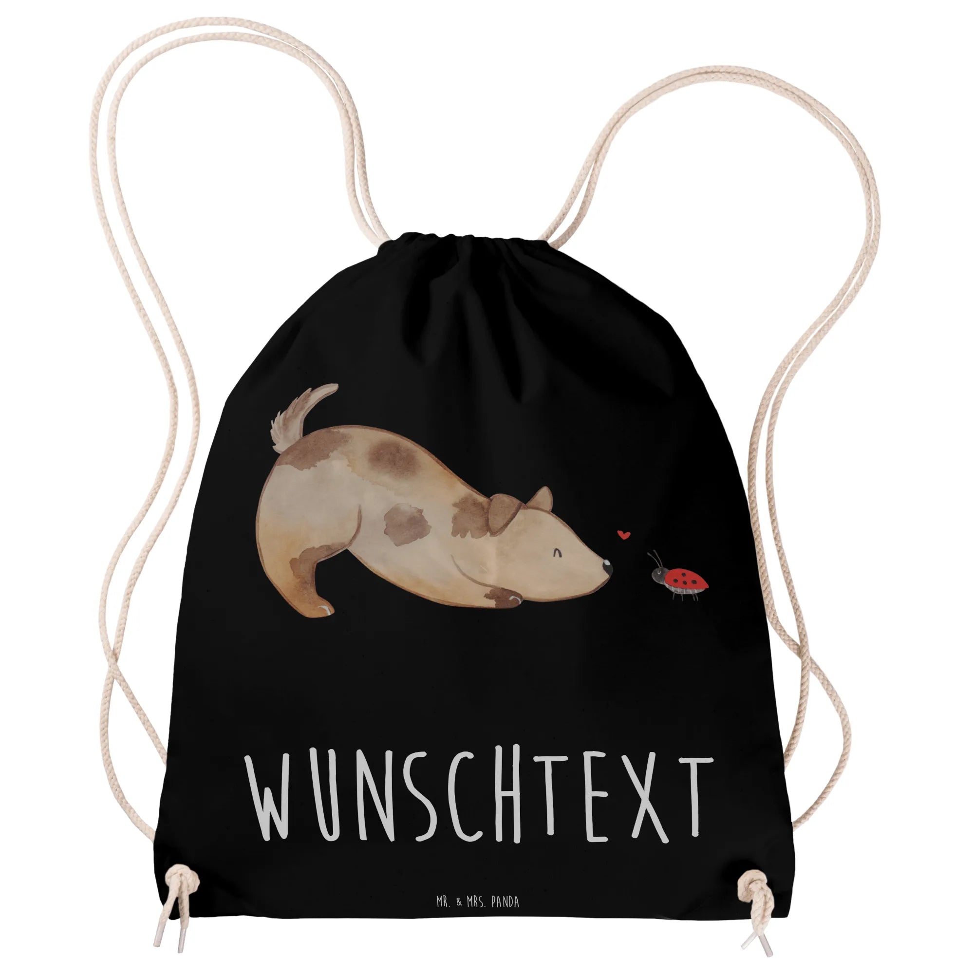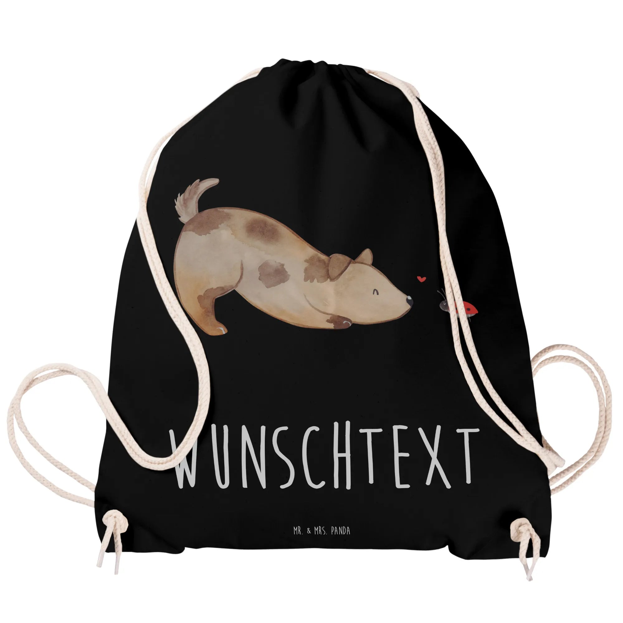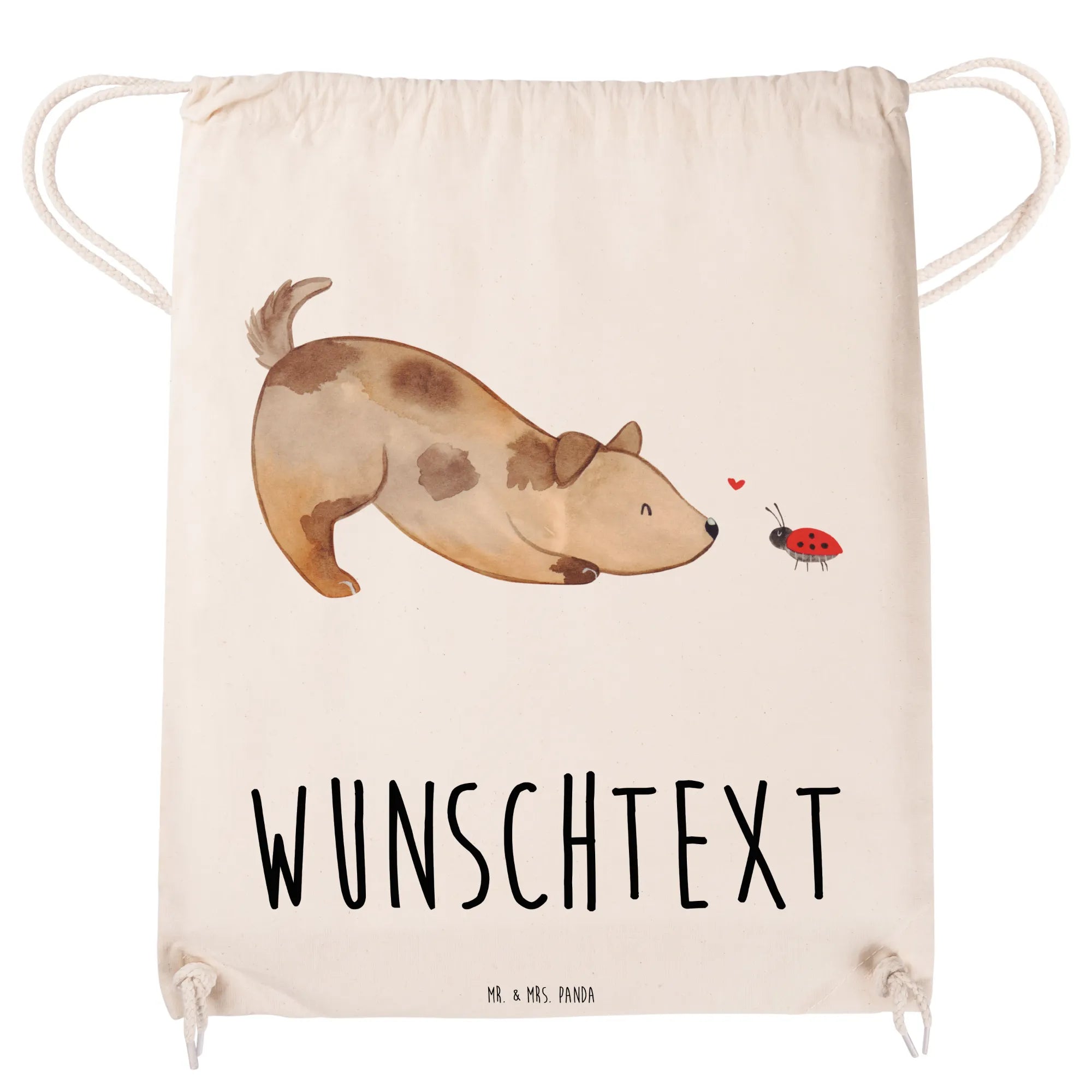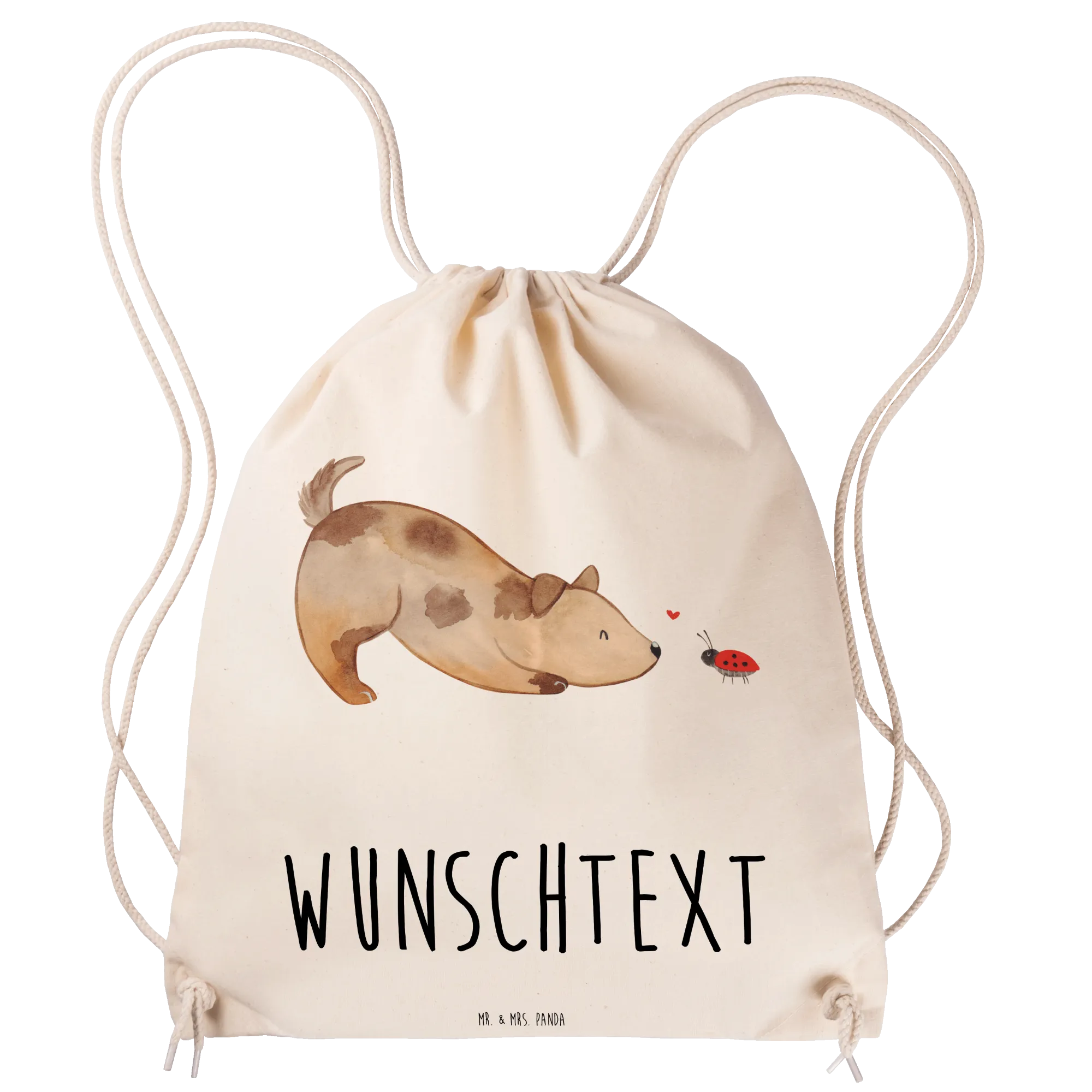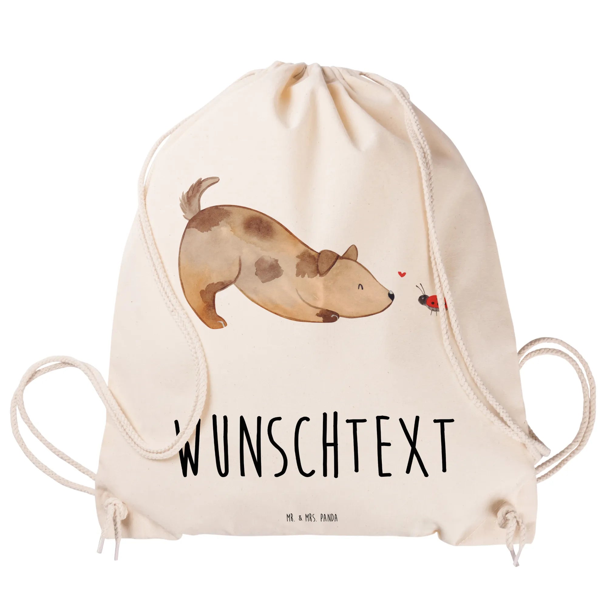 Der personalisierte Sportbeutel von Mr. & Mrs. Panda ist das perfekte Geschenk für Tierliebhaber und Hundebesitzer! Mit dem niedlichen Motiv eines Hundes, der enthusiastisch vor einem kleinen Marienkäfer sitzt, zaubert dieser Beutel jedem ein Lächeln ins Gesicht.