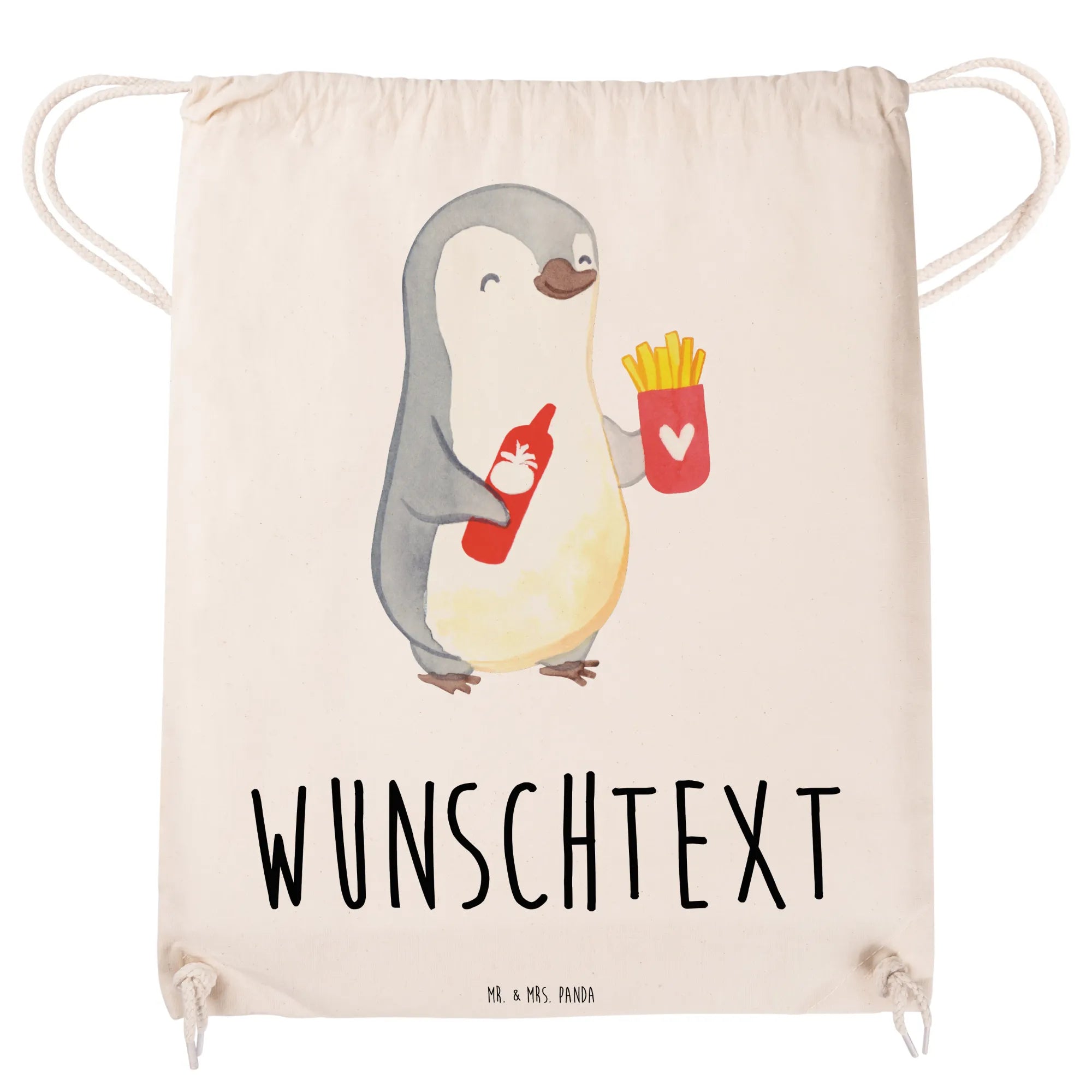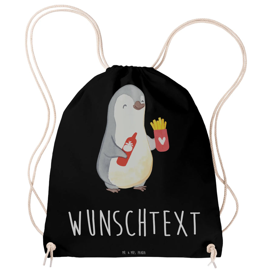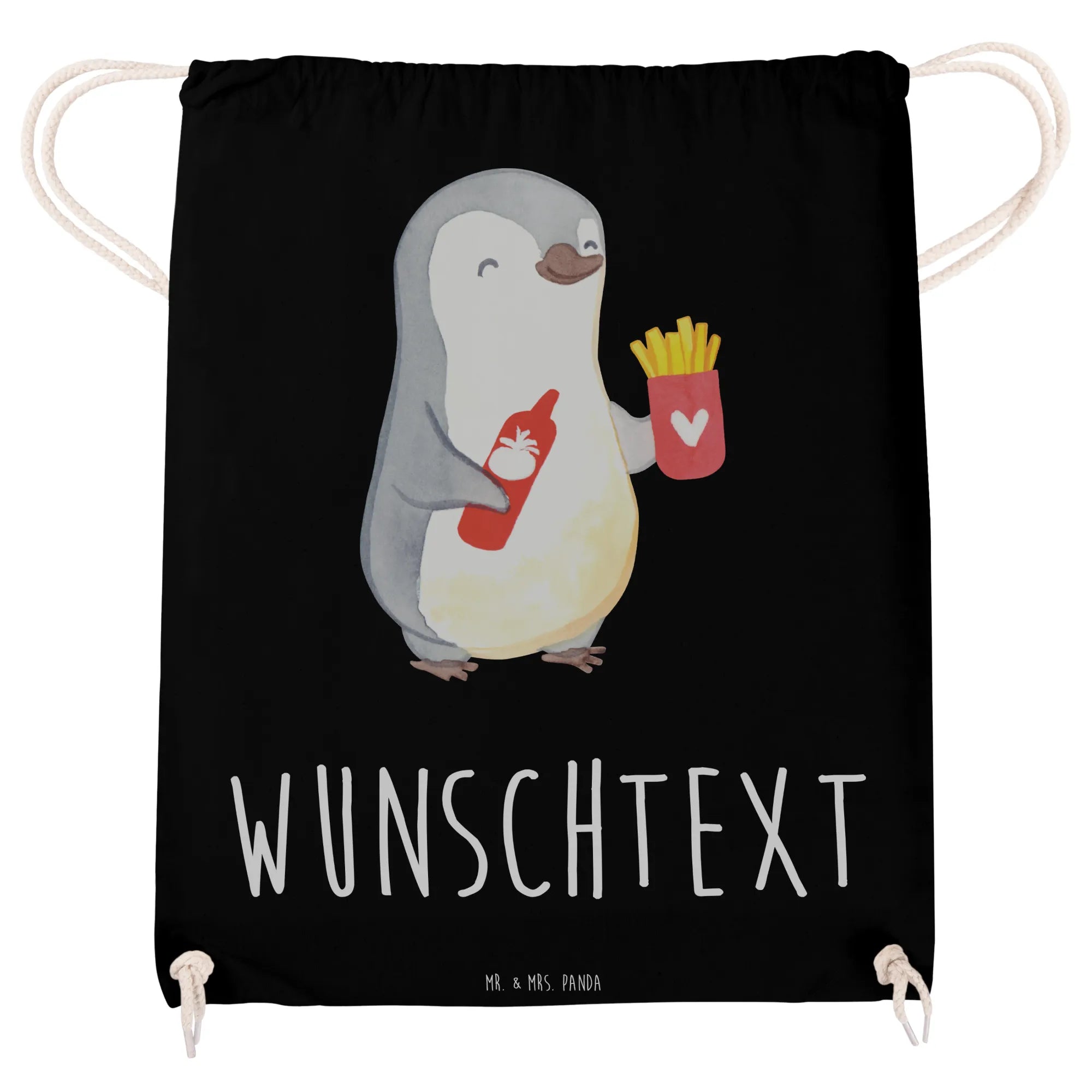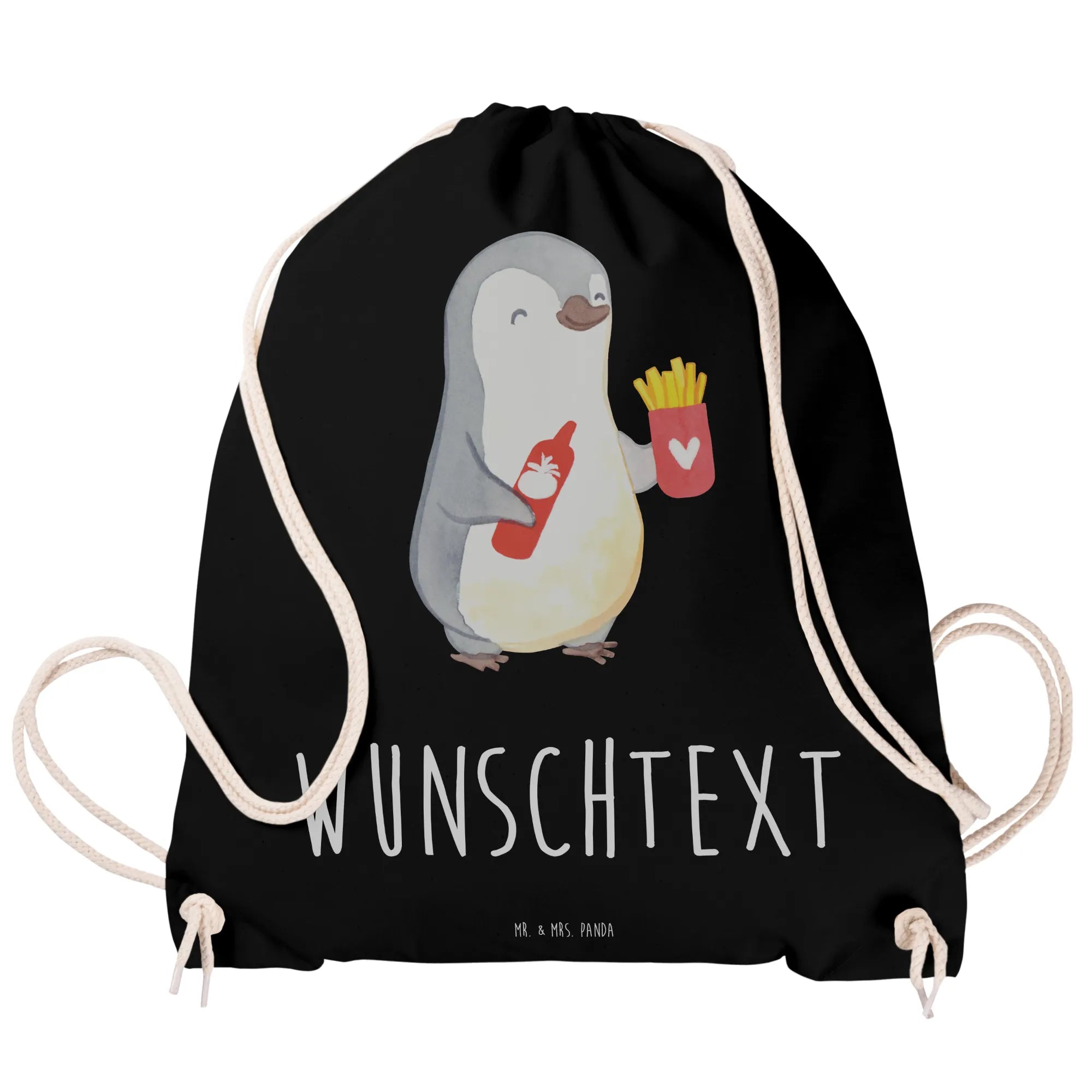 Imagine, wie schön es ist, den Namen des geliebten Menschen auf einem hochwertigen Sportbeutel zu sehen, der freundlich von einem Pinguin mit Pommes und Ketchup-Flasche geschmückt ist.