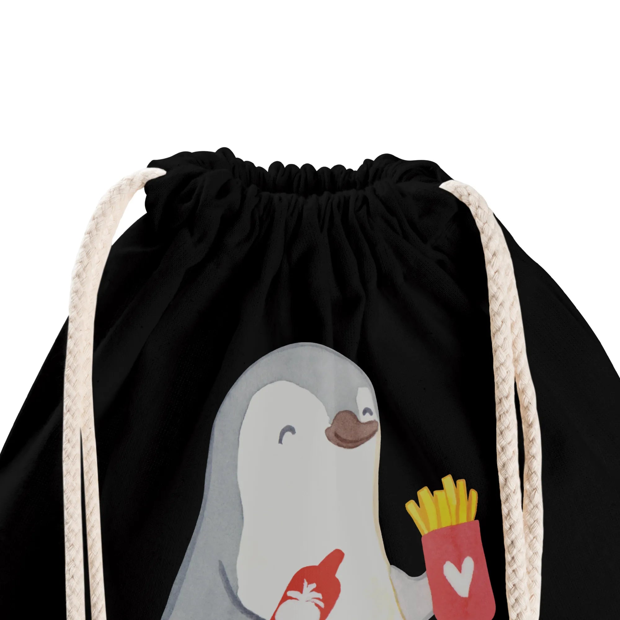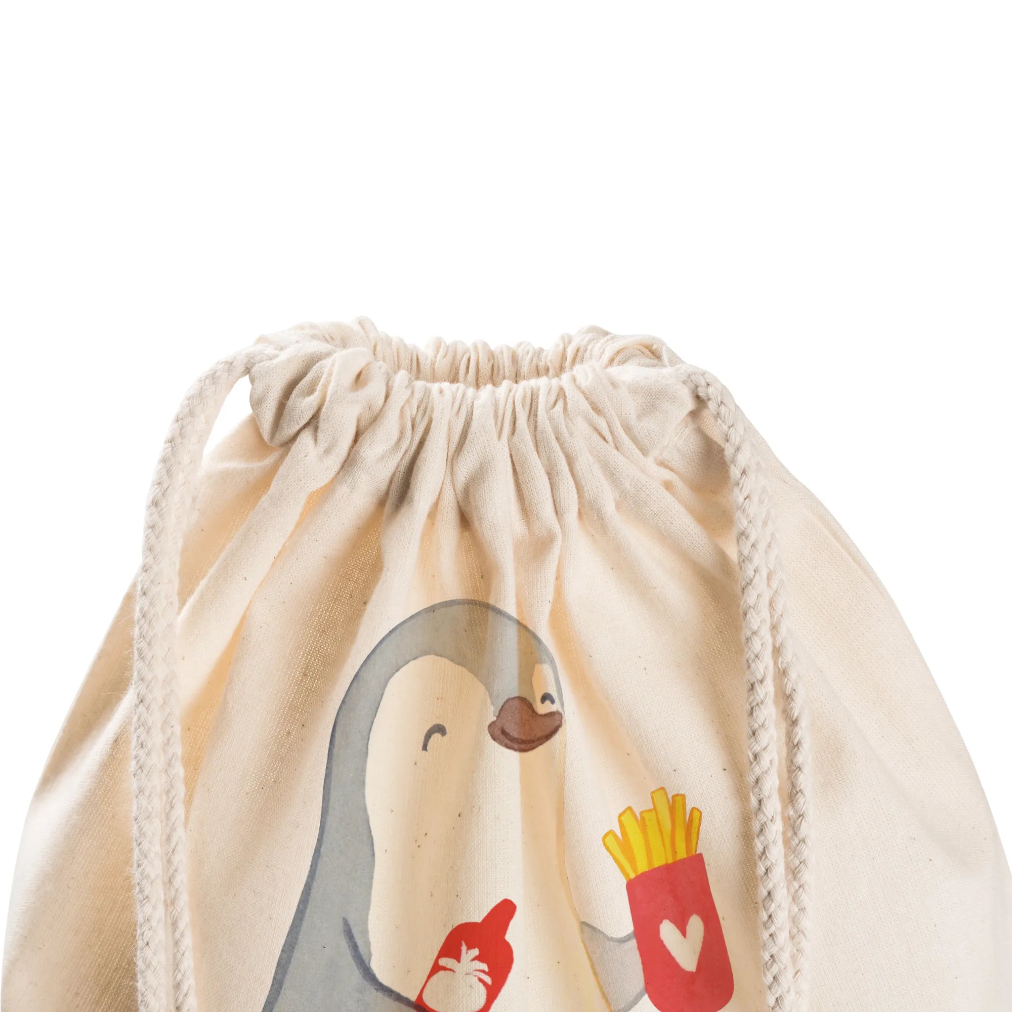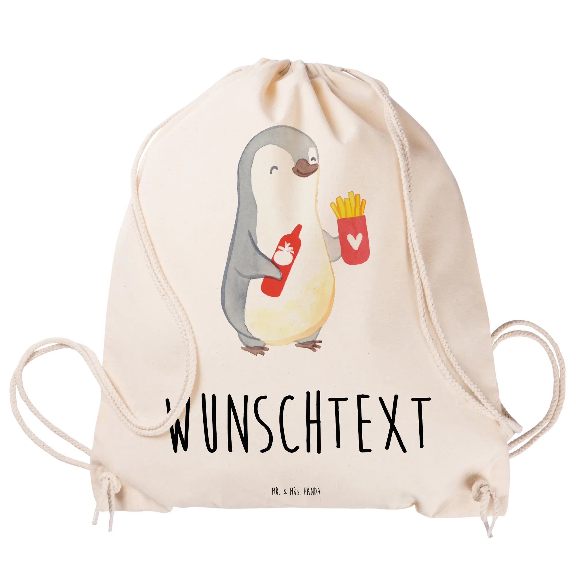 Imagine, wie schön es ist, den Namen des geliebten Menschen auf einem hochwertigen Sportbeutel zu sehen, der freundlich von einem Pinguin mit Pommes und Ketchup-Flasche geschmückt ist.