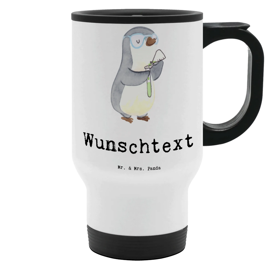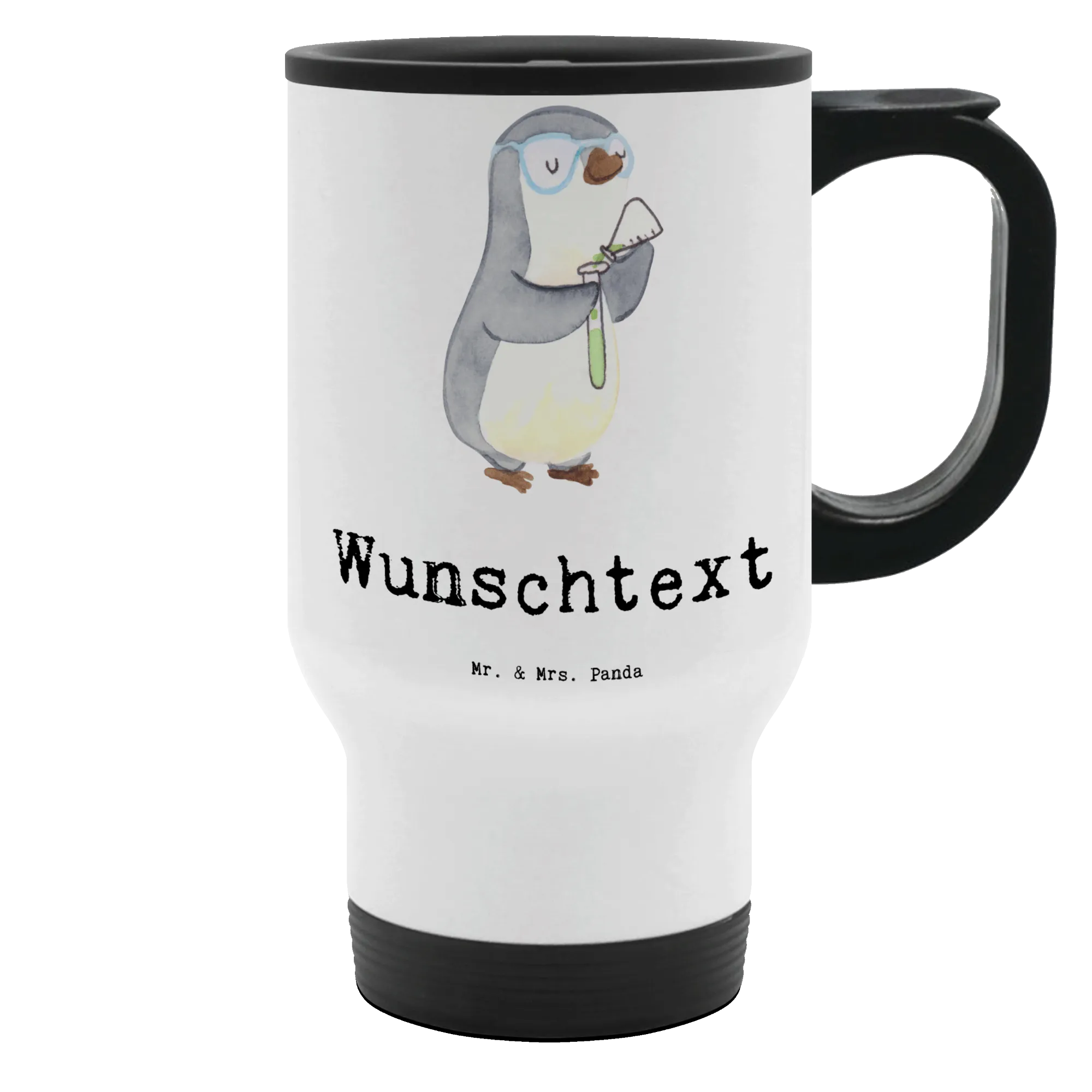 Der personalisierte Thermobecher "Chemiker mit Herz" von Mr. & Mrs. Panda ist das perfekte Geschenk für Chemiker, Chemielaboranten und Wissenschaftler! Mit einem niedlichen Pinguin-Motiv, der ein Reagenzglas hält, und dem witzigen Spruch "Du bist nur ein halber Mensch, wenn du kein Chemiker bist", wird dieser Becher schnell zum Lieblingsbegleiter für jeden Koffeinliebhaber in der Laborumgebung oder während des Studiums.
