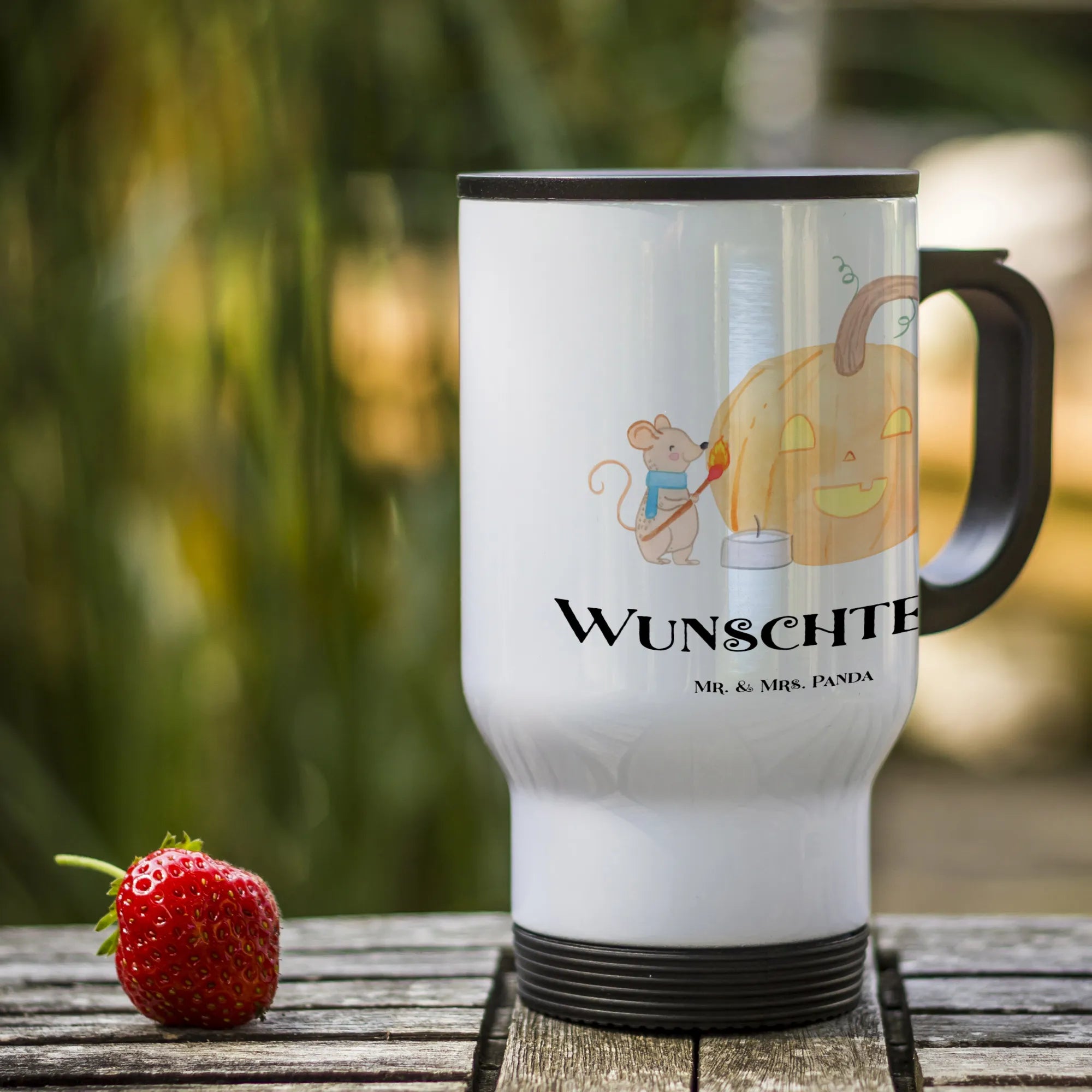 Der personalisierte Thermobecher "Kürbis Maus" von Mr. & Mrs. Panda ist das perfekte Geschenk für alle, die die herbstliche Zeit lieben. Mit seinem charmanten Design, das eine fröhliche Maus zeigt, die ganz gespannt vor einem geschnitzten Kürbis steht, bringt er nicht nur zu Halloween Freude in den Alltag, sondern macht auch an grauen Regentagen gute Laune.