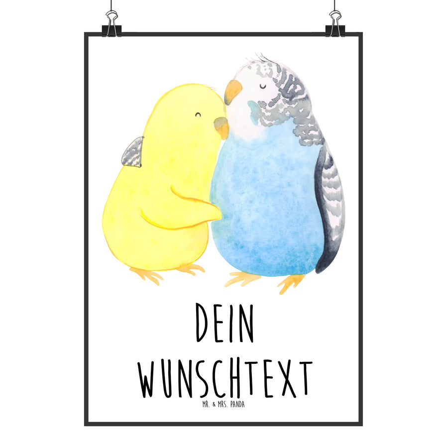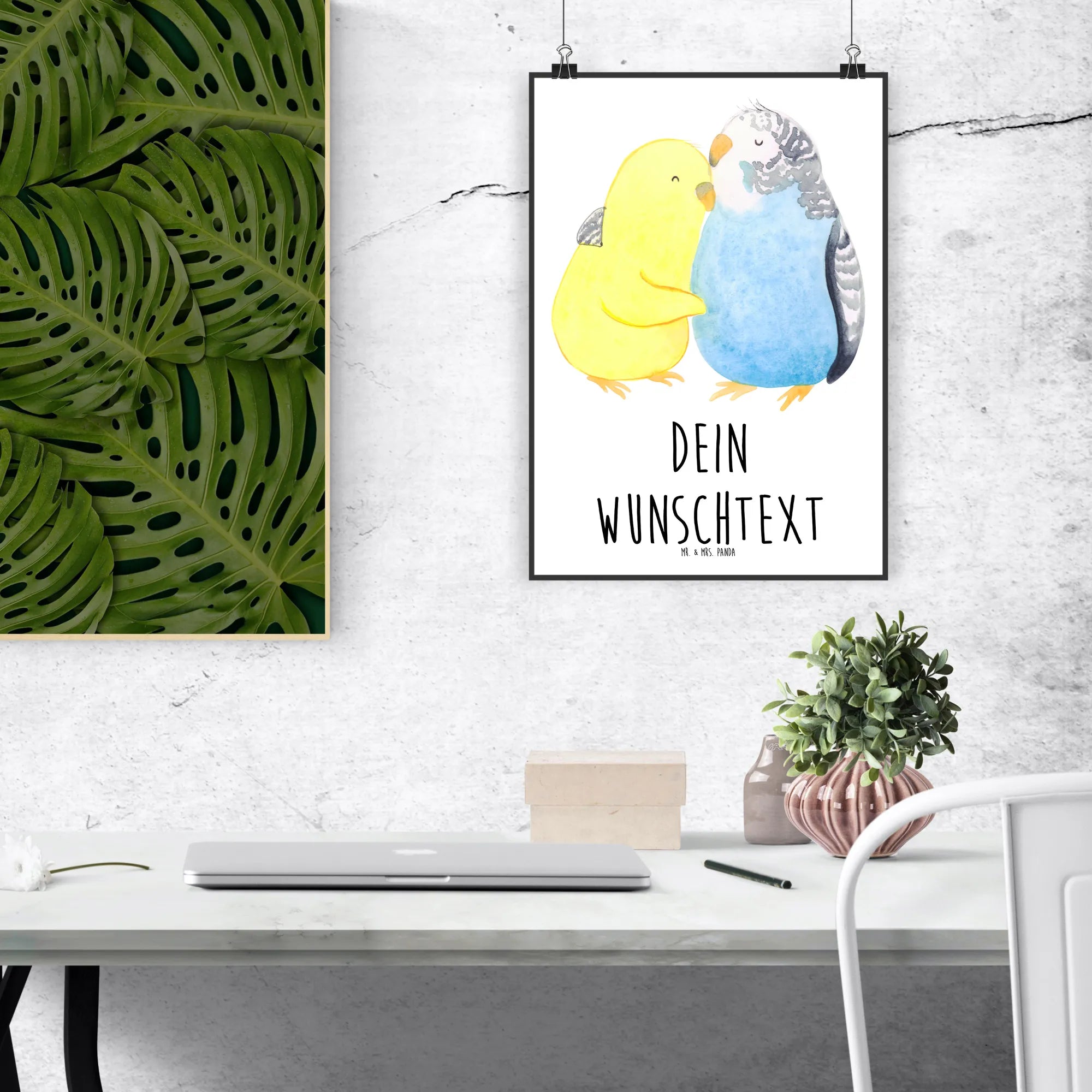 Du liebst es, deinem Zuhause eine persönliche Note zu verleihen? Dann ist unser personalisiertes Poster "Wellensittich Liebe" aus der liebevollen Kollektion von Mr. & Mrs. Panda genau das richtige für dich! Auf diesem einzigartigen Wandposter siehst du ein süßes Paar Wellensittiche, die sich zärtlich aneinander kuscheln. Dieser Anblick strahlt Wärme und Verbundenheit aus – perfekt, um die Liebe in deinem Zuhause sichtbar zu machen.