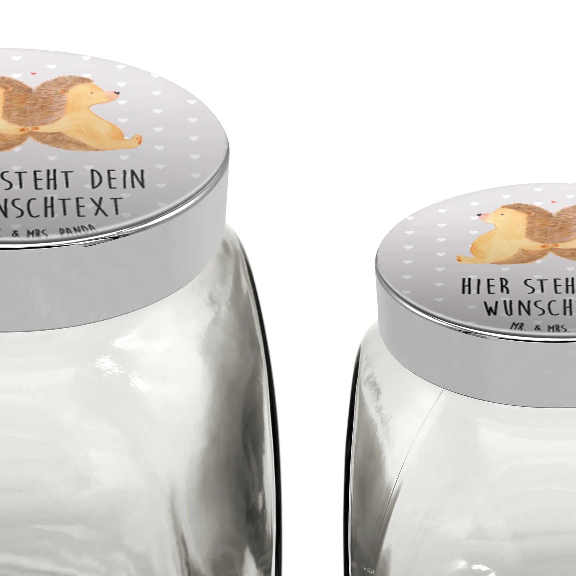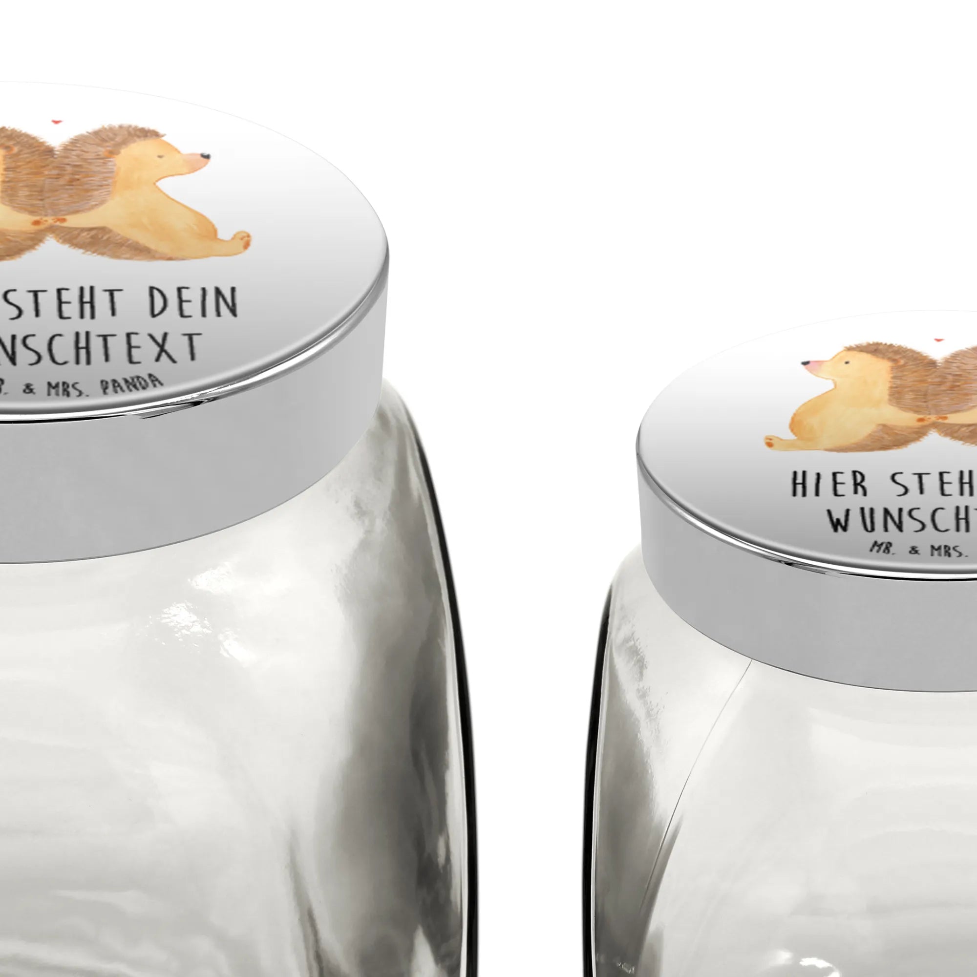 Das personalisierte Bonbonglas mit dem süßen Motiv "Igel händchenhaltend" aus der liebevollen Kollektion von Mr. & Mrs. Panda ist das perfekte Geschenk für Paare und Verliebte!