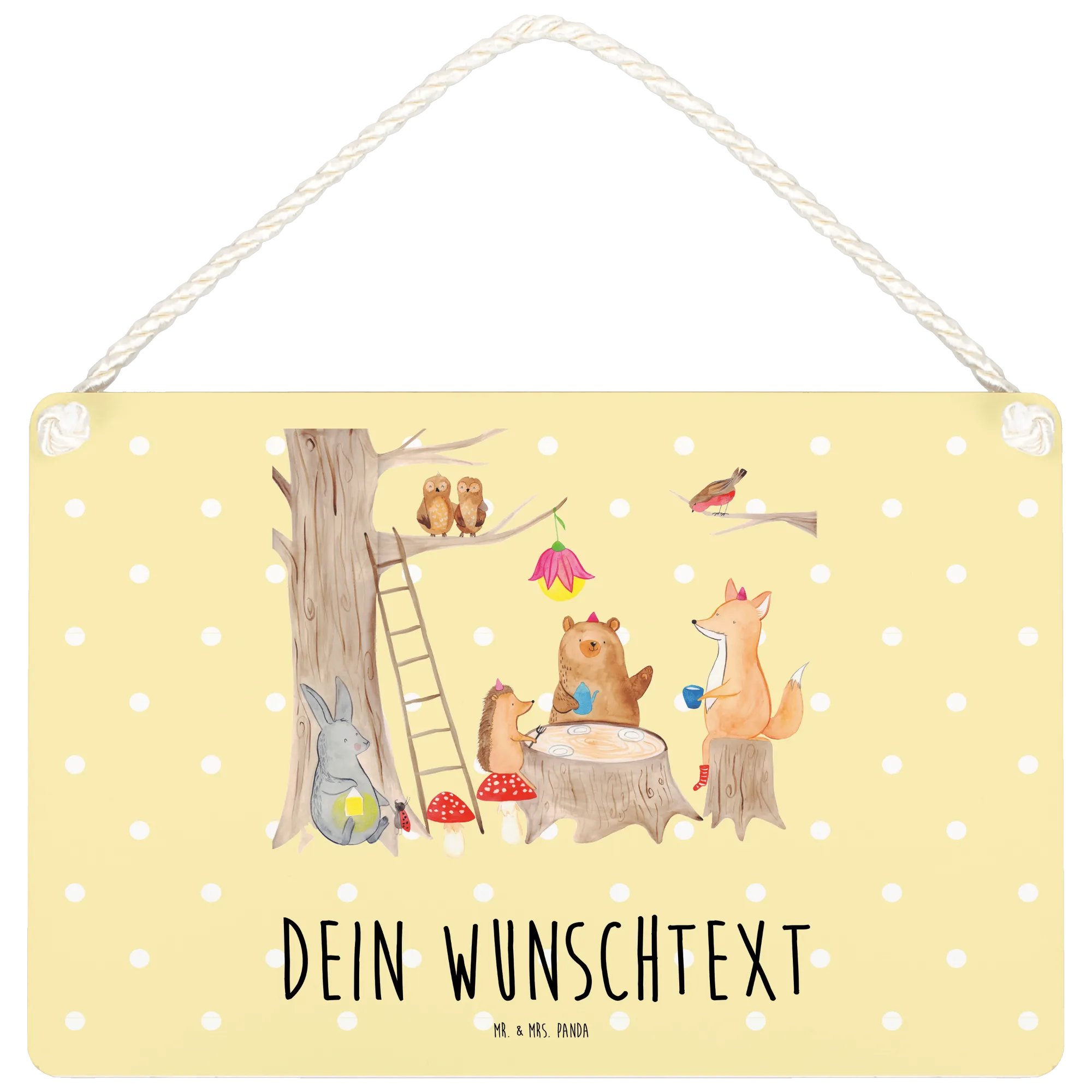 Das Schild zeigt die niedlichen Waldtiere, die zusammen ein zauberhaftes Picknick im Wald genießen. Die liebevoll gezeichneten Füchse, Eichhörnchen, Hasen und viele andere Freunde aus dem Wald machen es schwer, sich nicht in diese fröhliche, entspannte Atmosphäre entführen zu lassen.