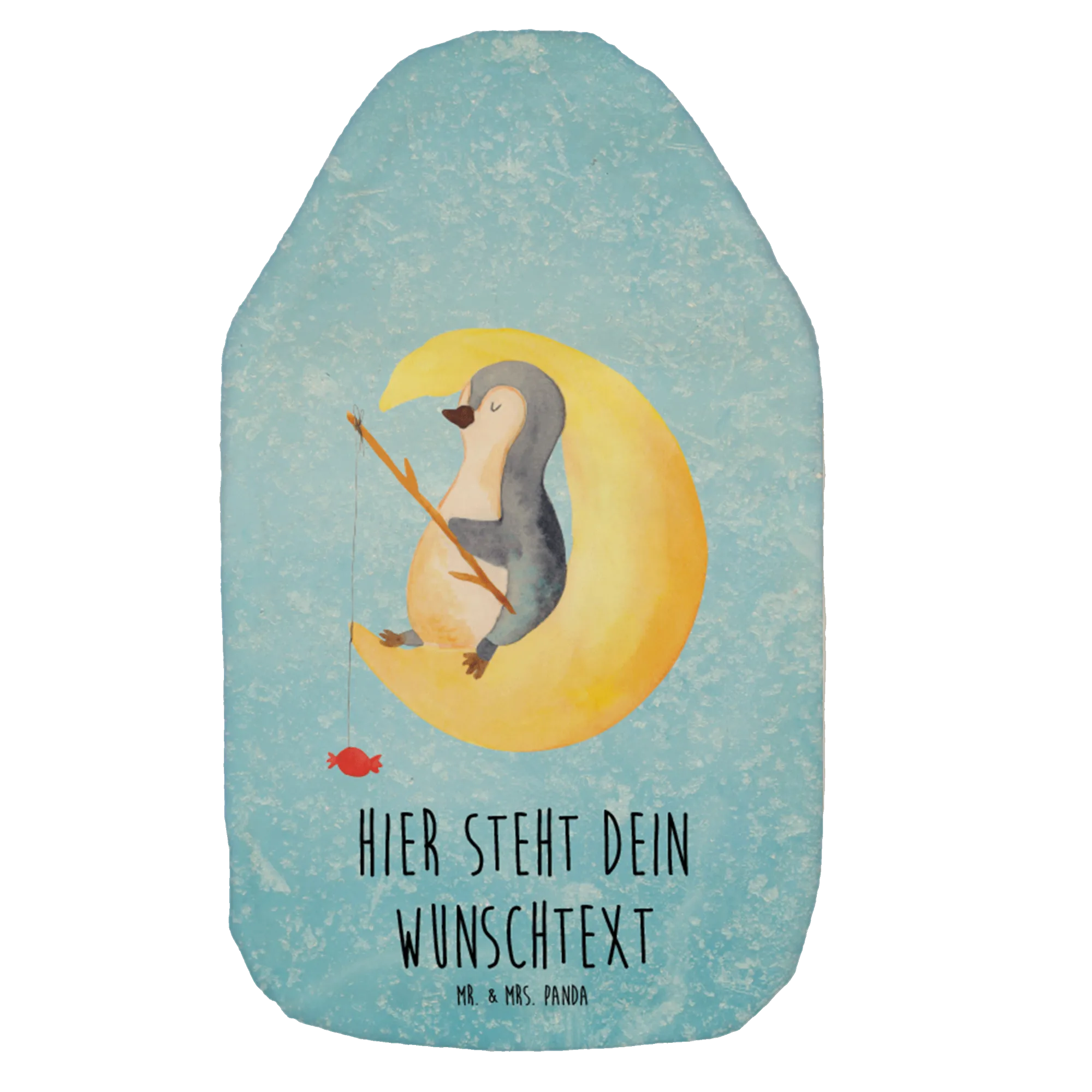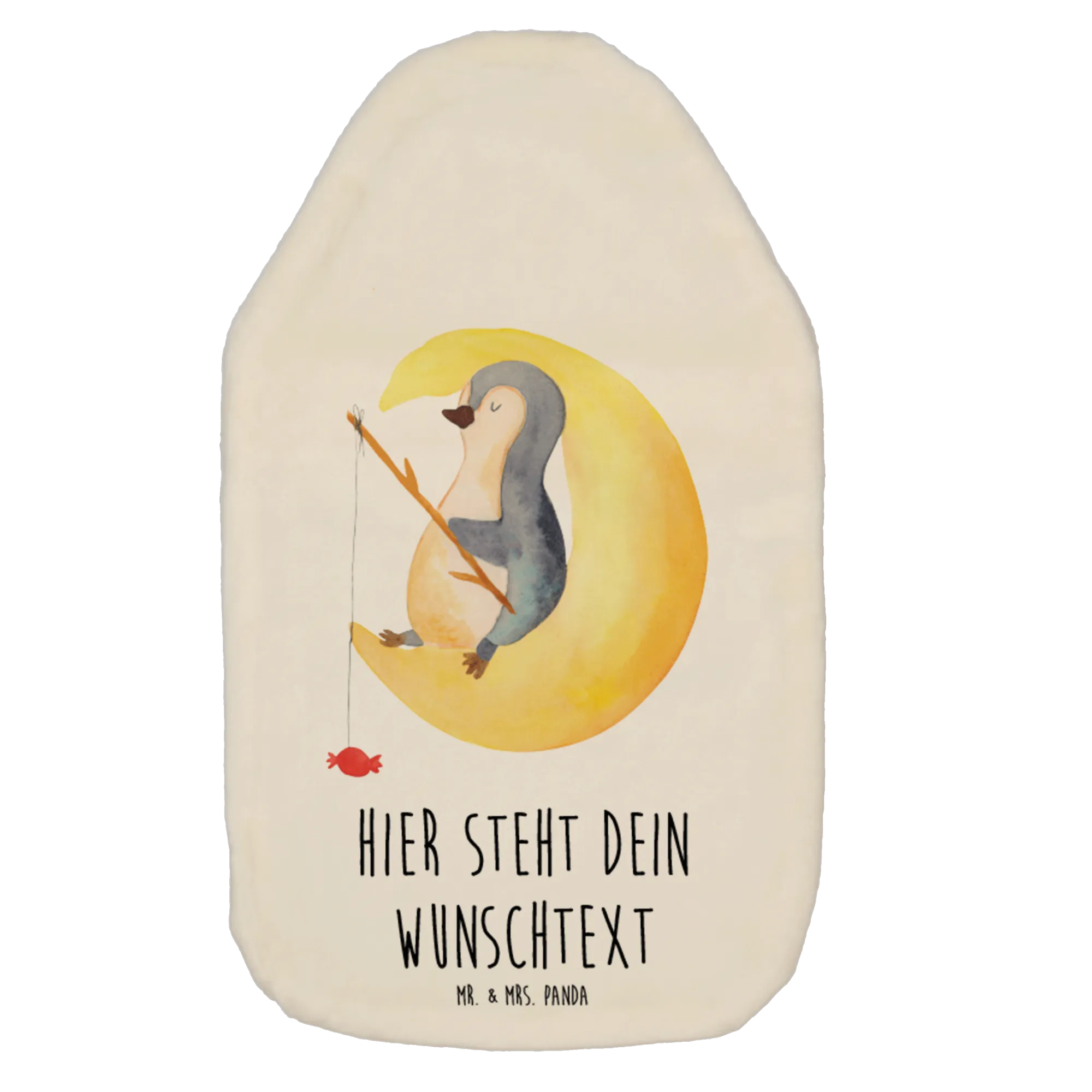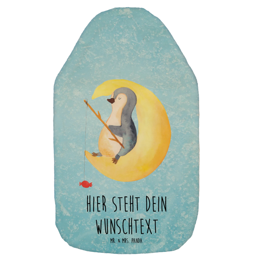 Wärme, Geborgenheit und ein Augenzwinkern – die personalisierte Wärmflasche "Pinguin Mond" aus der Pinguin - Kollektion von Mr. & Mrs. Panda ist das perfekte Geschenk für Kinder und alle, die Kuscheligkeit lieben. Ein süßer Pinguin hat es sich auf einer Mondsichel gemütlich gemacht und angelt nach Sternen – an der Angel hängt ein Bonbon. Das liebevoll handgezeichnete Motiv kombiniert sich mit dem lustigen Spruch „Ich und mein Körper wollen schlafen, aber mein Kopf will wissen, ob Pinguine Knie haben...“ und sorgt für Schmunzeln beim Einschlafen. 🌙