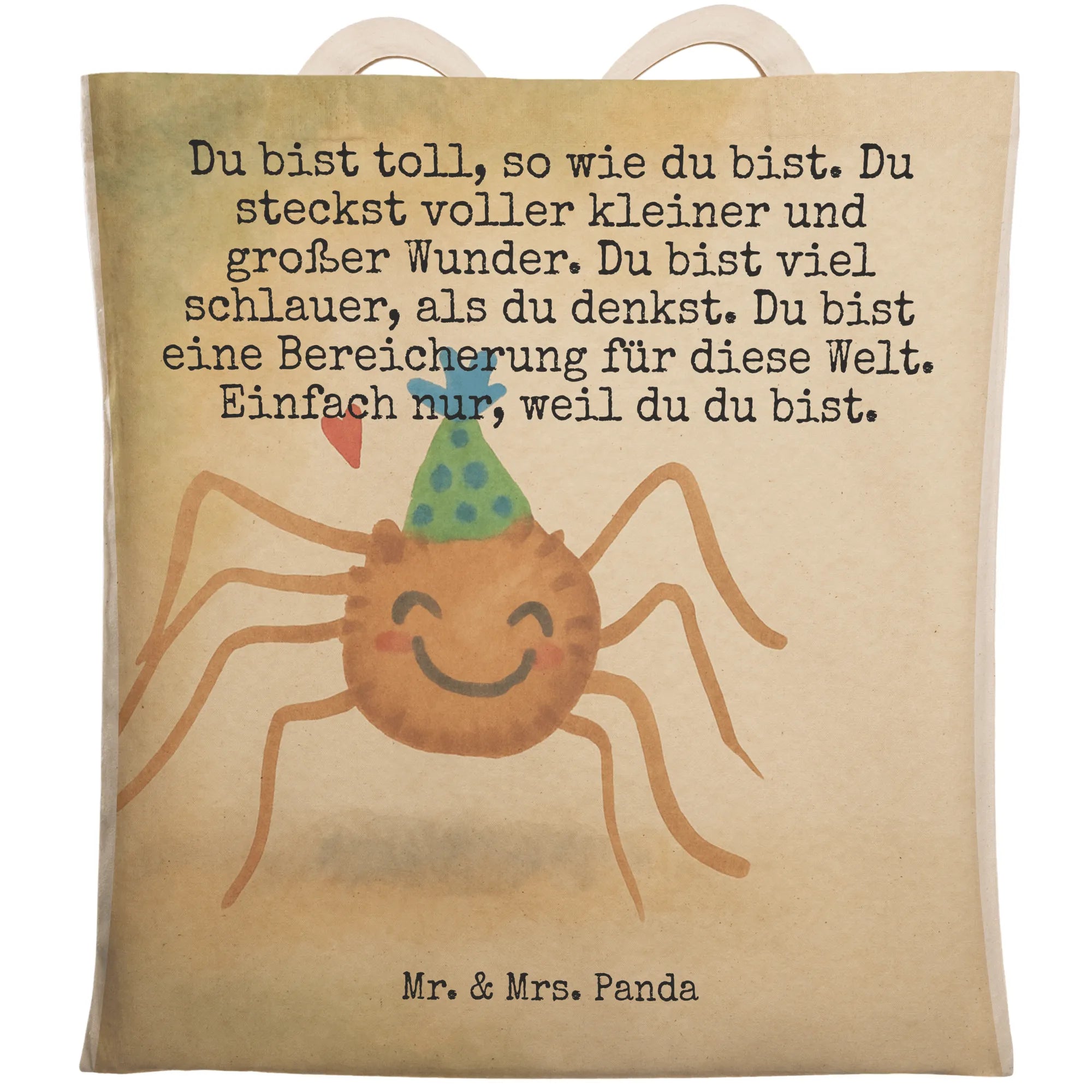 Begegne der Welt mit einem Lächeln: Die Einkaufstasche "Spinne Agathe Party" aus der liebevollen Spinne Agathe Kollektion von Mr. & Mrs. Panda ist mehr als nur eine Tragetasche. Das handgezeichnete Motiv zeigt die fröhliche Spinne Agathe im Partyhut mit einem kleinen Herzchen – ein echter Blickfang als Stofftasche für Alltag, Uni, Arbeit oder Strand.