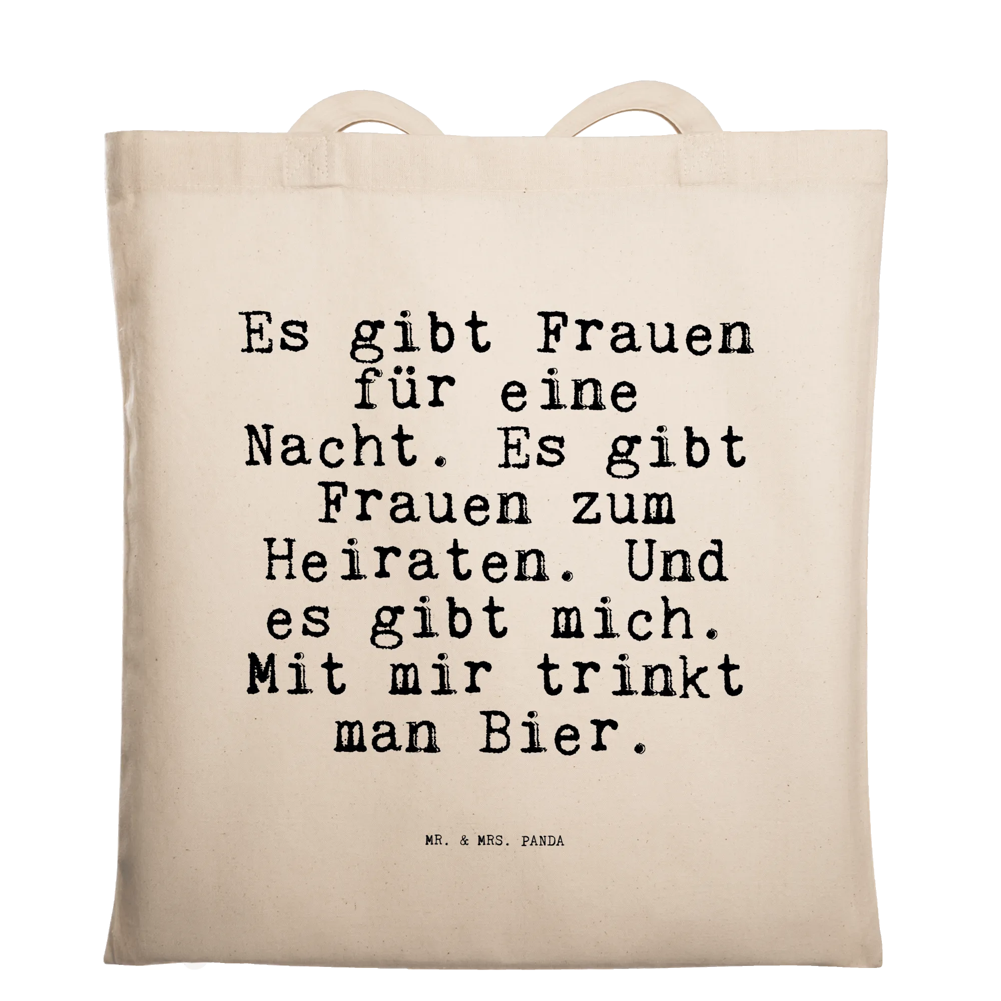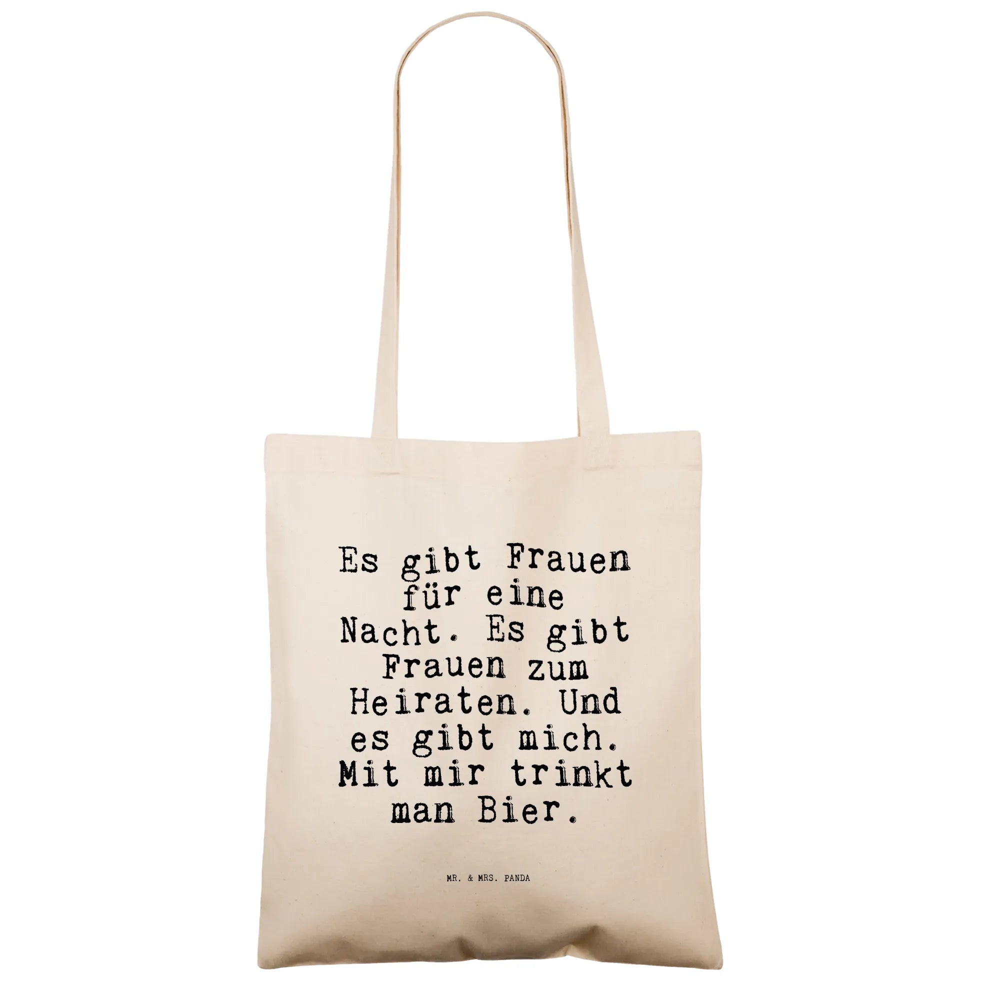 Unsere Tragetasche mit dem kultigen Spruch „Es gibt Frauen für eine Nacht. Es gibt Frauen zum Heiraten. Und es gibt mich. Mit mir trinkt man Bier.“ aus der Spruchreif Kollektion von Mr. & Mrs. Panda ist das ideale Geschenk für deine Freundin, Schwester oder die beste Kumpeline. Diese Jutetasche ist ein Statement-Beutel, der bei jedem Einkauf, beim Strandbesuch oder beim Bierabend für Lacher sorgt.