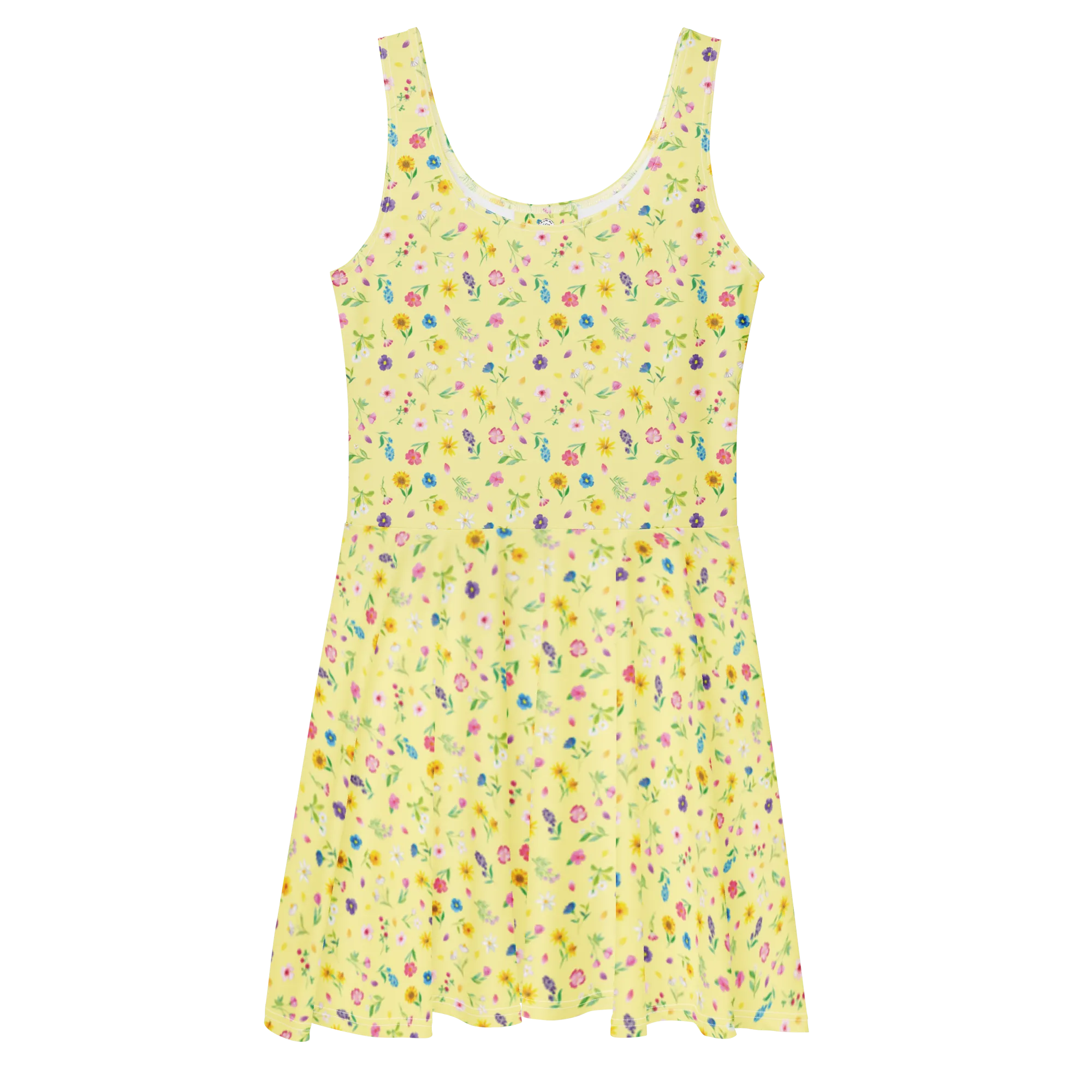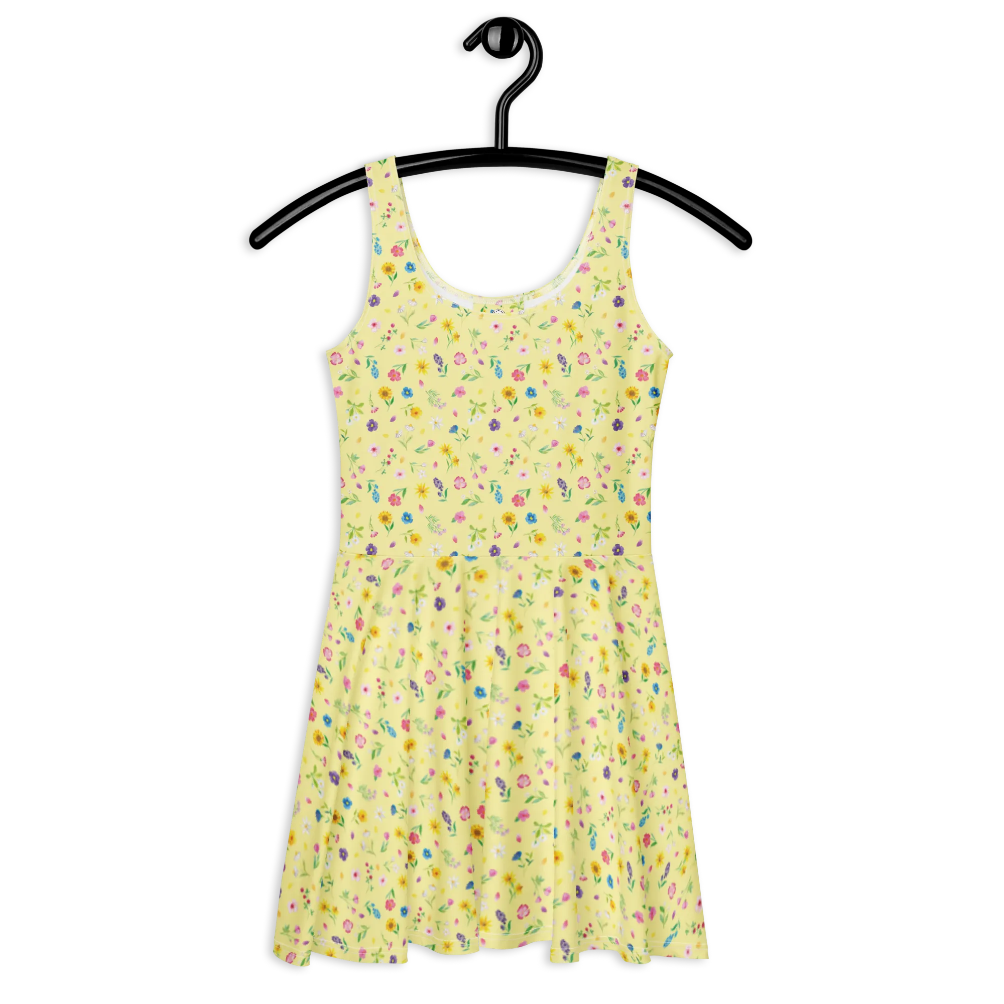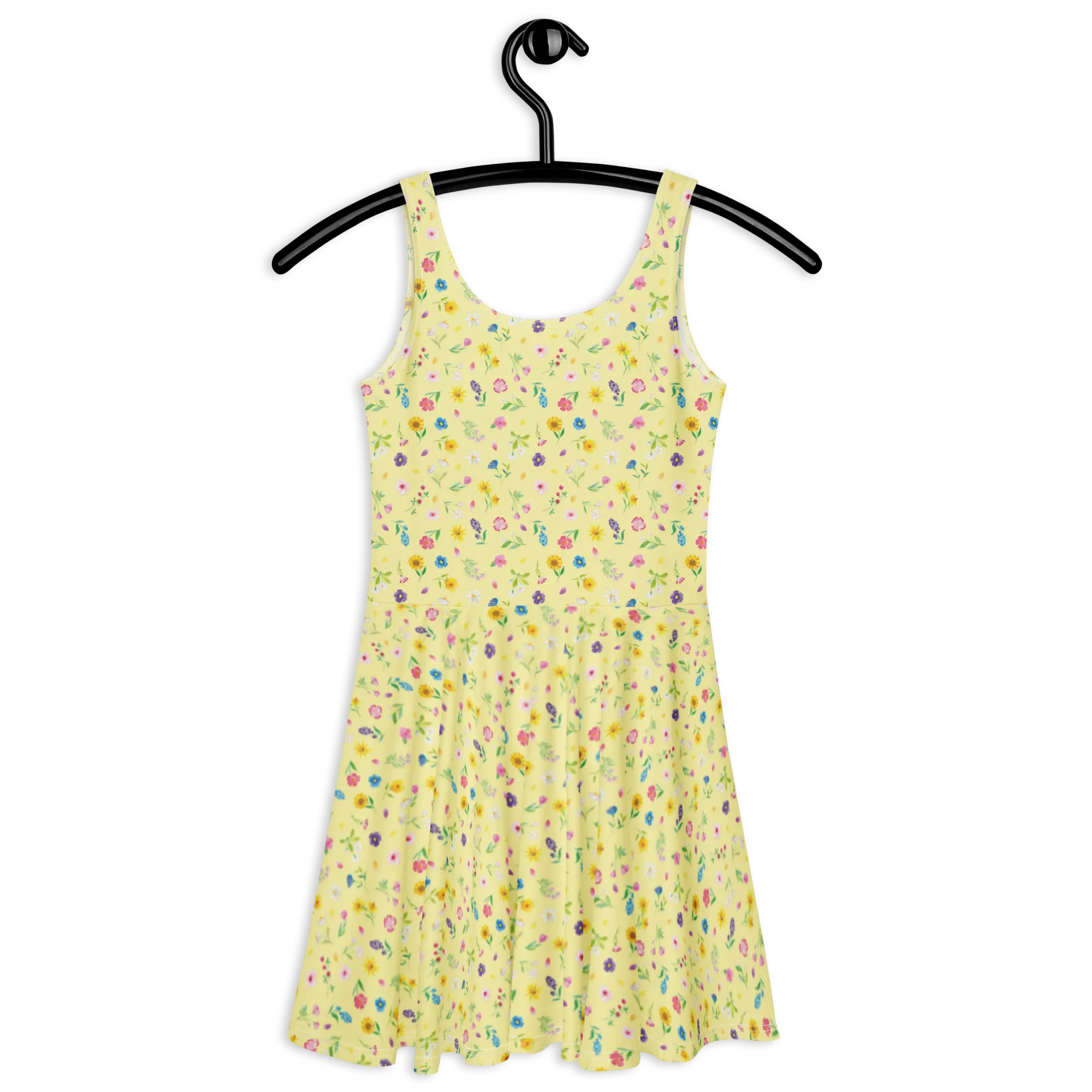 Dieses fröhliche Skaterkleid verbindet Flower Power mit feminine Leichtigkeit. Das gelbe Kleid mit filigranem Blumenmuster erinnert an eine blühende Blumenwiese und bringt sofort Sonne in Deinen Alltag. Perfekt für Sommer, Festivals, Gartenpartys oder als besonderes Geschenk.