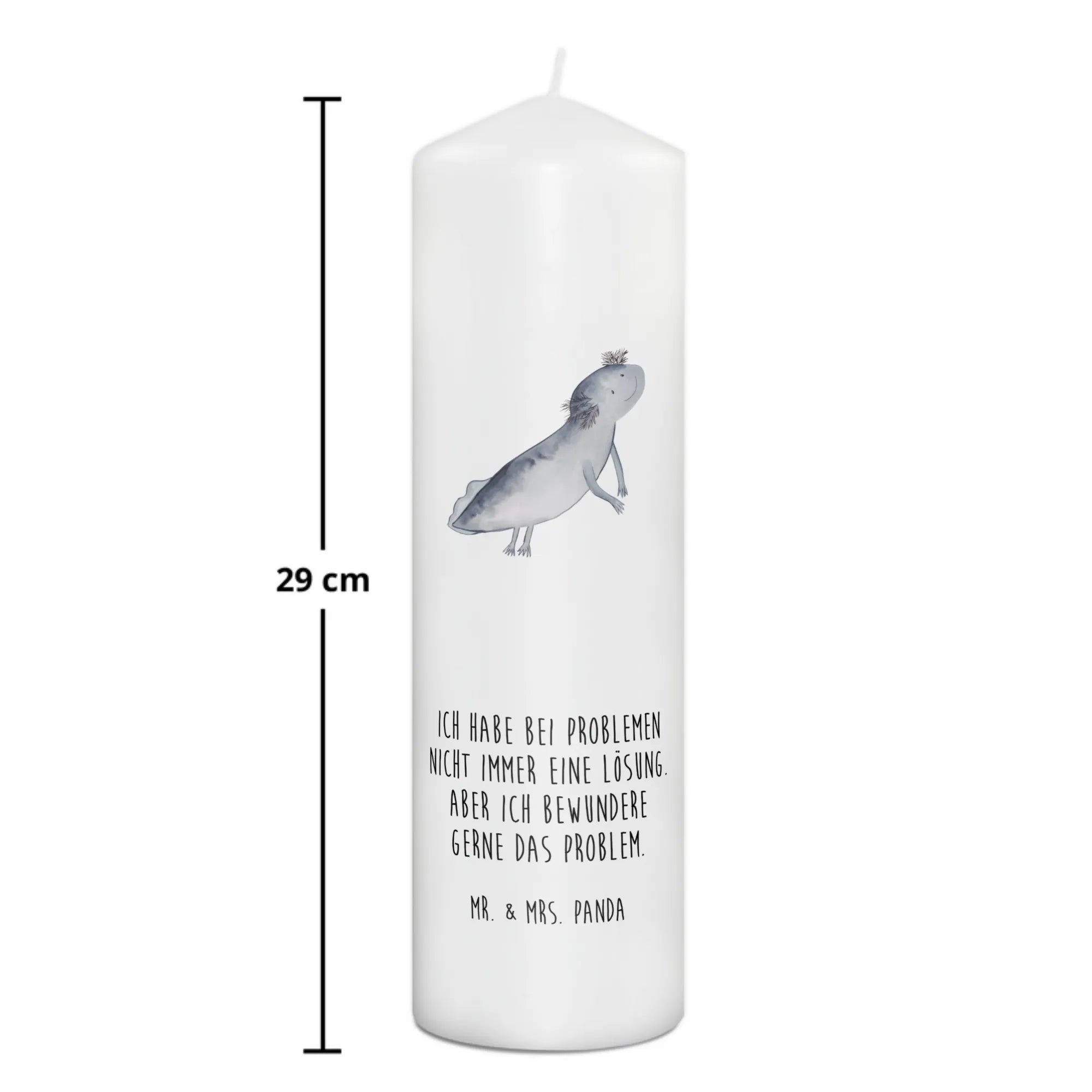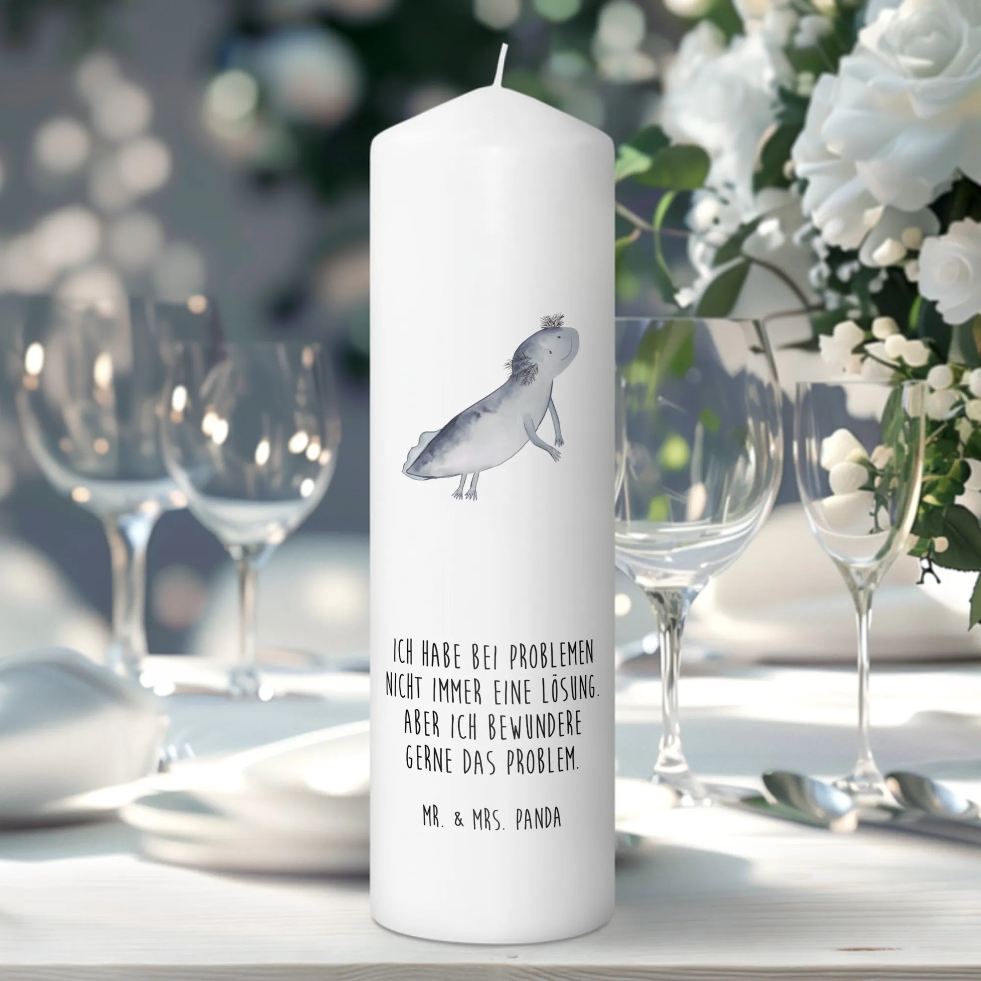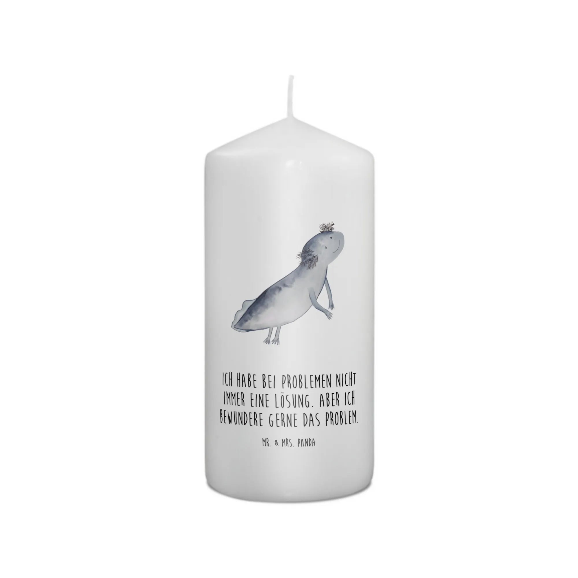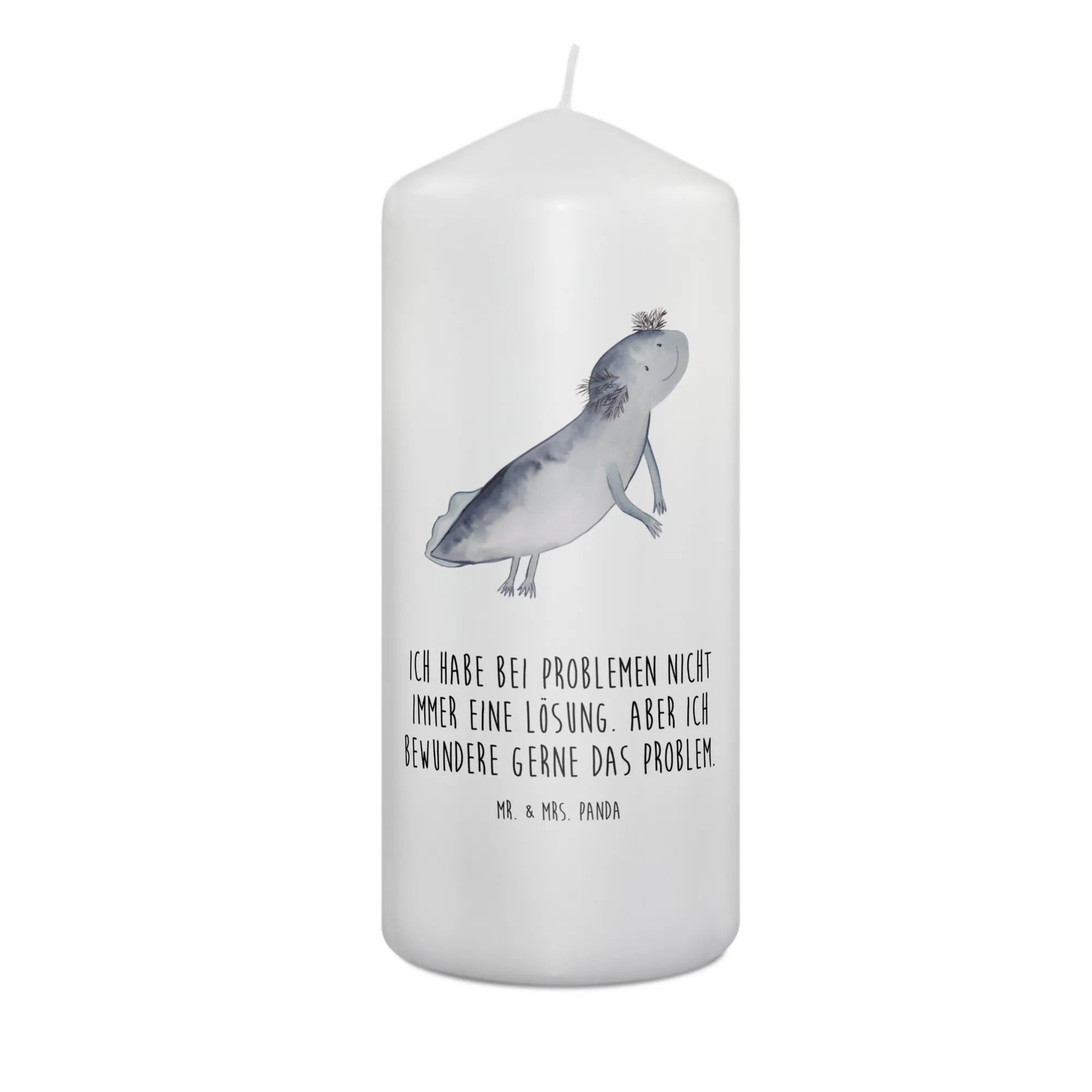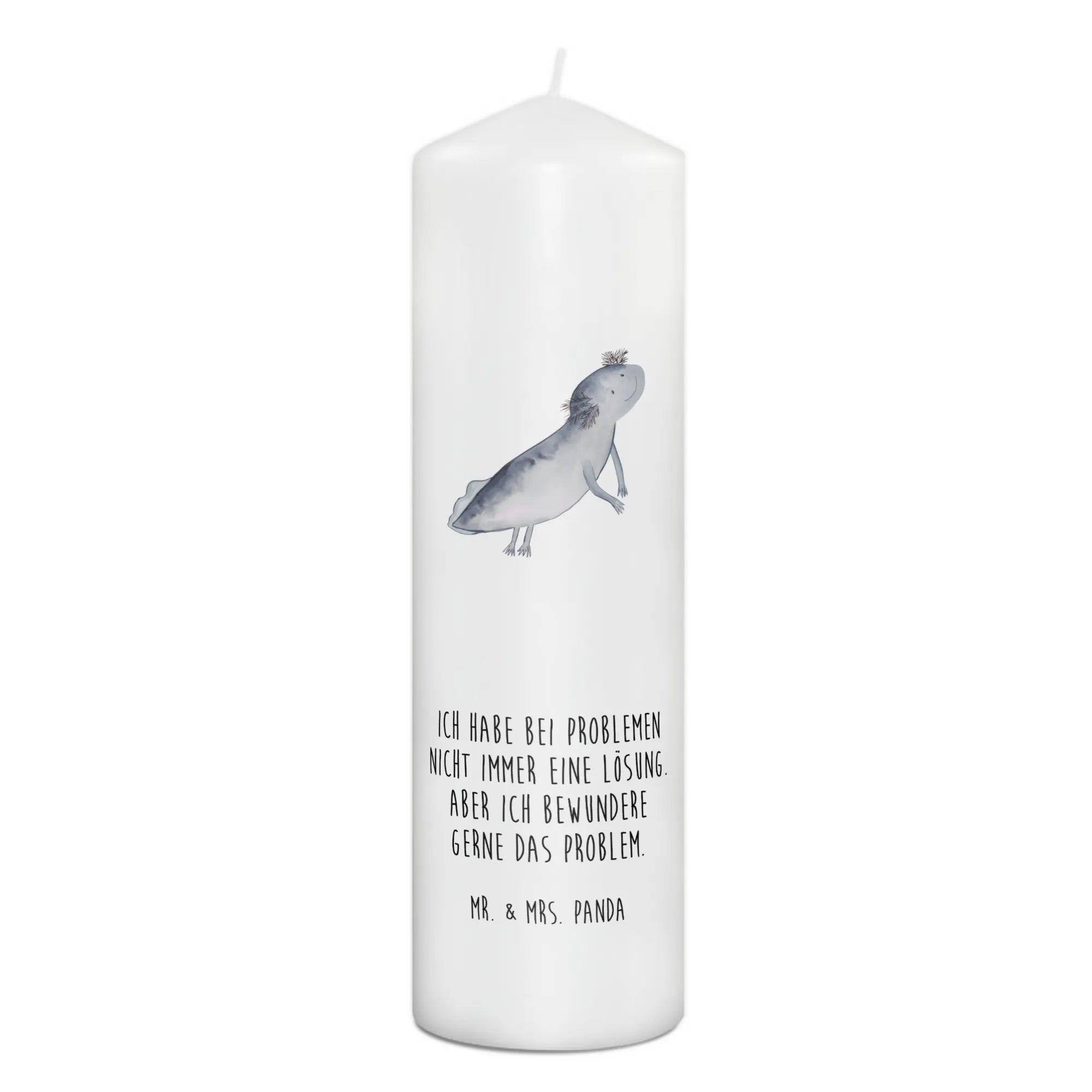 Mit ihrem süßen, schwimmenden Axolotl-Motiv und dem besonderen Spruch "Ich habe bei Problemen nicht immer eine Lösung. Aber ich bewundere gerne das Problem." begeistert diese Taufkerze, Kommunionskerze oder Geburtstagskerze Groß und Klein.